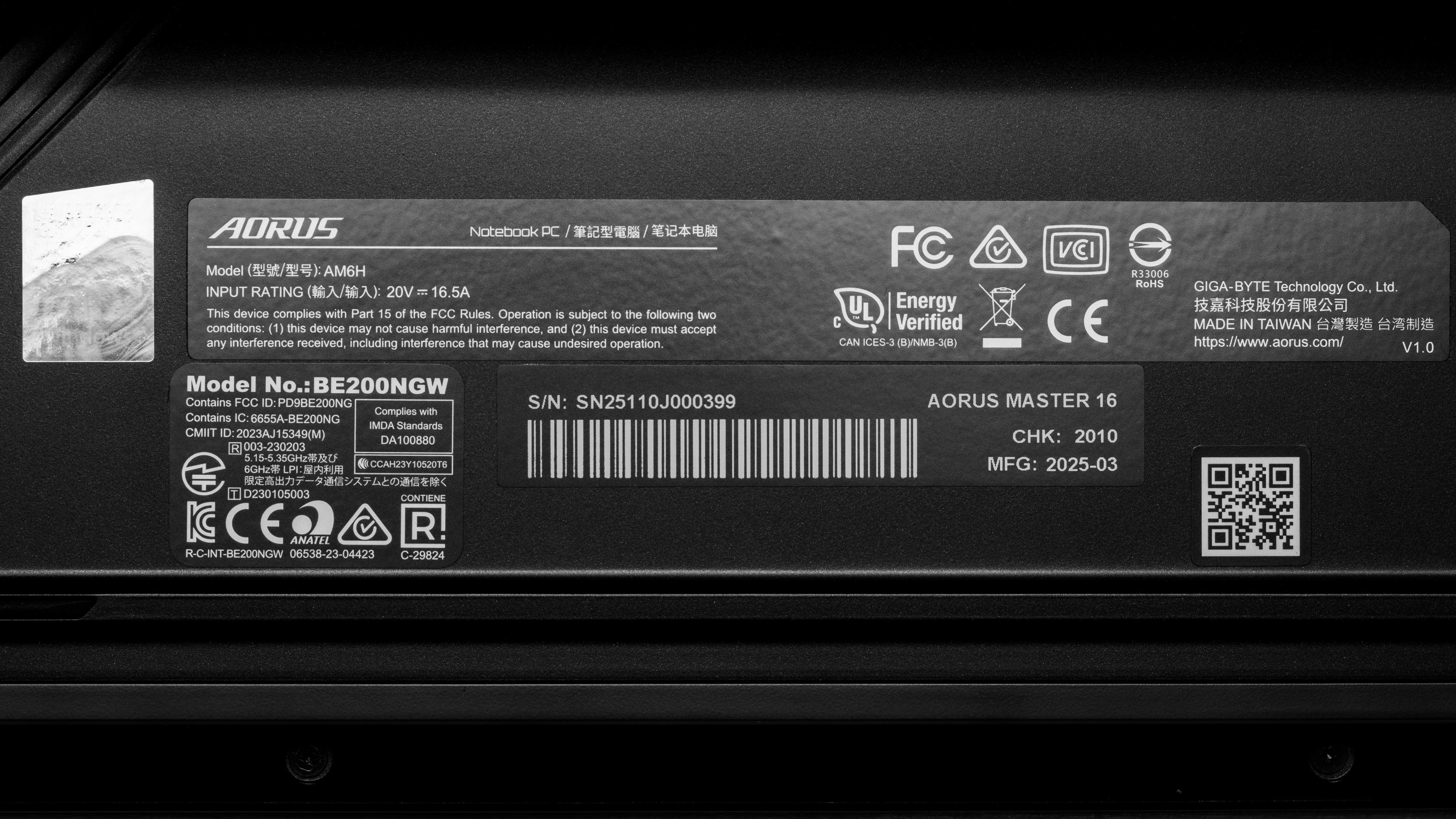 We tested the Gigabyte AORUS MASTER 16 (model AM6H) with an Intel Core Ultra 9 275HX CPU, an NVIDIA GeForce RTX 5080 Laptop GPU, 32GB of RAM, and 1TB of storage. The GPU, memory, and storage are configurable; the available options are below.