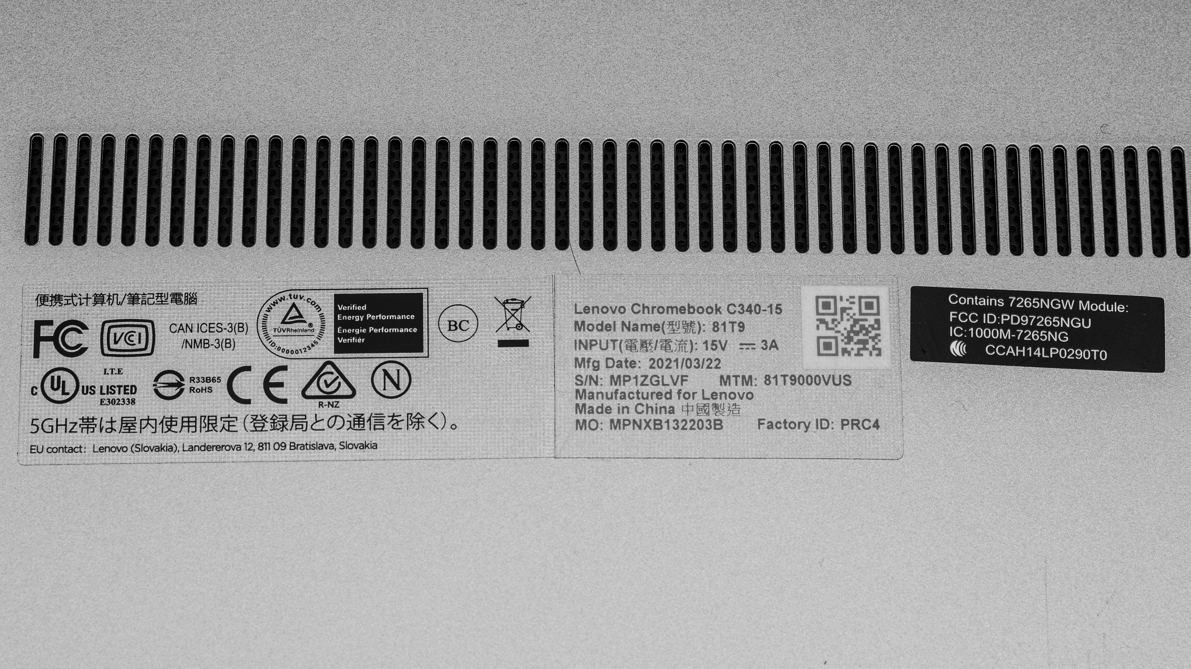 We tested the Lenovo Chromebook C340-15 (model 81T9000VUS) equipped with a 15.6 inch display, an Intel Core i3-8130U with integrated UHD Graphics 620, 4GB of RAM, and 64GB of storage. The CPU and the storage are configurable; you can see the options in the table below. There's an 11 inch Chromebook C340 (C340-11), but it's very different in design and specifications, so we consider it a separate model. This review only applies to variants with a model number that starts with '81T9'.