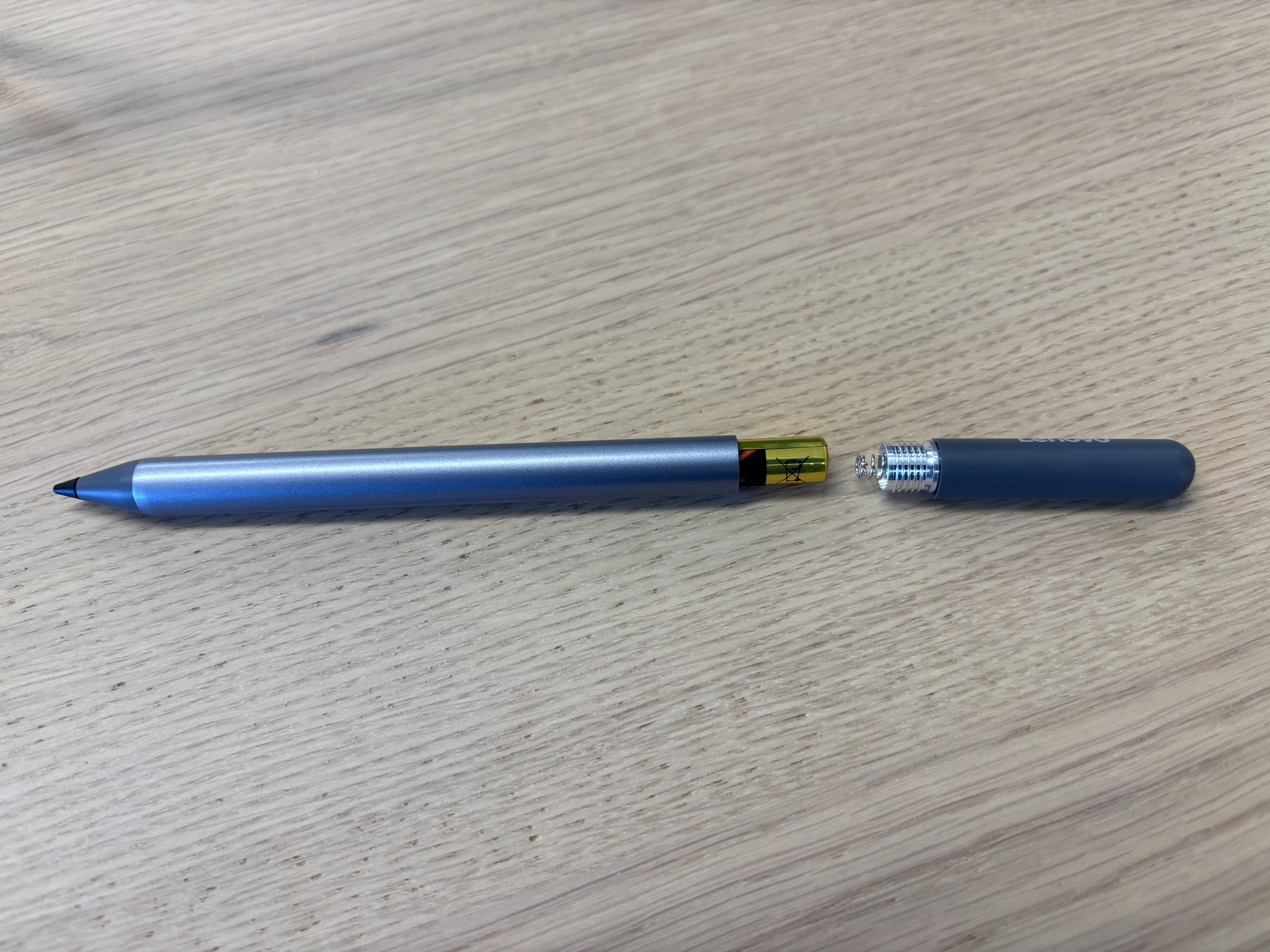 The Lenovo Duet 11 Chromebook supports pen input. However, you may have to purchase the pen separately, depending on the region and retailer. Models that include the pen come with a Lenovo USI Pen 2 that uses a replaceable AAAA battery. If you buy the pen separately, you can also get the Lenovo USI Pen 2 with a built-in rechargeable battery. Both support 4096 levels of pressure sensitivity and tilt. The groove and magnets on the back of the device hold the stylus securely during transport. See more information about the included stylus on Lenovo's site.