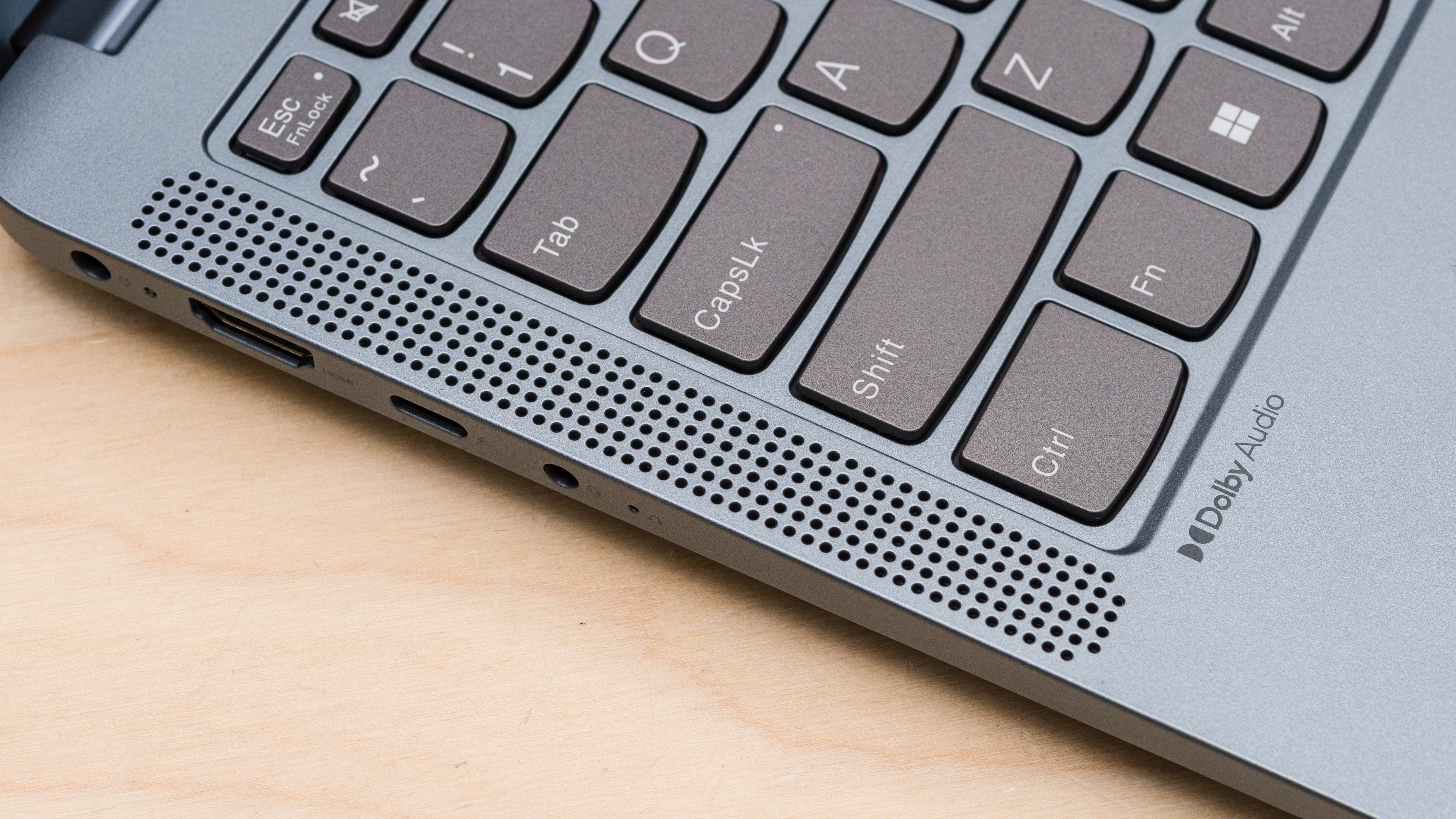 The Lenovo Flex 5i has a great port selection. The two USB-A ports support USB 3.2 Gen 2 data transfer speed (up to 10 Gbps). The one closest to the back of the device has an Always-On function, meaning you can use it to charge a mobile device, even when the laptop is in Sleep mode. The USB-C supports Thunderbolt 4 (up to 40Gbps data transfer speed and video output to two 4k displays at 60Hz), DisplayPort 1.4a, and Power Delivery 3.0. Power Delivery allows for fast charging of mobile devices, up to a maximum of 15W.
