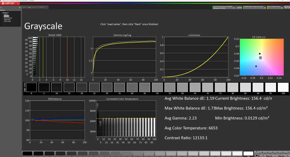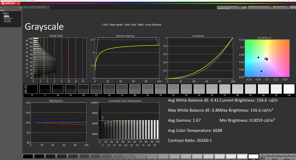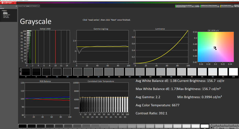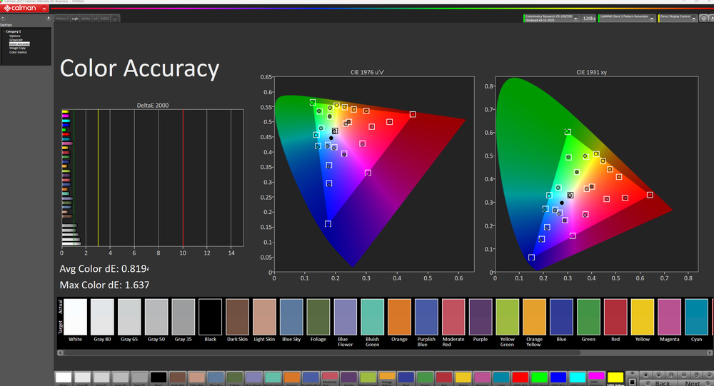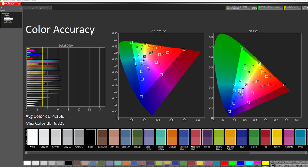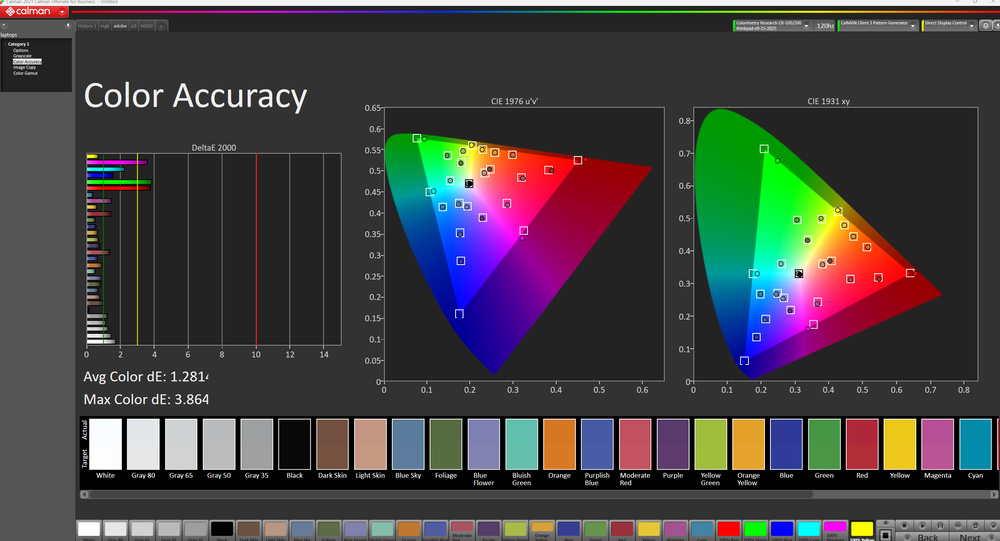 The display's out-of-the-box accuracy is decent. The white balance inaccuracies are relatively minor and hard to spot, and the color temperature is very close to the standard 6500K target. Color accuracy depends on the selected color profile. The display uses the DCI P3 color space when there isn't an active color profile, resulting in a high dE (due to oversaturation). Switching to the Default color profile results in nearly identical measurements. You can set the color profile via the X-Rite Color Assistant app; here are the measurements in the sRGB, DCI P3, and Adobe RGB color profiles: