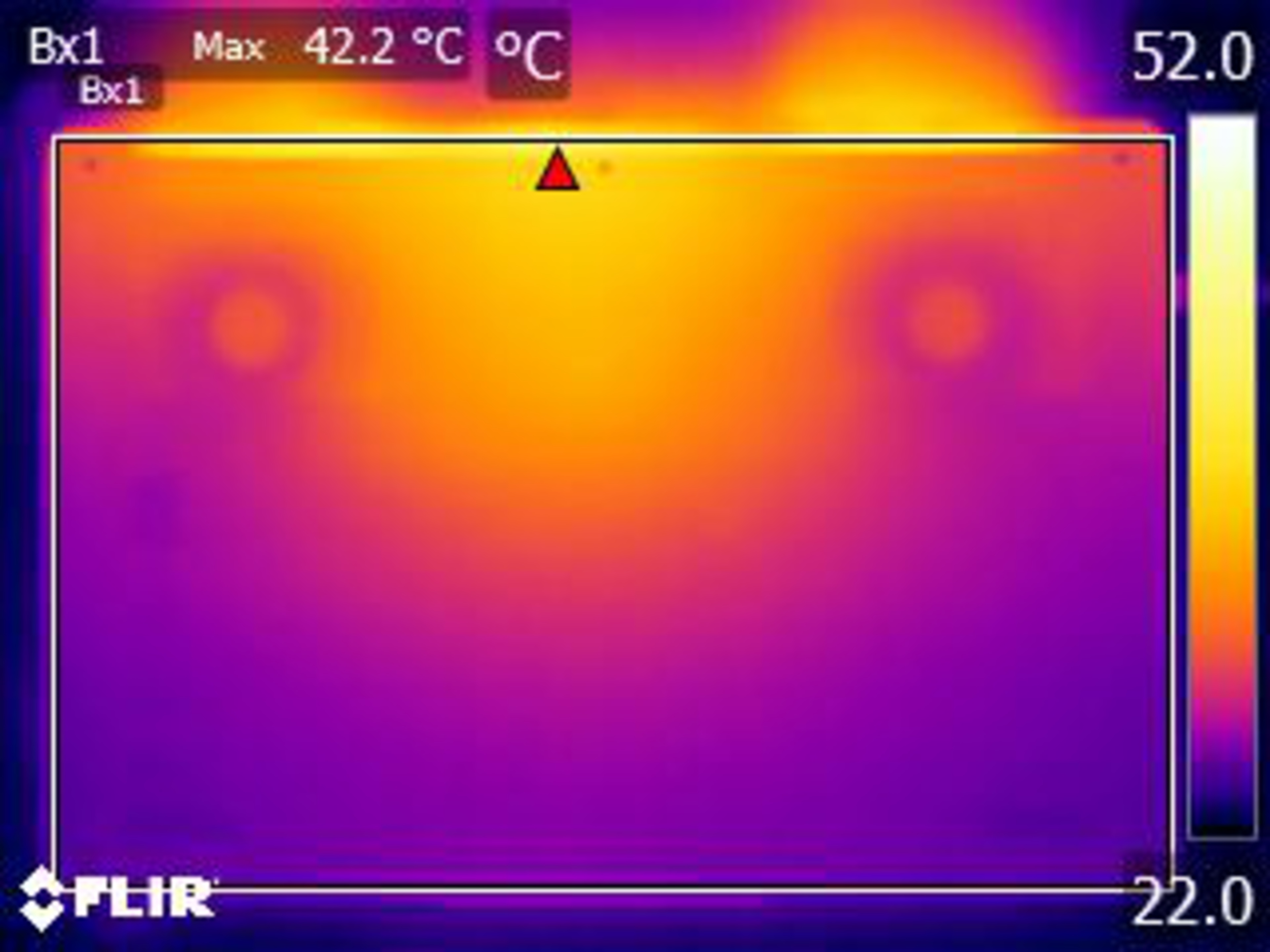 The keyboard is only mildly warm under load, not enough to cause discomfort. Using the laptop on your lap shouldn't be a problem either, as the bottom only reaches 42.2 °C (107.96 °F).