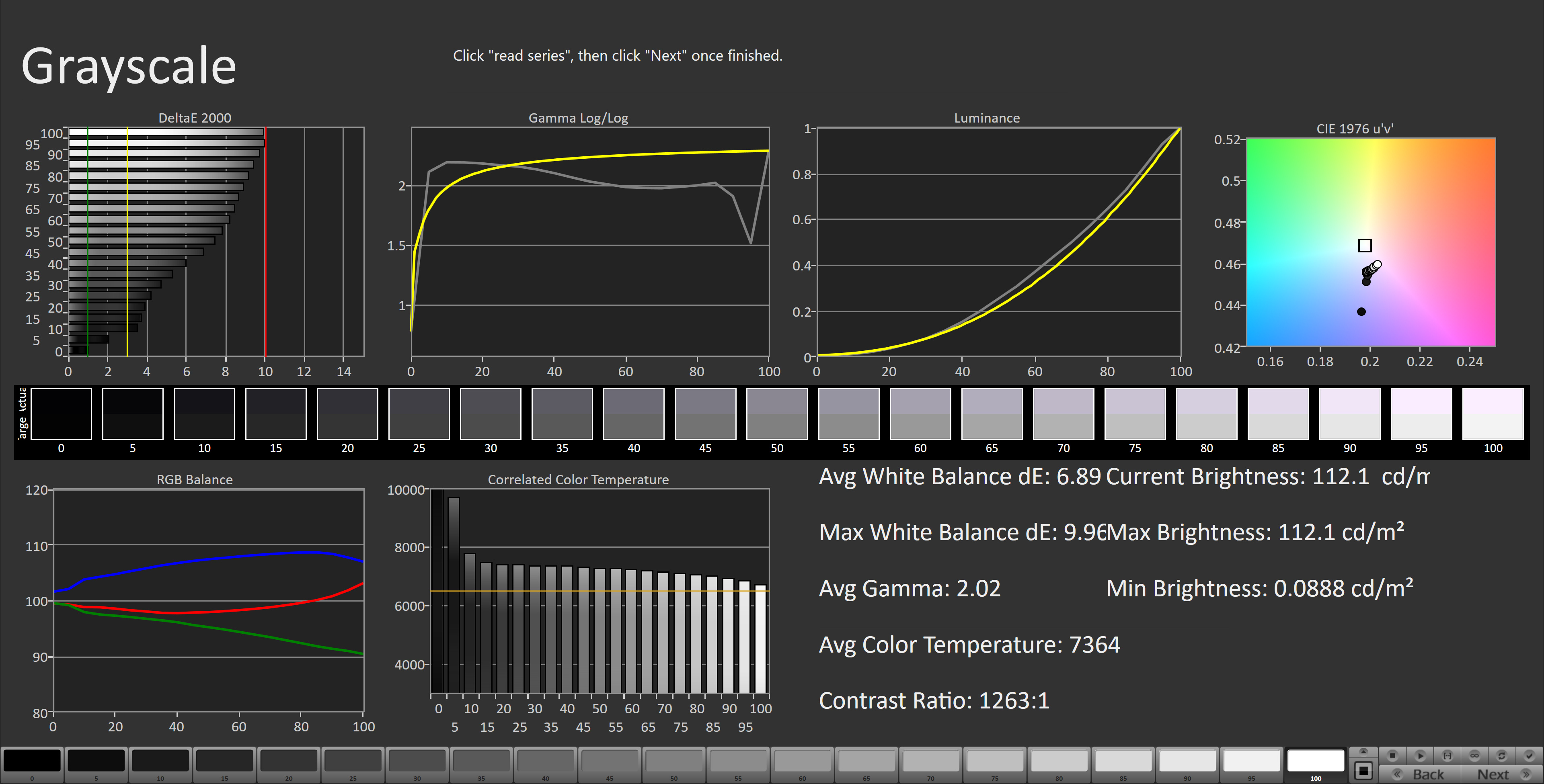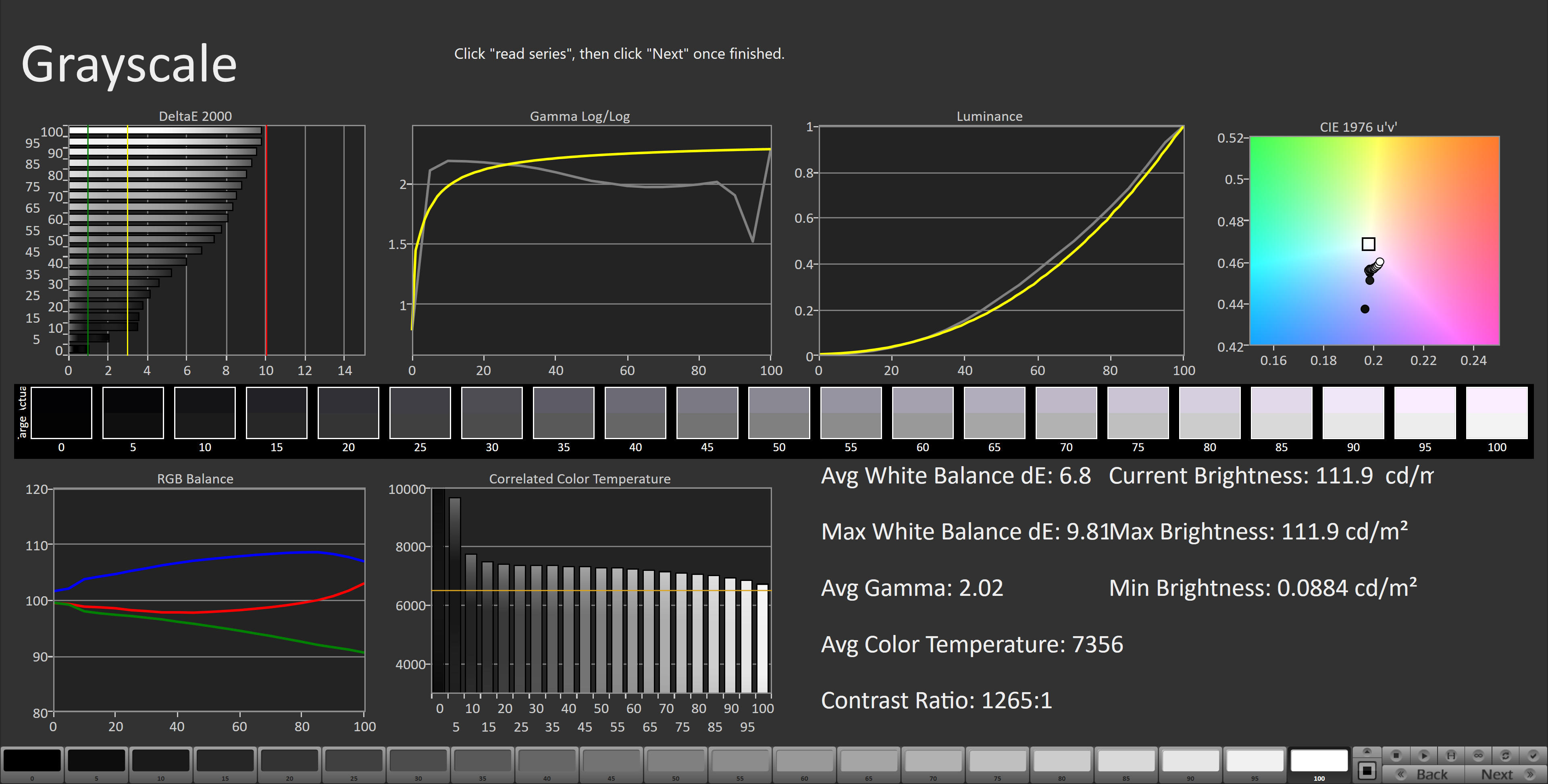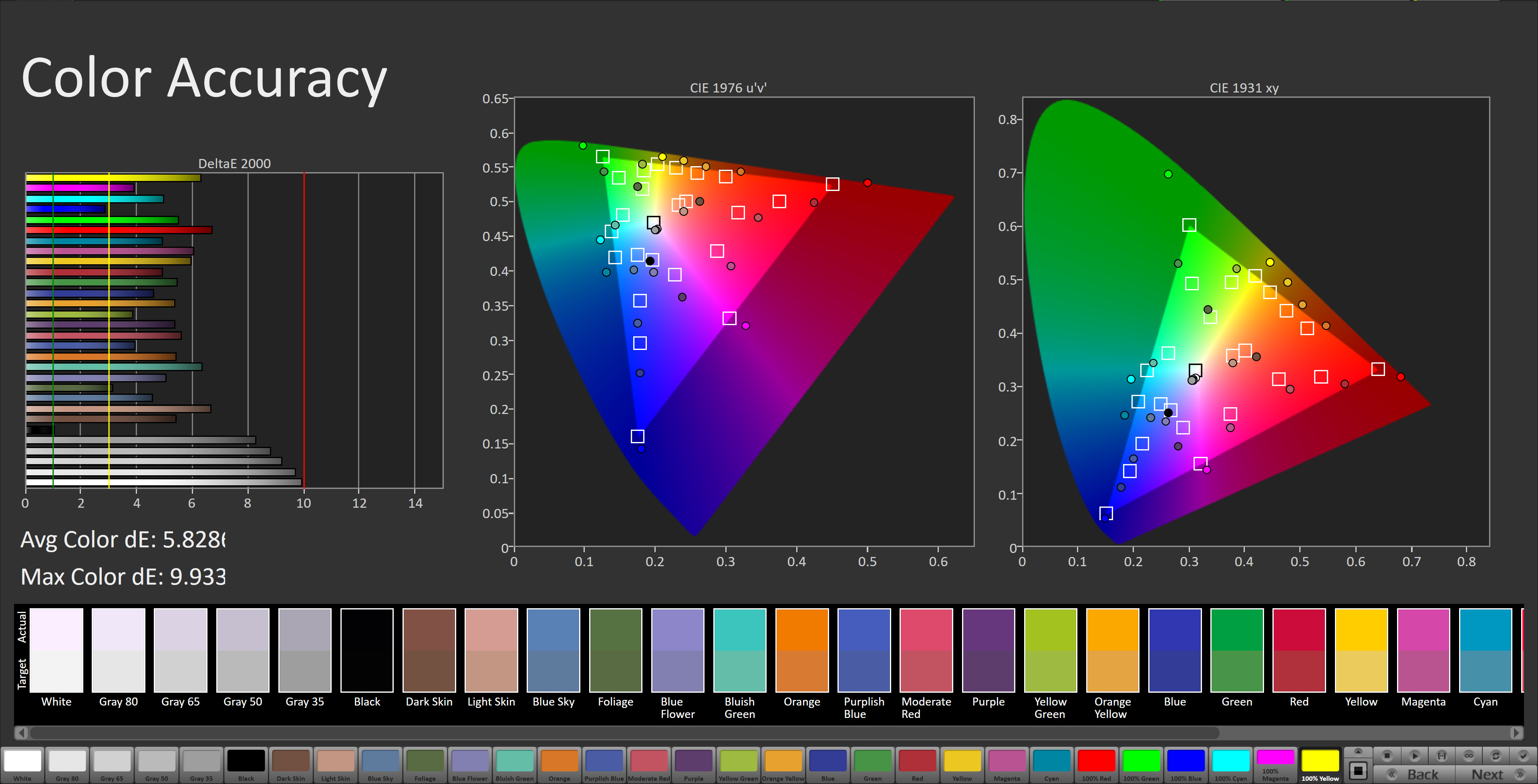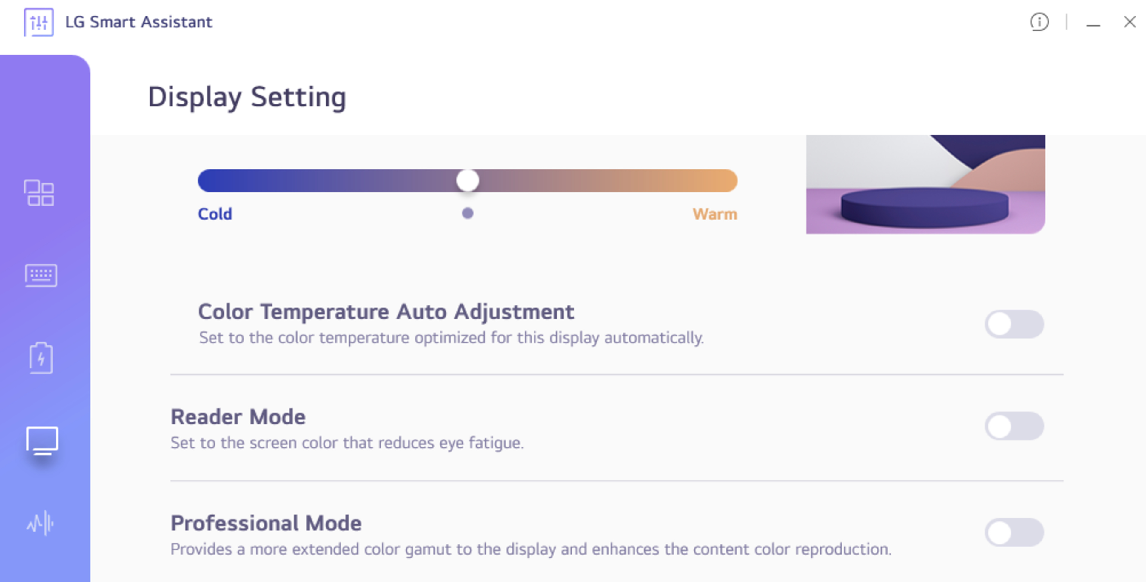 The LG Smart Assistant app has a few display-related settings meant to optimize the display's performance. Of note is a toggle for Color Temperature Auto Adjustment, which purportedly optimizes the color temperature for the particular display panel, and a Professional Mode, which supposedly lets users access a wider color gamut for content creation work. Neither toggle positively impacts the out-of-the-box color accuracy; rather, they make the display's color temperature even colder than before, deepening the already bluish tint. Here are the color accuracy results and grayscale measurements with the Color Temperature Auto Adjustment setting enabled, as well as the color accuracy results and grayscale measurements using the Professional Mode.