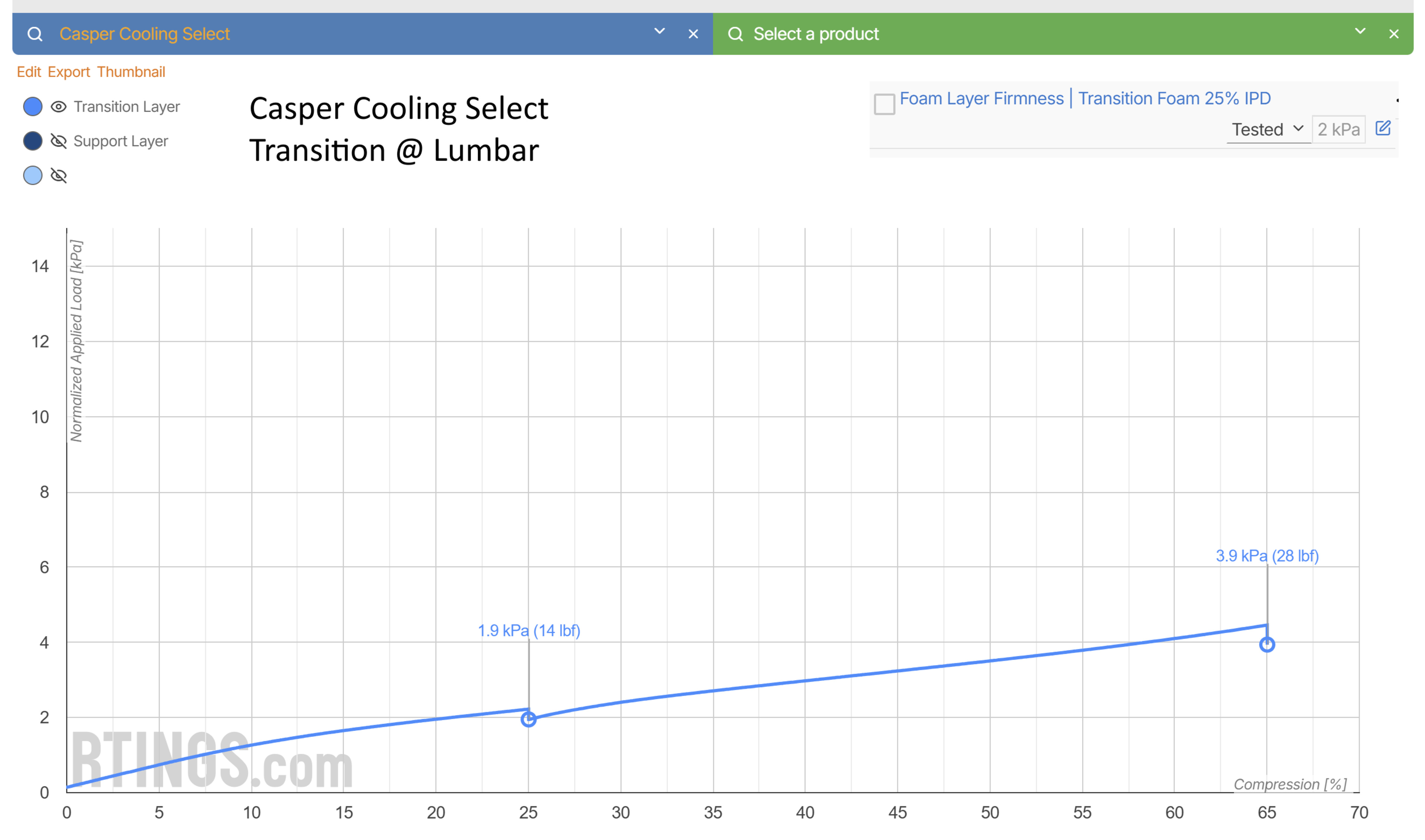 The upper comfort layer is less resilient than typical polyfoam. The manufacturer mentions that this layer is breathable, open-cell foam, but they don't provide more detailed information. Still, this departure from standard polyfoam likely explains this discrepancy. The memory foam lower comfort layer is much less resilient, but this is expected for the material. The zoned transition layer is quite resilient at the head/feet, but less so at the lumbar: