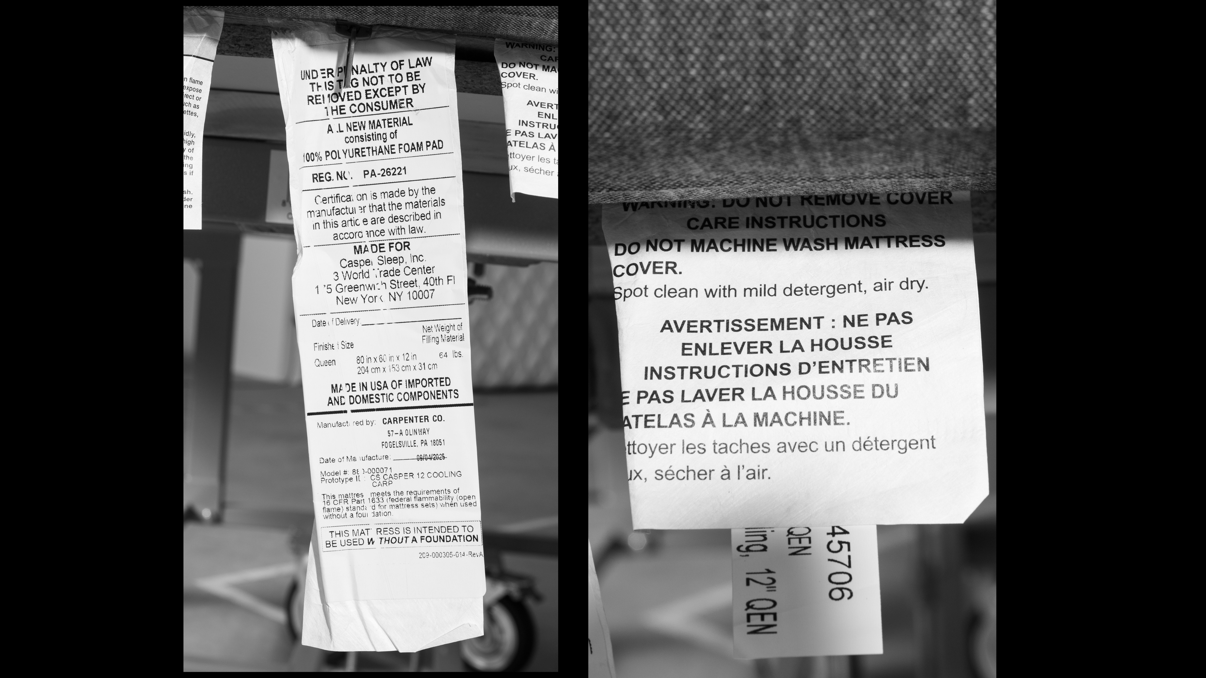 The Casper Cooling Select is available exclusively at Costco in four sizes: Full, Queen, King, and California King. They also carry a hybrid version under the same name, the Casper Cooling Select 12" Hybrid Medium Firm Mattress. We tested the Queen-sized all-foam version, and our results are only valid for that variant. See the label for our unit.