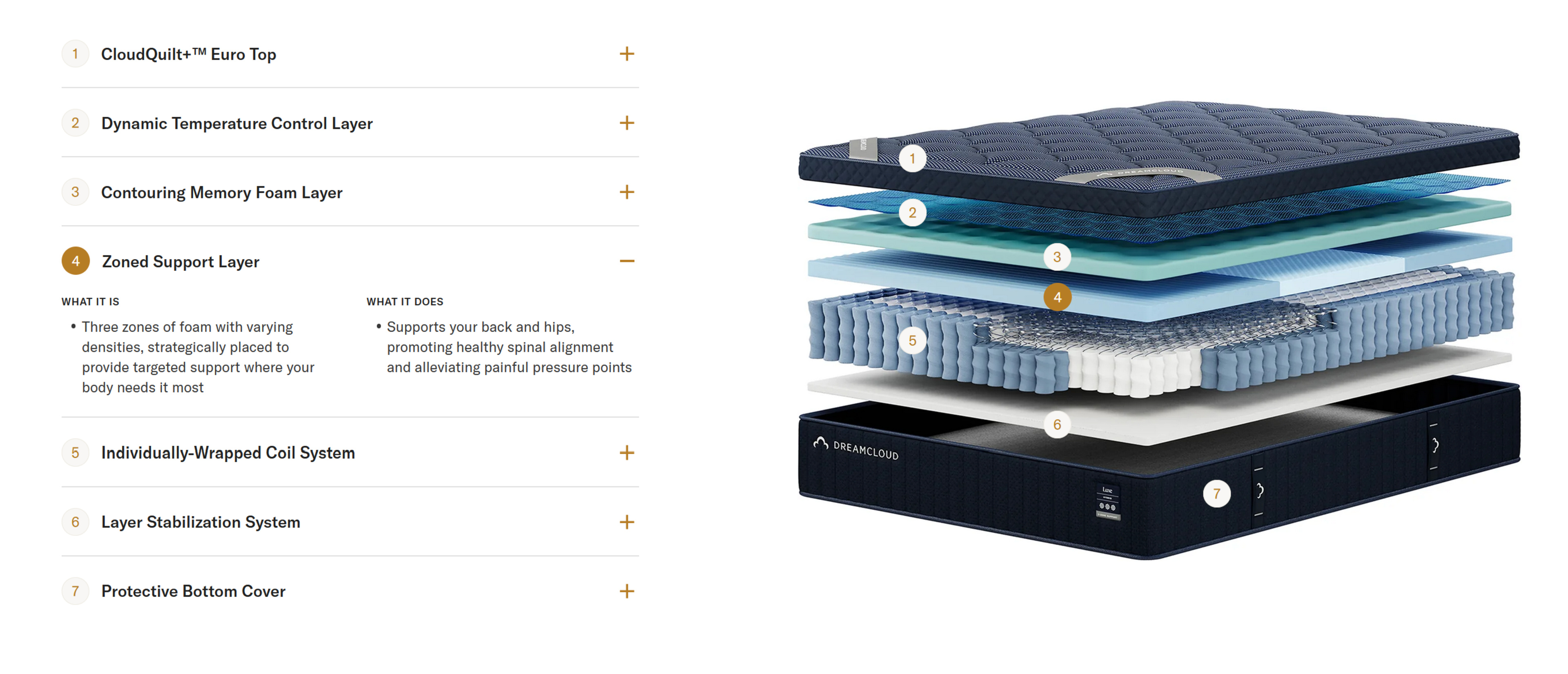 This mattress has 15.2 cm (6.0") of foam above its spring support layer, so it has thicker comfort layers than lower-end mattresses from DreamCloud, like the DreamCloud Premier Hybrid. The upper layer is a 5.3 cm (2.1") quilted top that includes 1.0 cm (0.4") of fiber fill, 2.5 cm (1.0") of memory foam, and 1.8 cm (0.7") of polyfoam. There's a softer 5.0 cm (2.0") memory foam upper comfort layer below it that allows most people to sink quite deeply into the mattress, followed by a much firmer 5.0 cm (2.0") polyfoam transition layer that helps distribute your weight over the support layer and prevent you from feeling the individual coils.