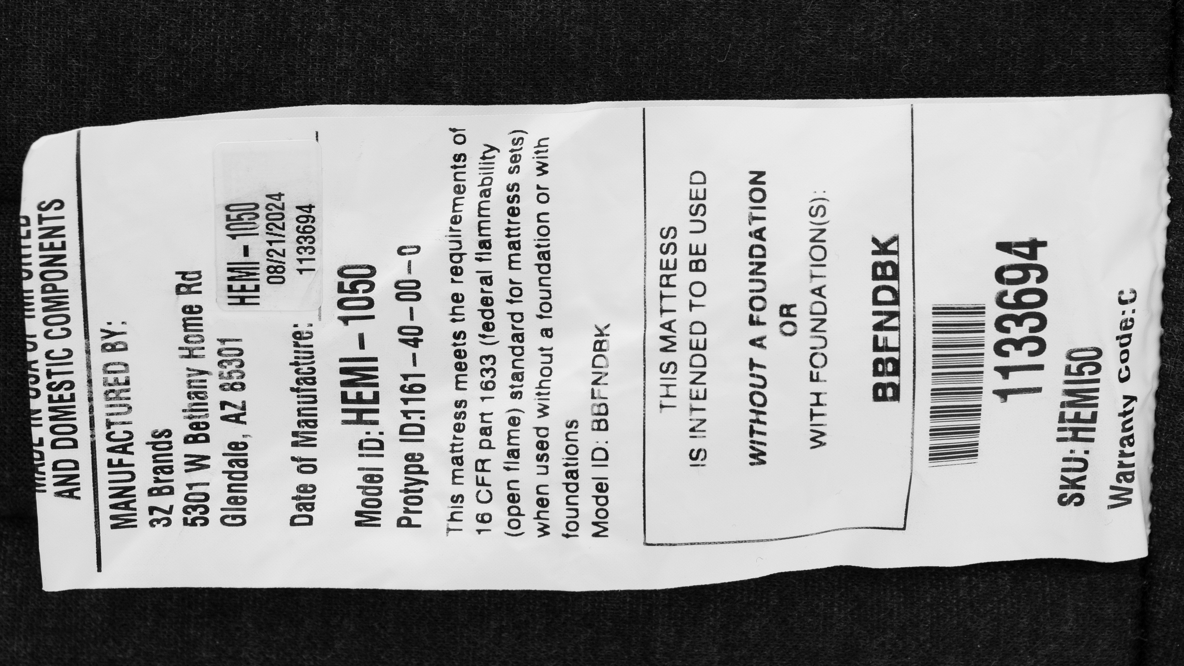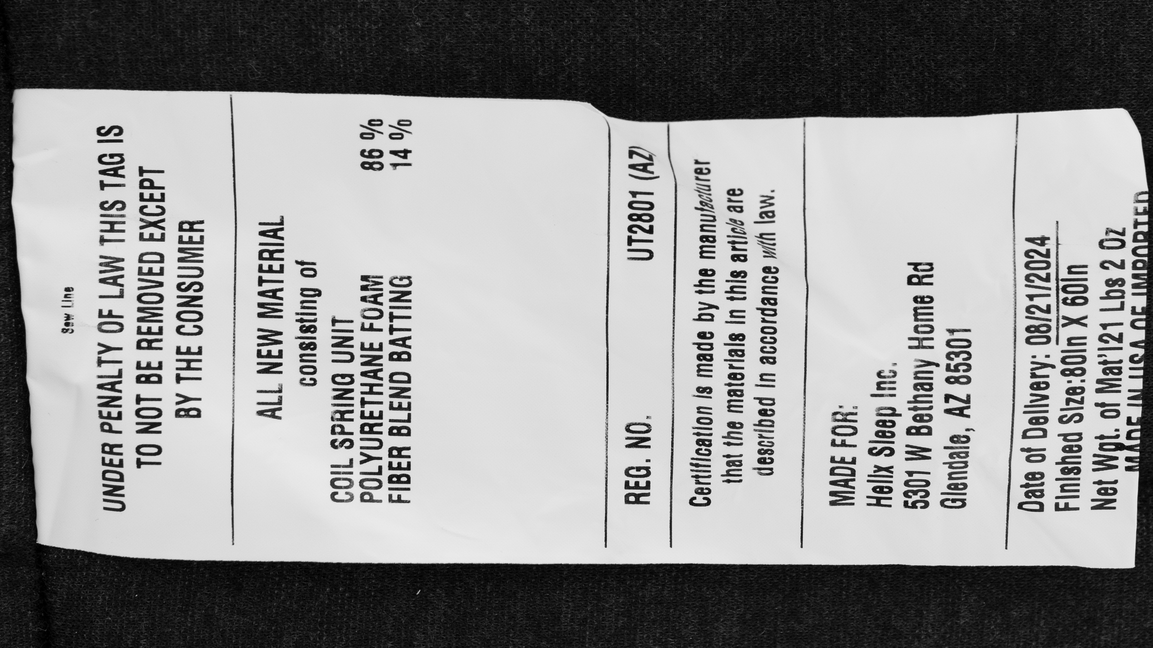 The Helix Midnight Luxe mattress comes in Twin, Twin XL, Full, Queen, King, California King, Short Queen (60" x 74"), and RV King (72" x 80"), and the manufacturer lists its firmness level as 'Medium.' There are also a few upgrades available. You can add a GlacioTex Cooling cover, CoolForce Layer, or ErgoAlign Layer depending on your preference. We tested the Queen-sized model with no additional upgrades. See the first label and the second label for our unit.
