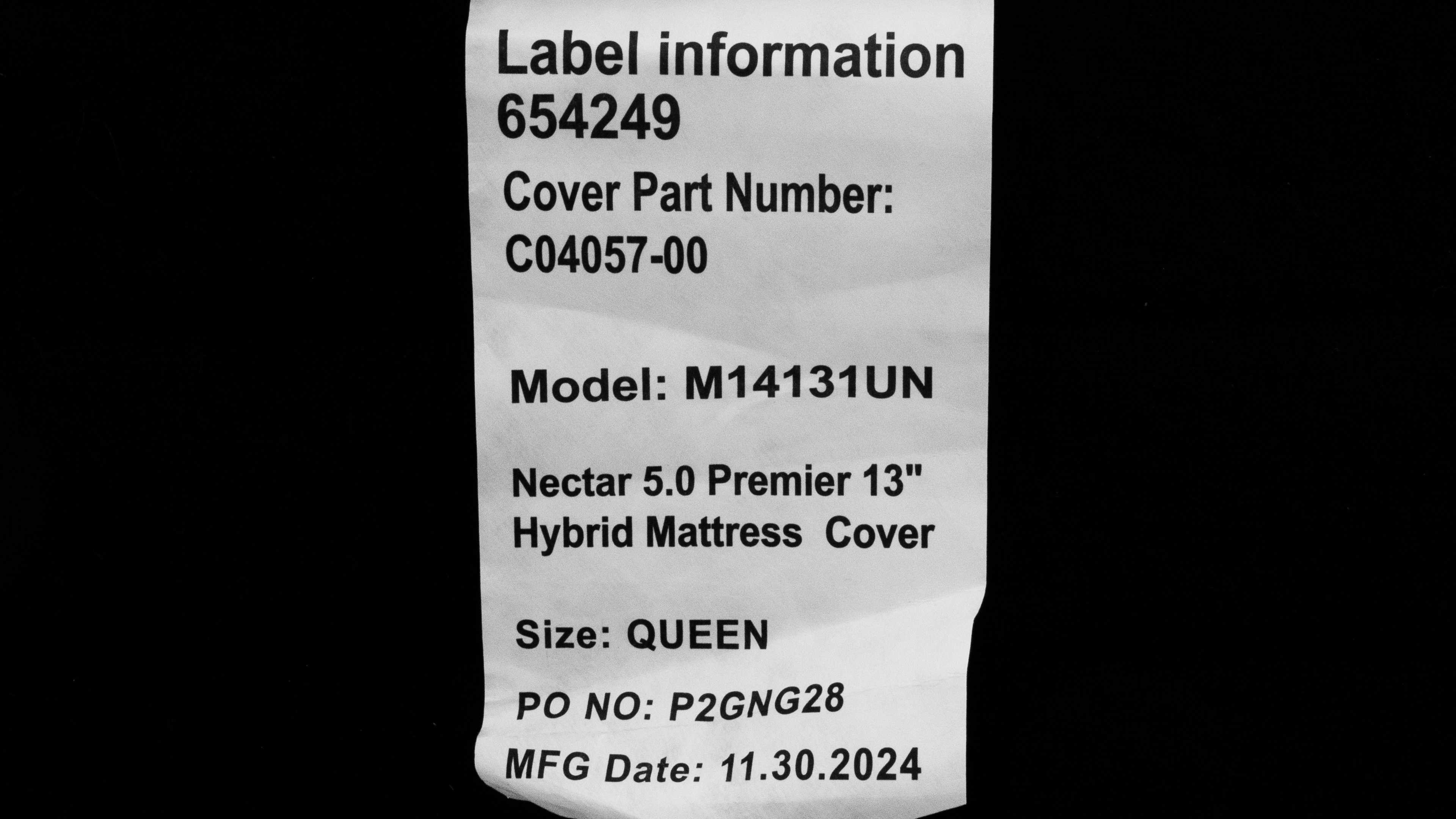 The Nectar Premier Hybrid mattress is available in Twin, Twin XL, Full, Queen, King, California King, and Split King sizes. It comes in one firmness level, which the manufacturer calls medium-firm. Nectar also makes an all-foam version of this mattress called the Nectar Premier. We tested the queen-sized hybrid model, and our results are only valid for that model. You can see our unit's label here.