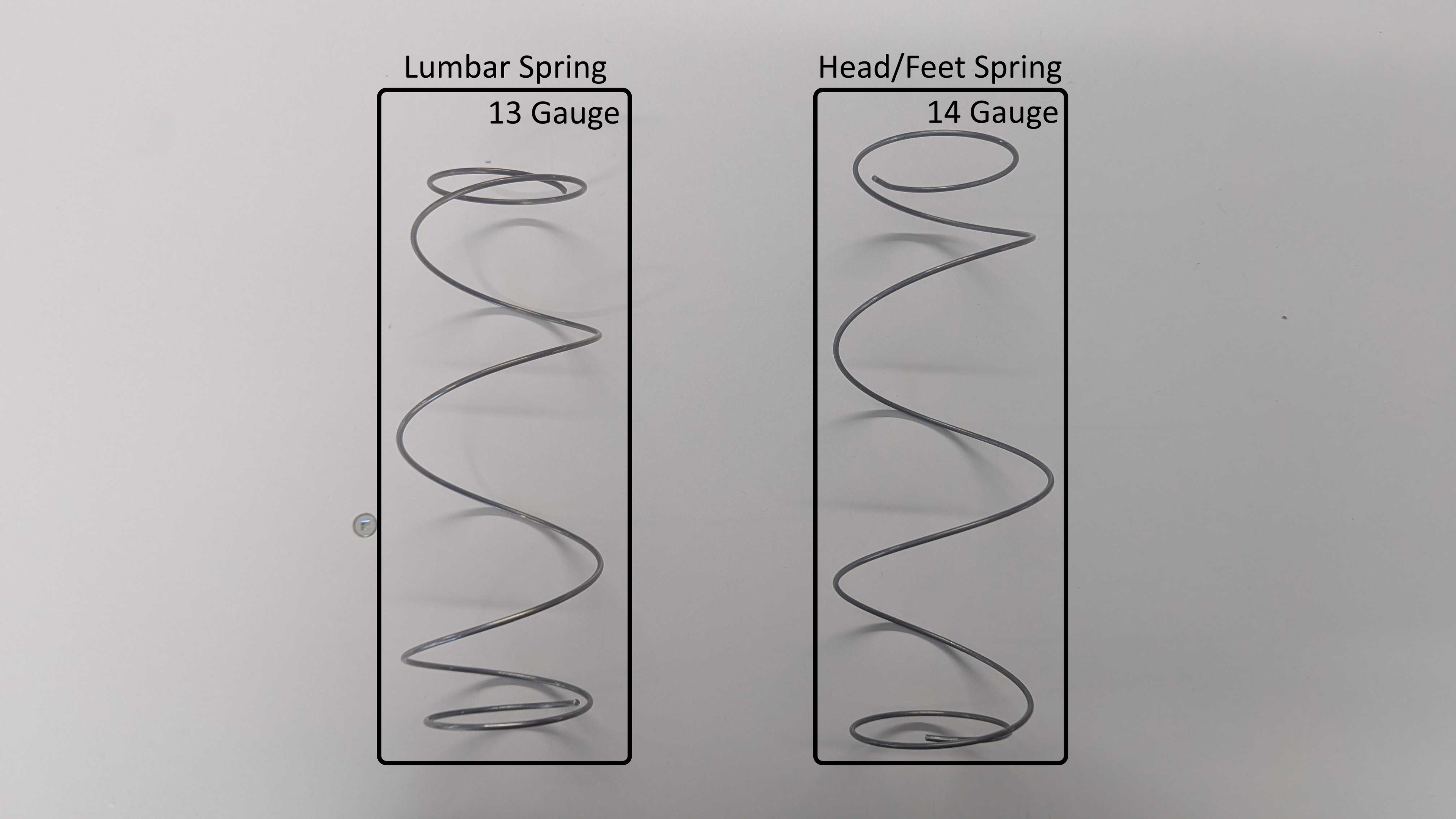 This mattress uses 13-gauge springs at the head/foot and 14-gauge springs in the lumbar area. While 14-gauge coils are made of thinner wire and are usually softer, they seem to be made of stiffer material. The spring layer overall has similar stiffness in the lumbar area and at the head/foot, with the lumbar being slightly stiffer. Here's a comparison of both types of springs.