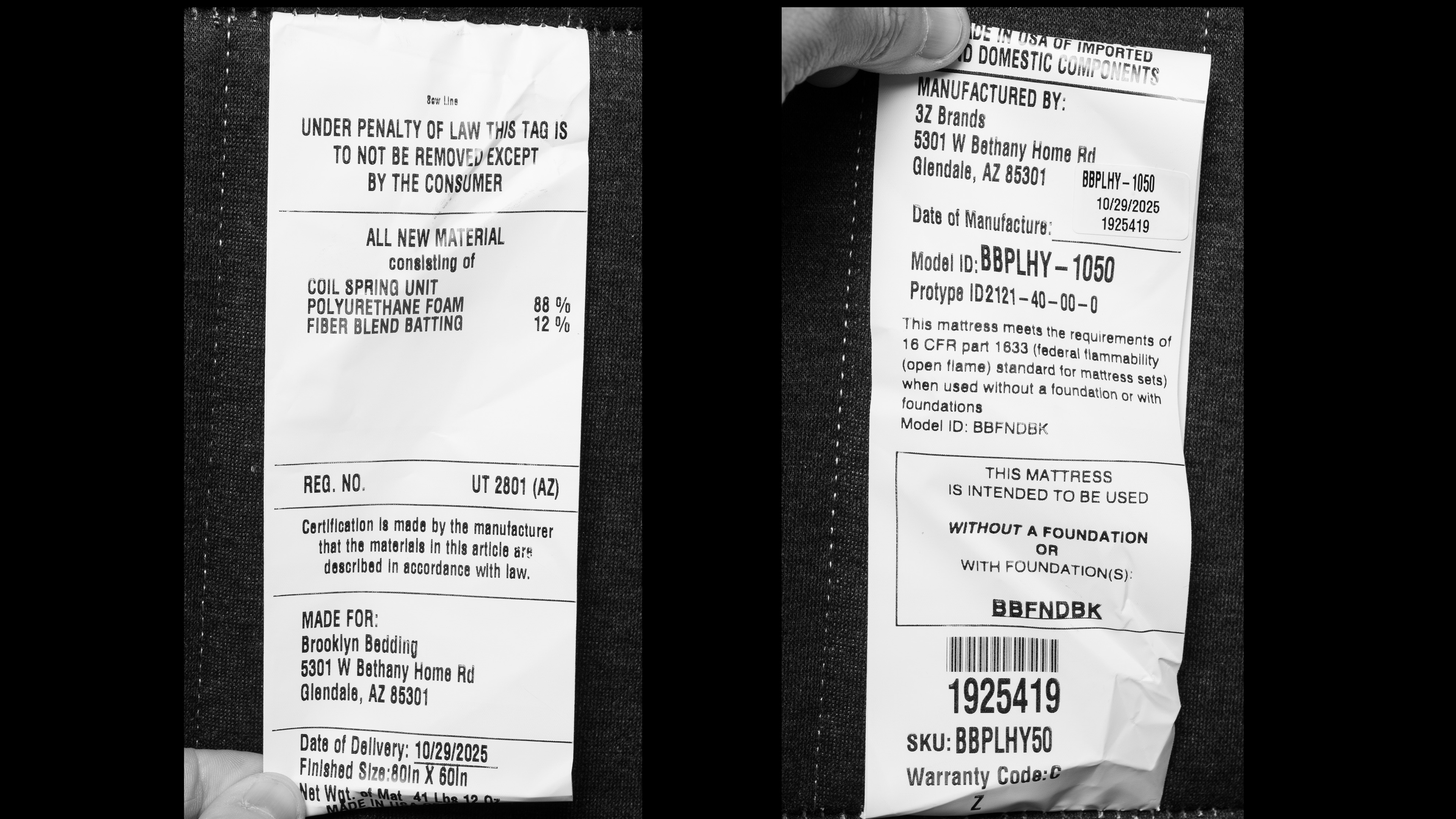 These results are for the 'Extra Firm' side of the Plank Luxe. We tested the Queen size with a standard cover, and you can see our unit's label here. We tested the 'Firm' side separately, and you can see those results in our review of the Plank Firm Luxe.