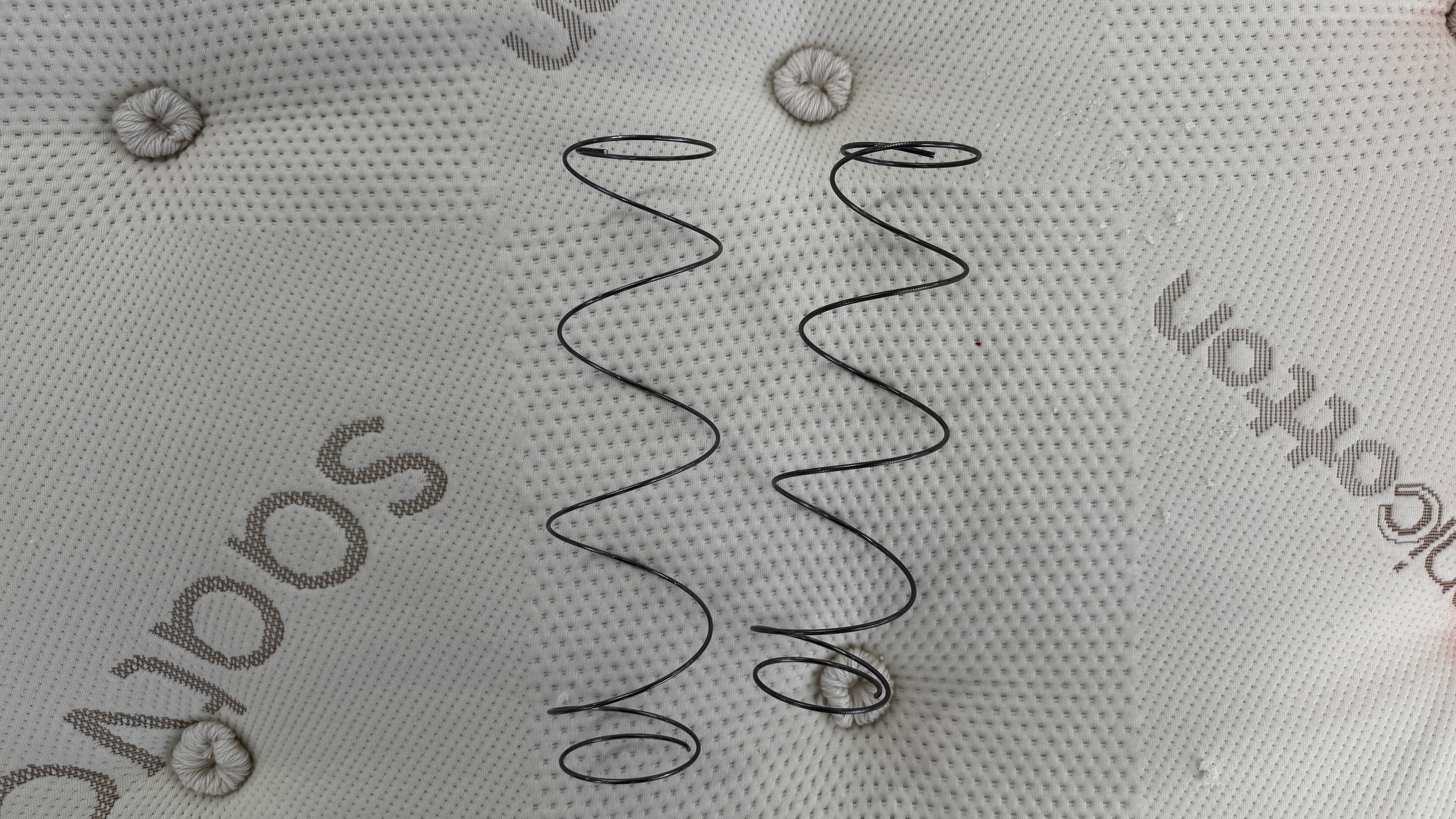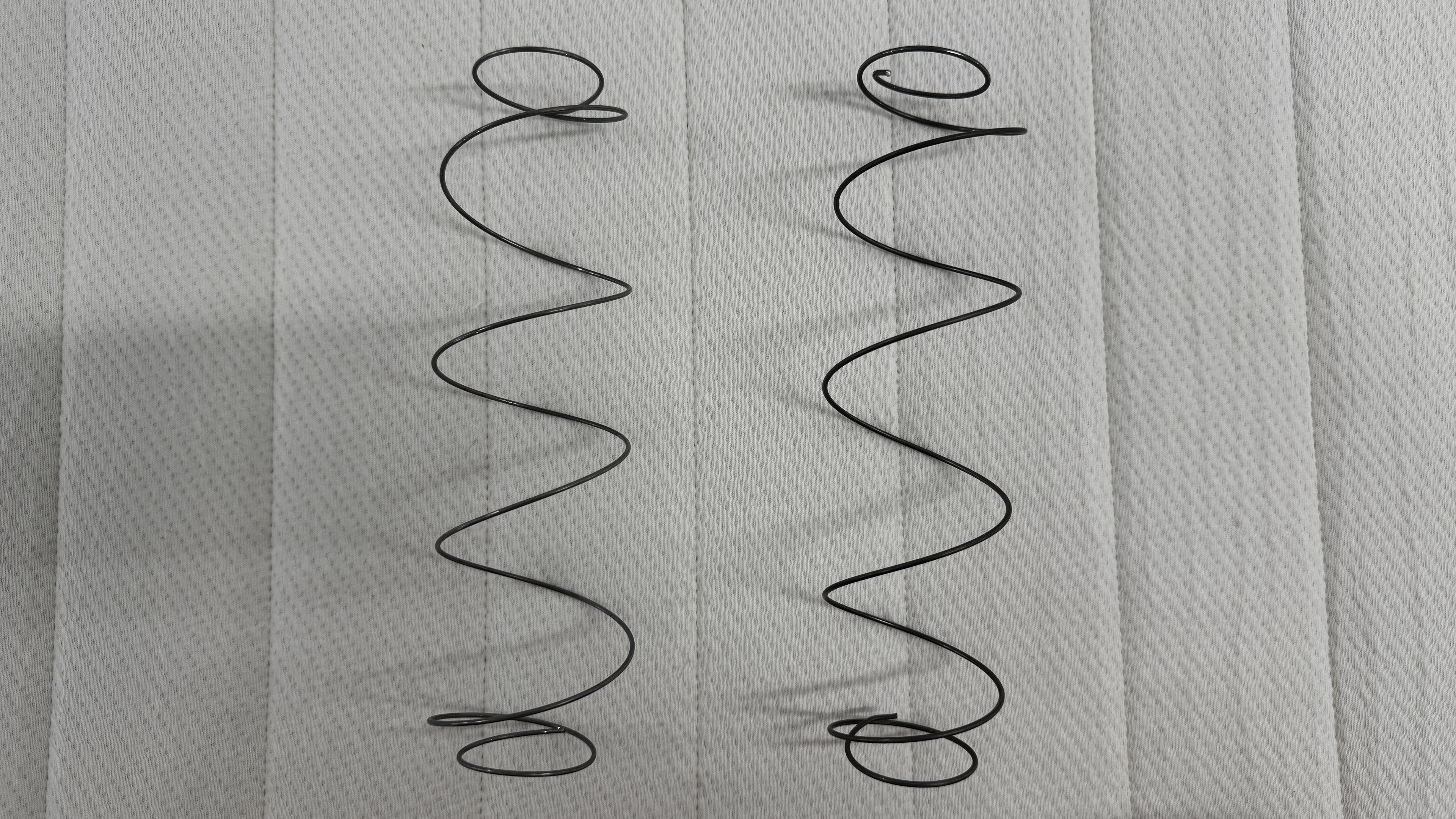 The support contains 14-gauge pocket coils. This type of coil is individually wrapped, providing better motion isolation and contouring than other types. The mattress's marketing suggests different springs at the head/foot of the mattress, but in fact, the support springs are all the same gauge and look identical, aside from the edge support coils. There is a slight difference in spring firmness between the heat/foot and lumbar area of the mattress. Here's a comparison of the lumbar springs (left) and head/foot springs (right).