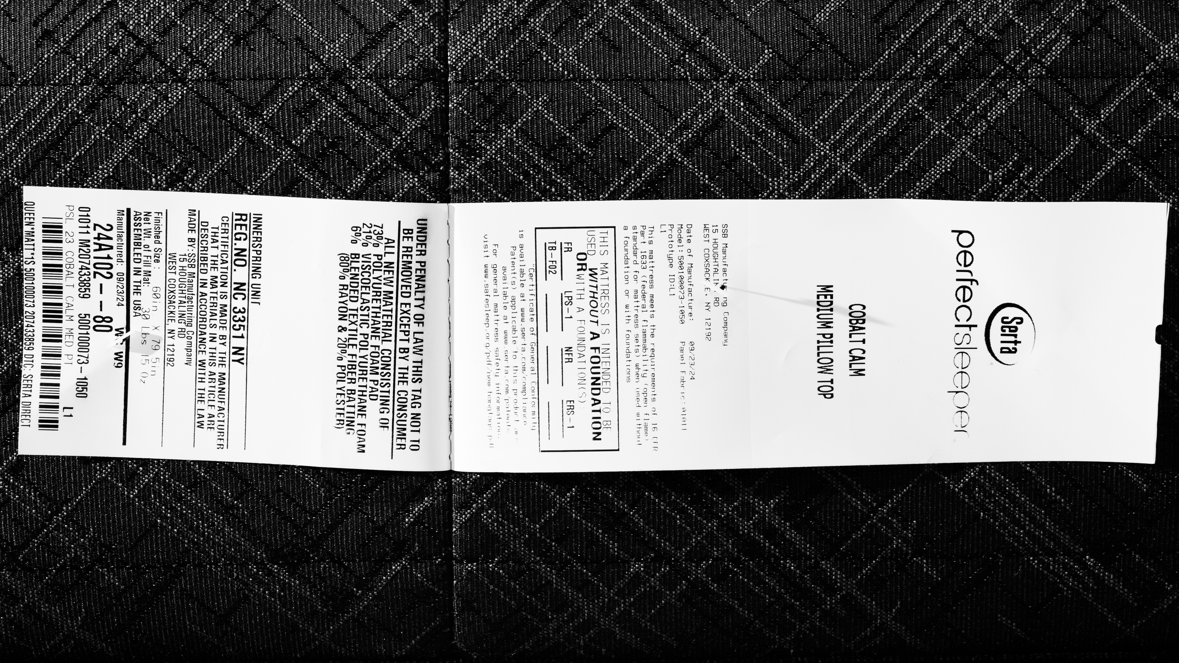 The Serta Perfect Sleeper mattress lineup includes three 'collections': Standard, Ultimate, and Enhanced. Each includes various firmness options. We tested the 'Ultimate' version, which is available in Firm, Medium, Firm Pillow Top, Medium Pillow Top, and Plush Pillow Top. It's available in Twin, Twin XL, Full, Queen, King, and California King sizes. We tested the 'Medium Pillow Top' variant in the Queen size, and other variants may perform differently. Here's a photo of our unit's label.