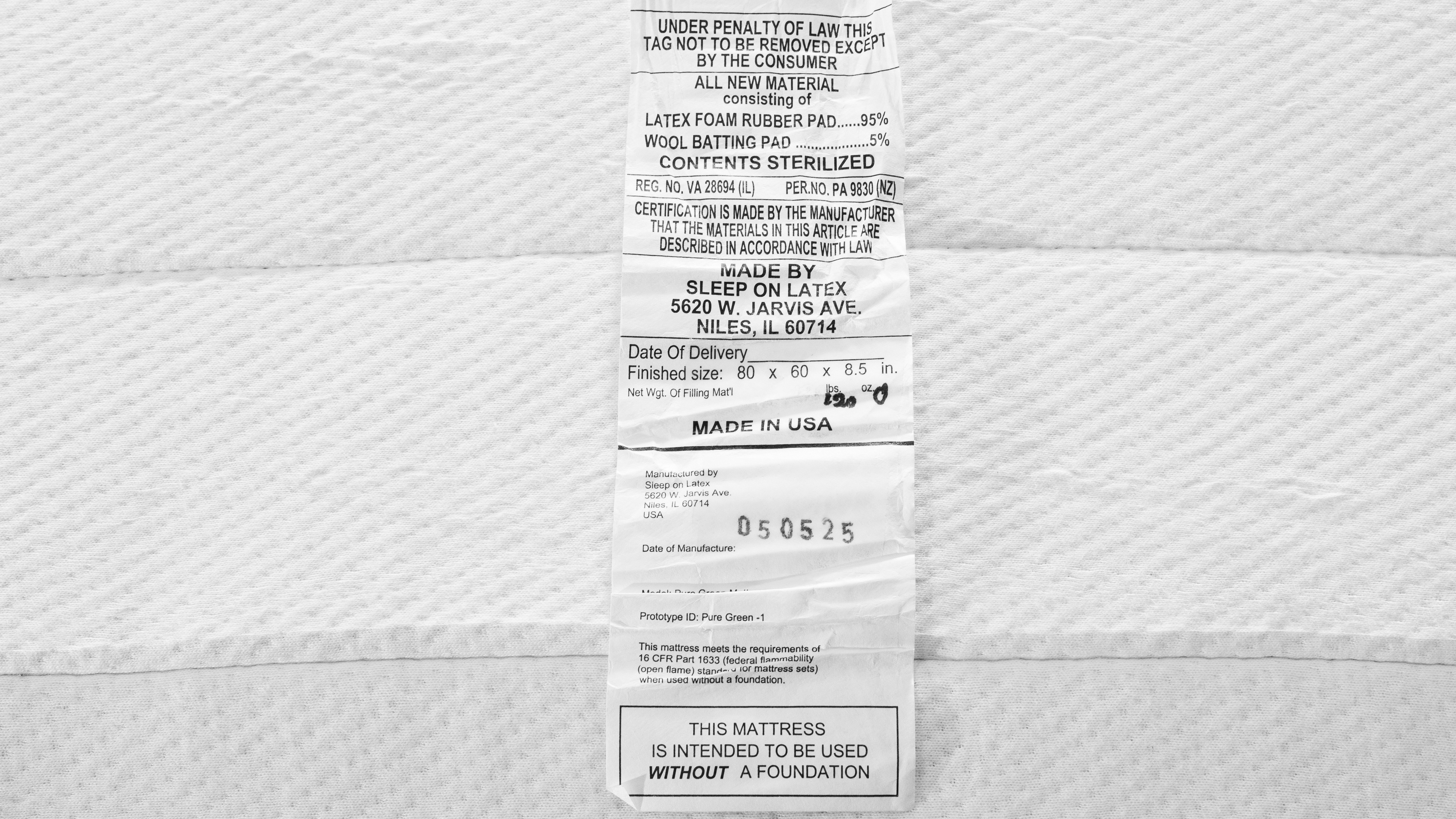 The Sleep On Latex mattress comes in Twin, Twin XL, Full, Queen, King, and California King sizes. There are two firmness options: Medium and Firm. We tested the Queen-sized model in Medium, and you can see the label for our unit.