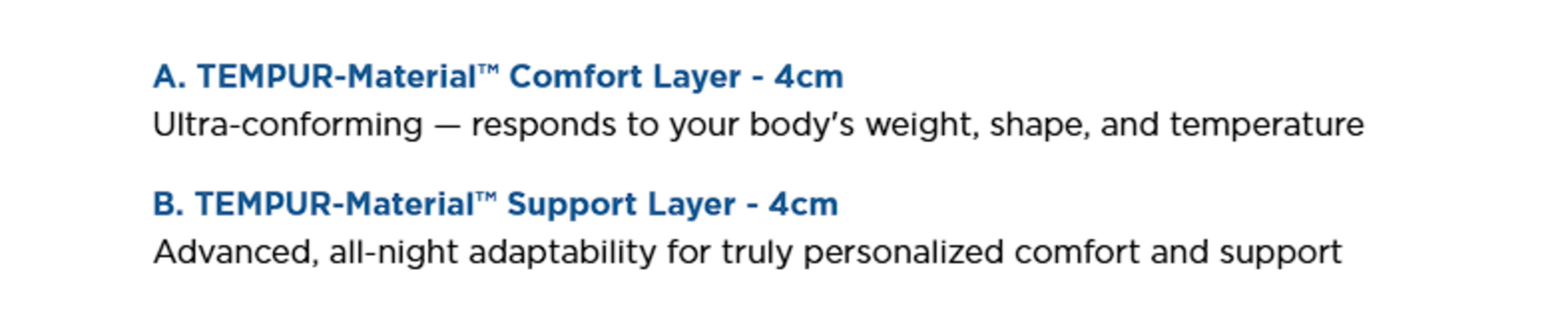 It's also worth noting that the upper and lower comfort layers are each made of a different type of memory foam, despite looking quite similar. The lower layer is noticeably slower to respond after being compressed, and it's slightly softer (as you can see in the foam layer firmness results). It's a little less resilient (as seen in the foam layer resilience results), and it's denser (see the foam layer material). The manufacturer says the upper layer of memory foam is more conforming and more responsive, which would mean it recovers its shape faster after being compressed. This does seem to be supported by the results, although neither layer has high responsiveness. Here's a screenshot of Tempur-Pedic's description of the foams.