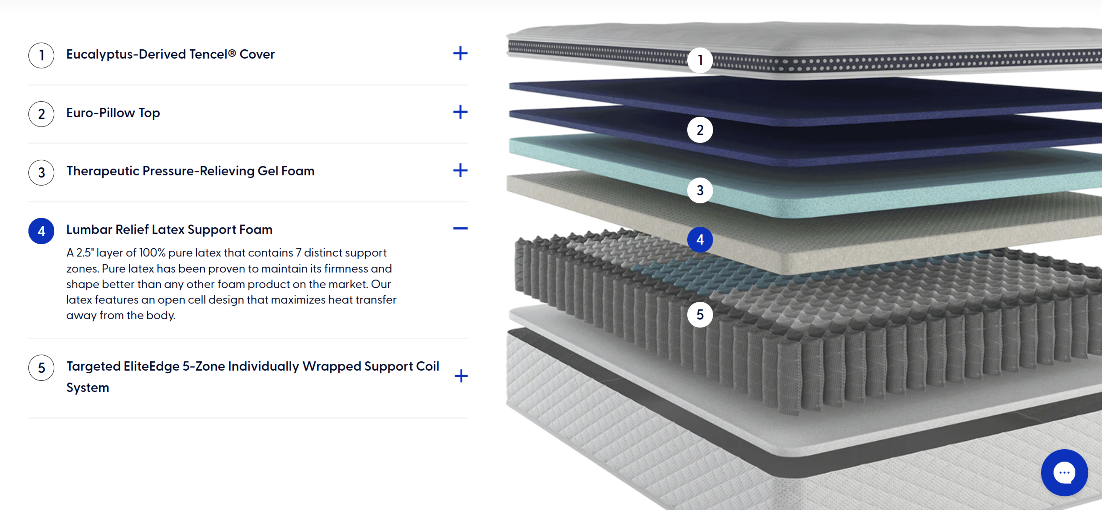 The support layer is made up of zoned pocket coils, with different types of springs at the head/foot of the mattress and in the lumbar area. The layer has 15-gauge springs at the head/foot and 14-gauge springs in the lumbar area. The thinner 15-gauge wire results in softer springs at the head/foot of the mattress. You're unlikely to compress the coils enough that you notice a difference in firmness, but the stiffer 14-gauge coils may be more durable.