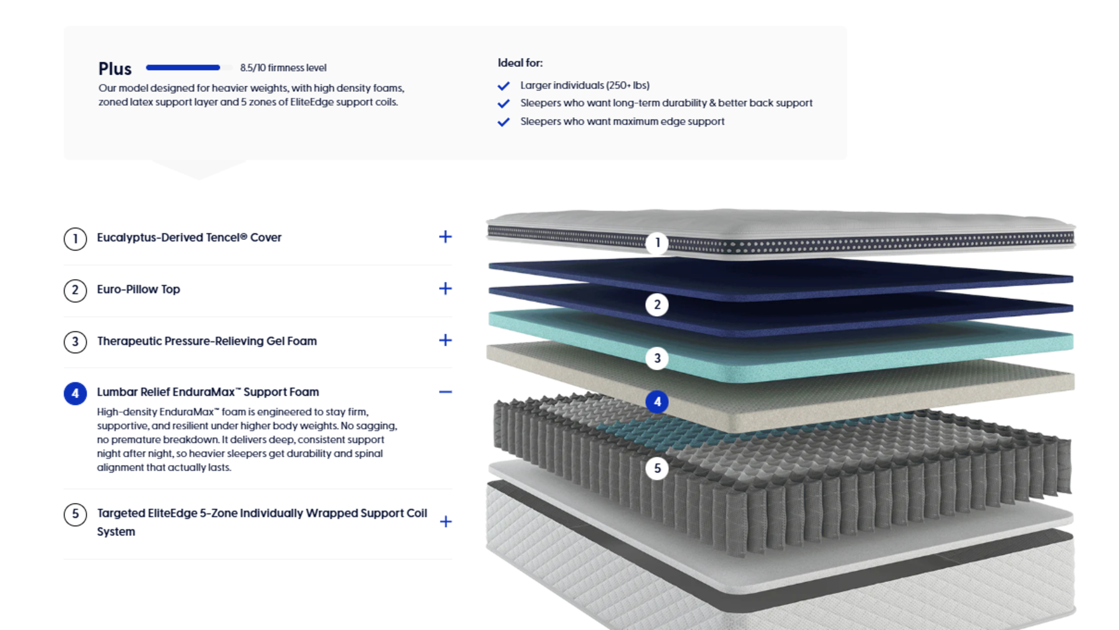 The WinkBeds Plus is a mid-range hybrid mattress. It's the firmest variant of the WinkBed and is marketed as a more supportive and durable option for people in the heavier weight range. Its design includes a quilted layer, gel memory foam, and polyfoam layers, and zoned pocket coils intended to provide extra support for your back.