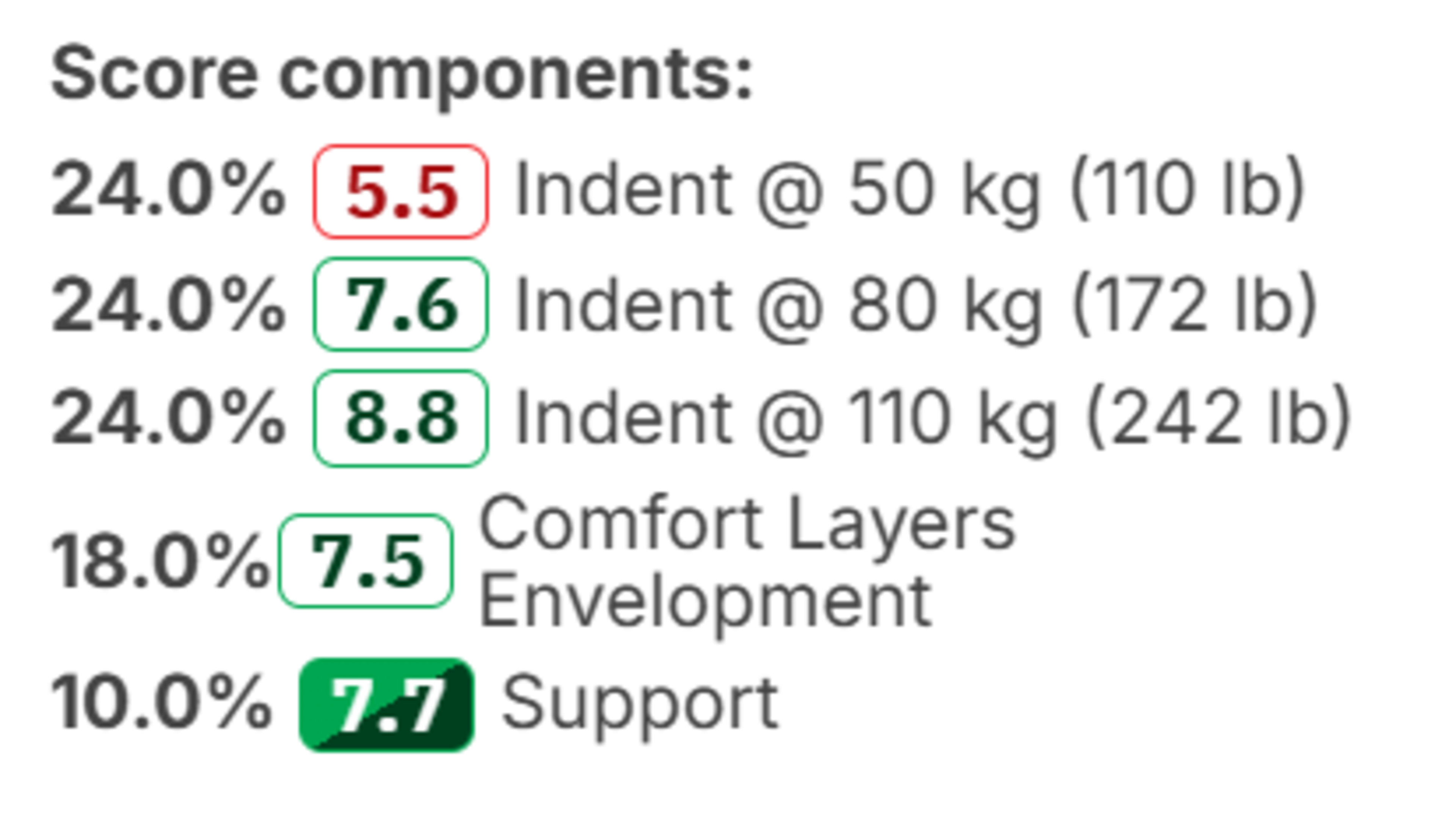 The Support performance usage score is based on the mattress's support performance for each weight category.
