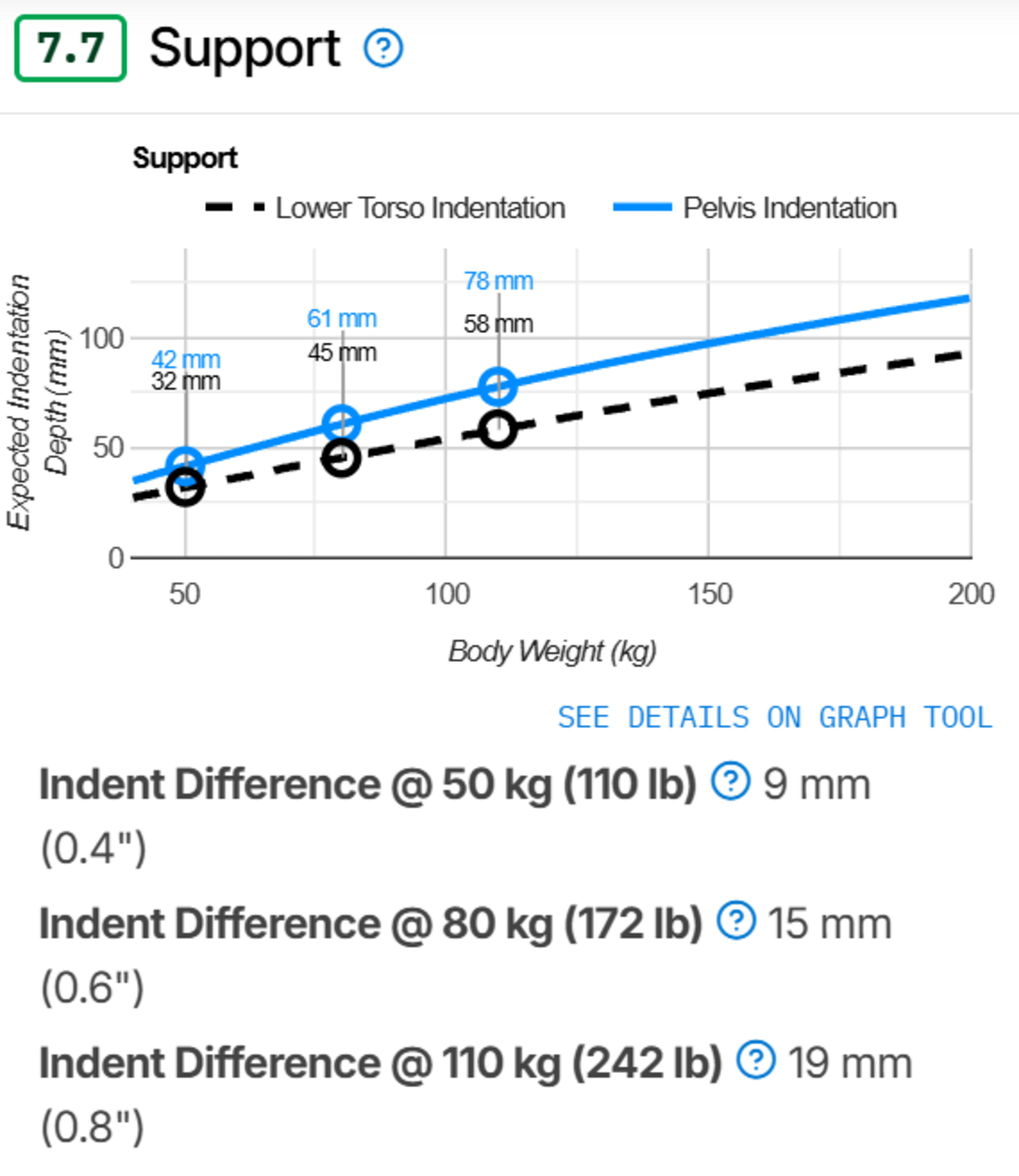 For the Support test, we use our indentation measurements at the head/foot of the mattress, as well as the lumbar area. Comparing the indentation in those two areas, we extrapolate how well the mattress will support the heavier parts of your body, depending on your weight, to keep the spine aligned. Mattresses with a smaller difference in indentation at the head/foot and lumbar area get a higher score for support.
