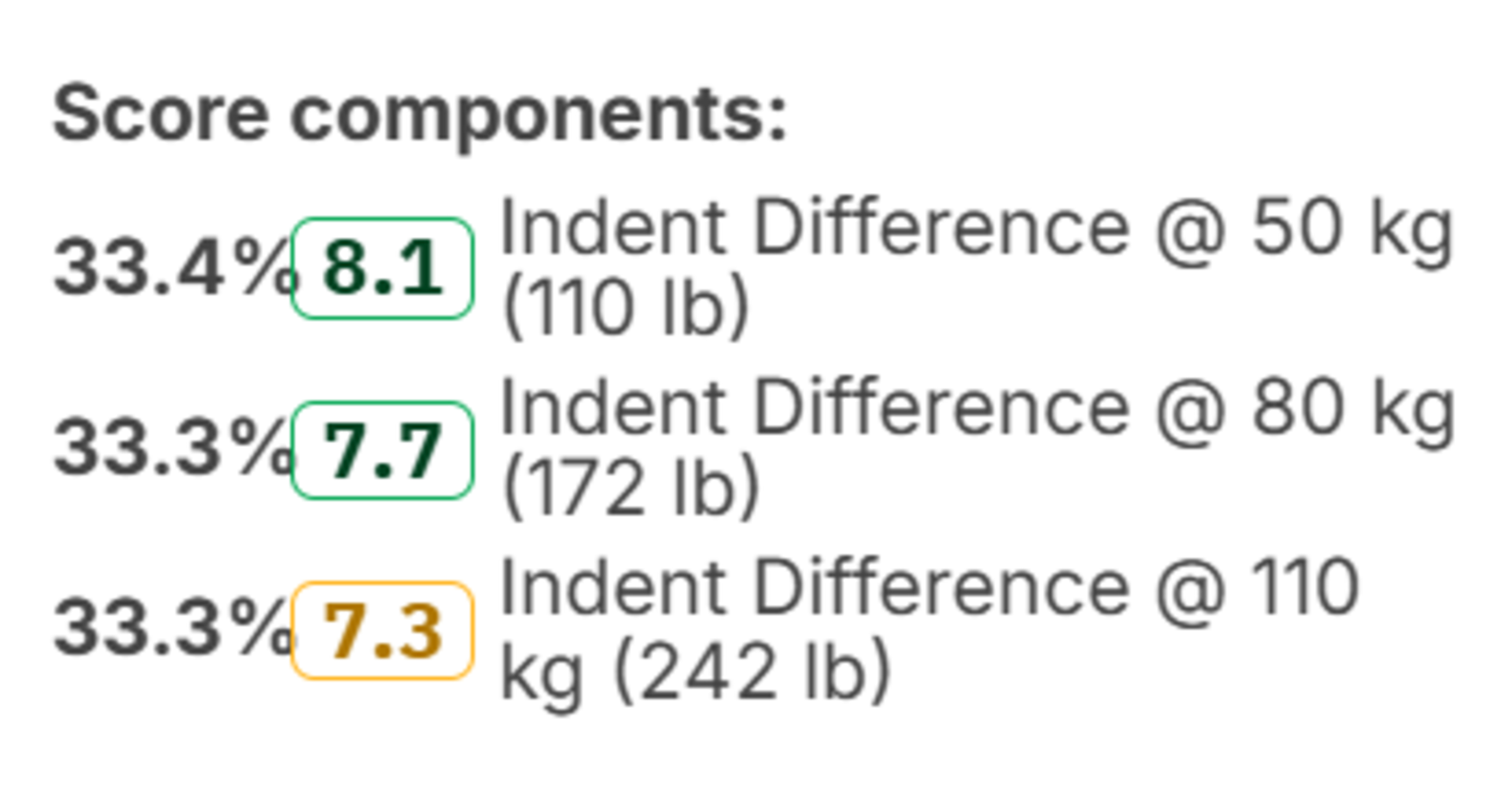 This data provides our Body Conformity and Support test results, which allow you to see a mattress's support and pressure relief performance tailored to your specific weight. Our scores are based on the mattress's performance for different weight categories: Lighter Sleepers or 50 kg/110lb; Average Sleepers or 80 kg/172lb; and Heavier Sleepers or 110 kg/242lb.