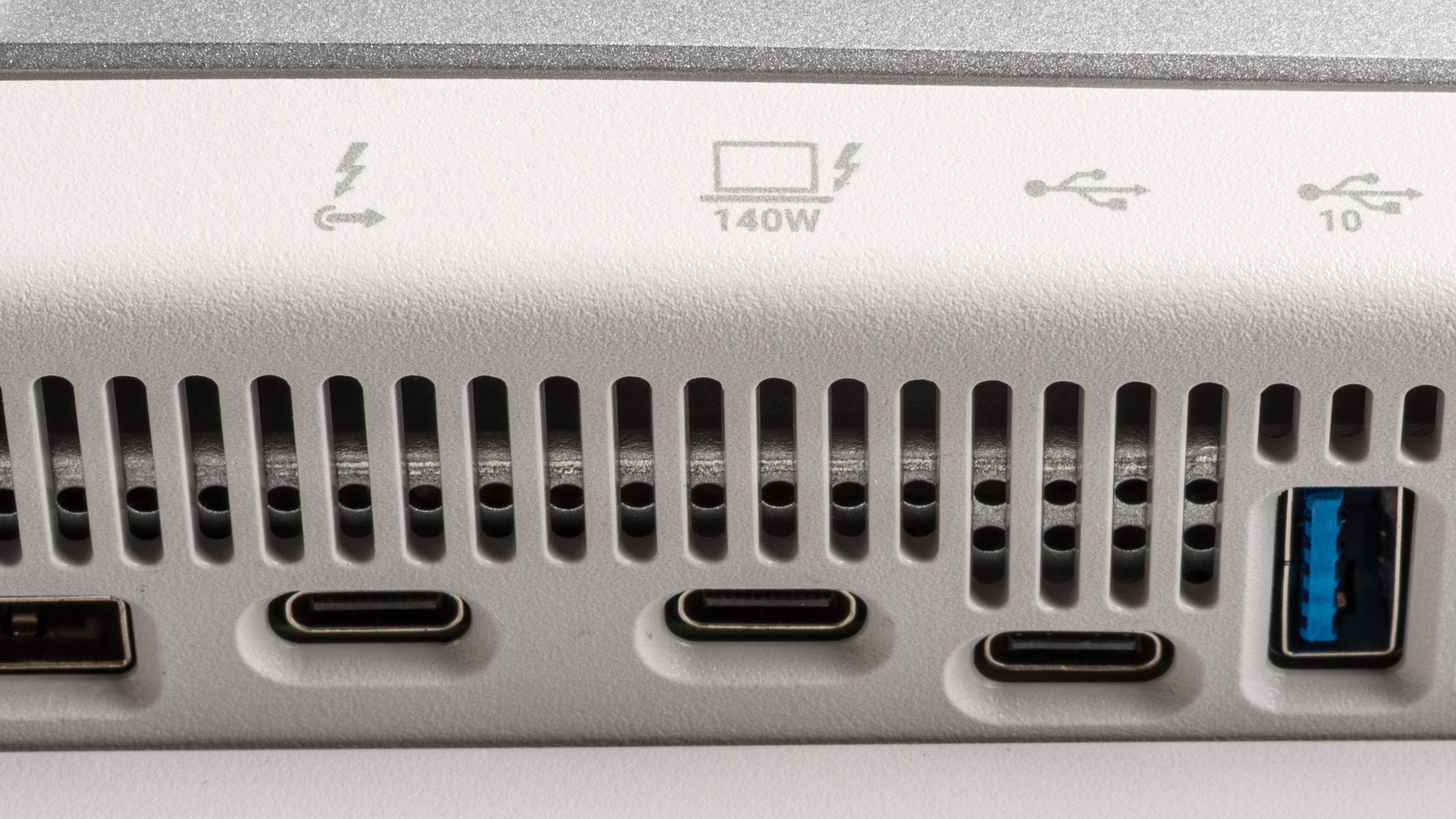That said, not all USB-C monitors support Thunderbolt. Those that do have the Thunderbolt lightning symbol. In the example below, the Apple Studio Display 2022 has four USB-C ports, but only one supports Thunderbolt. It's easy to identify which one because it has the lightning symbol.