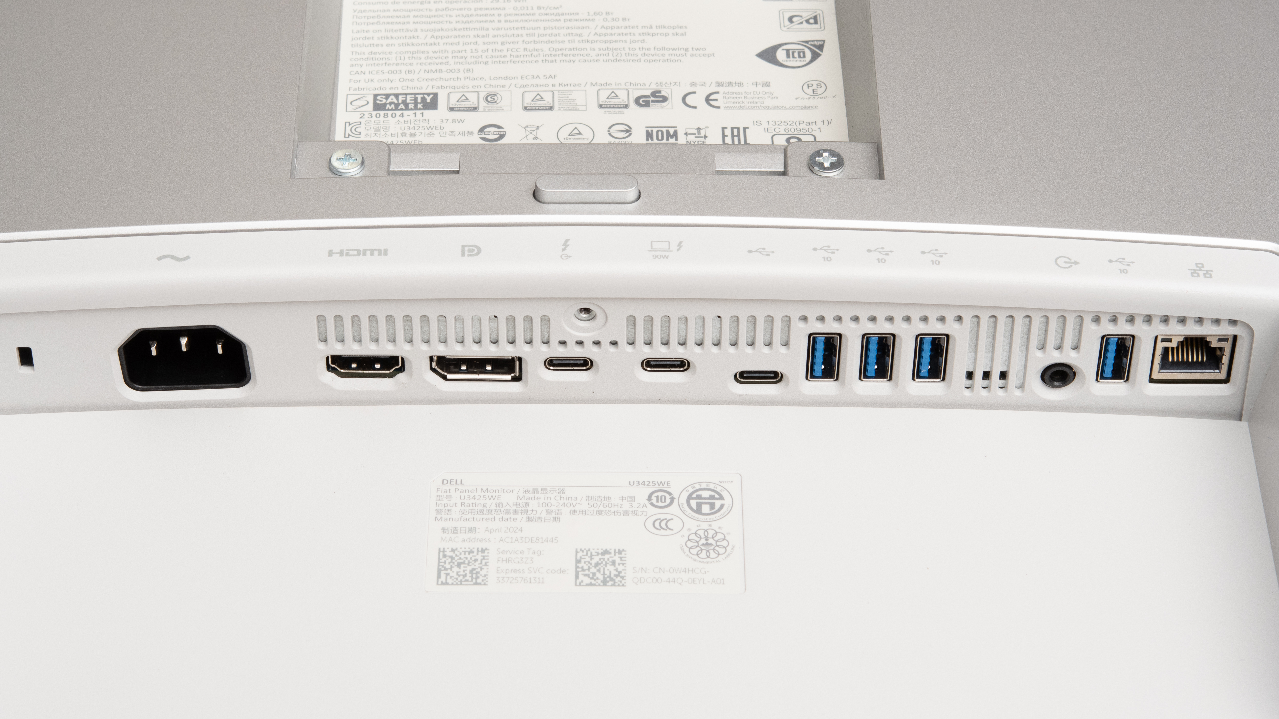 Other monitors have clear symbols to identify what each USB-C port does. The Dell U3425WE has three USB-Cs, two of which support Thunderbolt. The one on the left is Thunderbolt out for daisy chaining a second screen, and this is identified with the lightning symbol and arrow pointing outwards. The USB-C port in the middle has the lightning symbol alongside a laptop and a marker for 90W of power, meaning this is the Thunderbolt port to which you can connect your laptop. The one on the right has the USB logo and is for data transfer only.