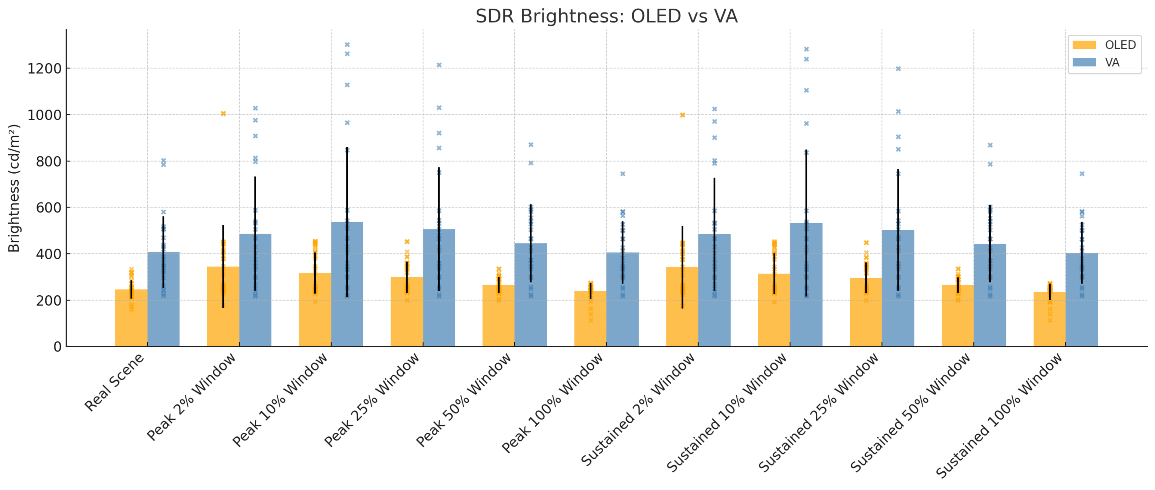 Using data from 24 VA and 37 OLED monitors that we've tested on Test Benches 2.0.1 and 2.1, you can see the average SDR and HDR brightness results, along with the standard deviation and spread of each panel type. There's a big spread amongst VA monitors because some use Mini LED backlighting to help them get brighter, while there are some cheap VAs that are dim. This means that getting a VA monitor doesn't mean it's bright, but generally speaking, VA panels are brighter than OLEDs.
