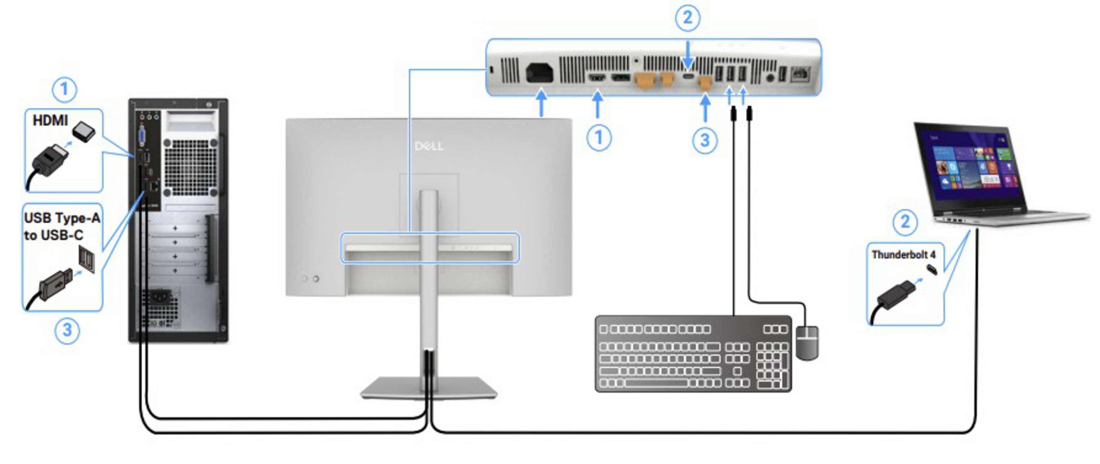 If the monitor or your computer doesn't support DisplayPort Alt Mode or Thunderbolt over USB-C, you need a separate USB upstream port and a video connection for each computer. Depending on the monitor, it may offer upstream over USB-B or USB-C. In the example below, the monitor has two USB-C upstream ports.