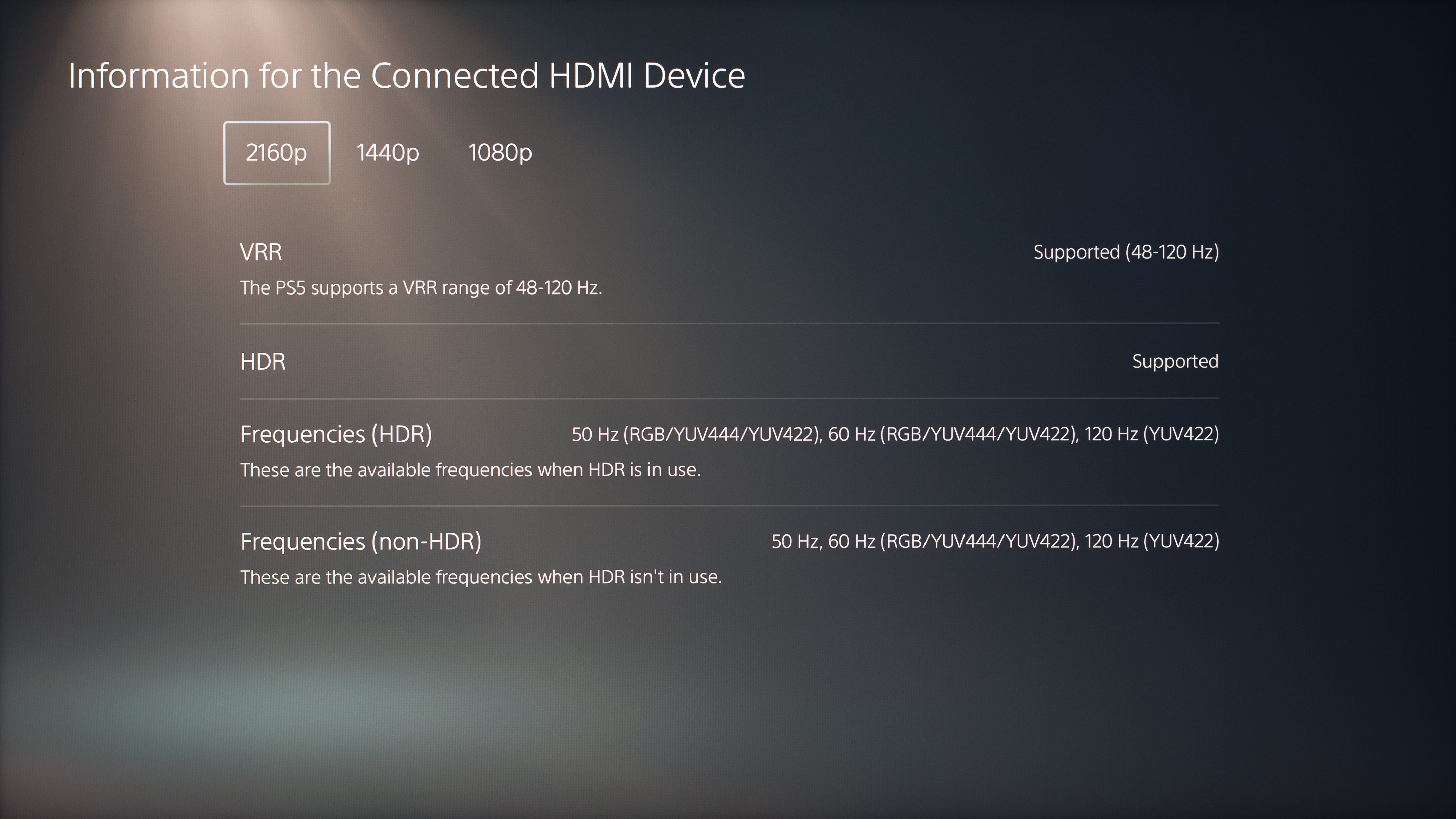 You can get a 160Hz refresh rate with a 4k resolution, or you can enable the DFR setting to get a 1080p @ 320Hz signal. The monitor doesn't need to use Display Stream Compression (DSC) in the 1080p mode or in 4k over HDMI, but it does with 4k signals over DisplayPort. There's a DSC setting that you can disable if you don't want to use DSC, but that limits the refresh rate to 60Hz with 4k, 8-bit, 4:4:4 signals. It also accepts 4k @ 60Hz 10-bit signals without DSC, but only with chroma 4:2:2.