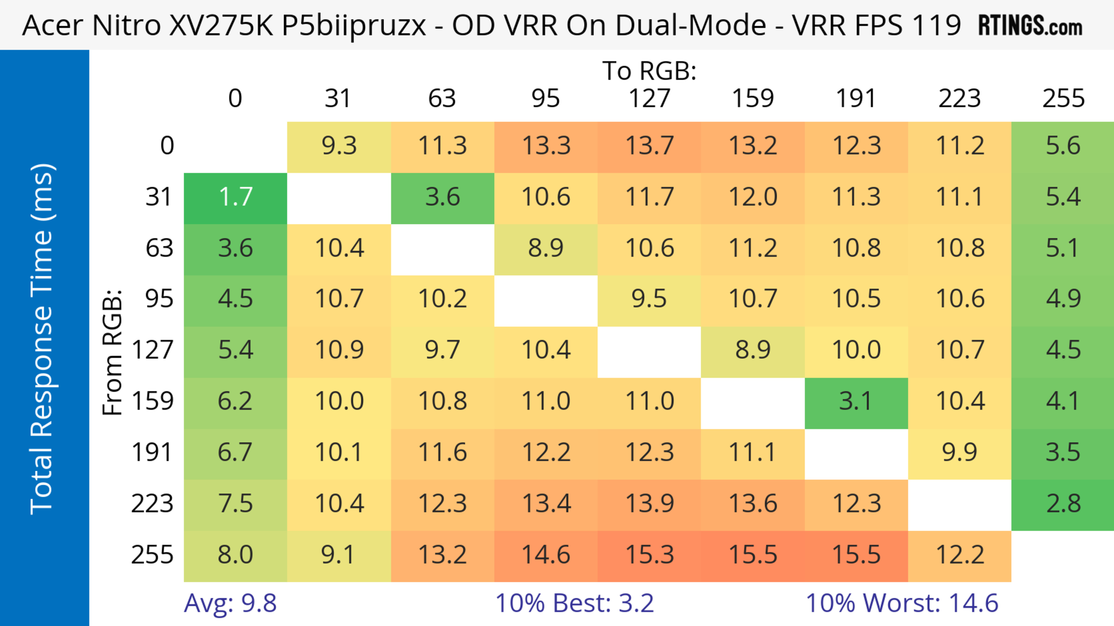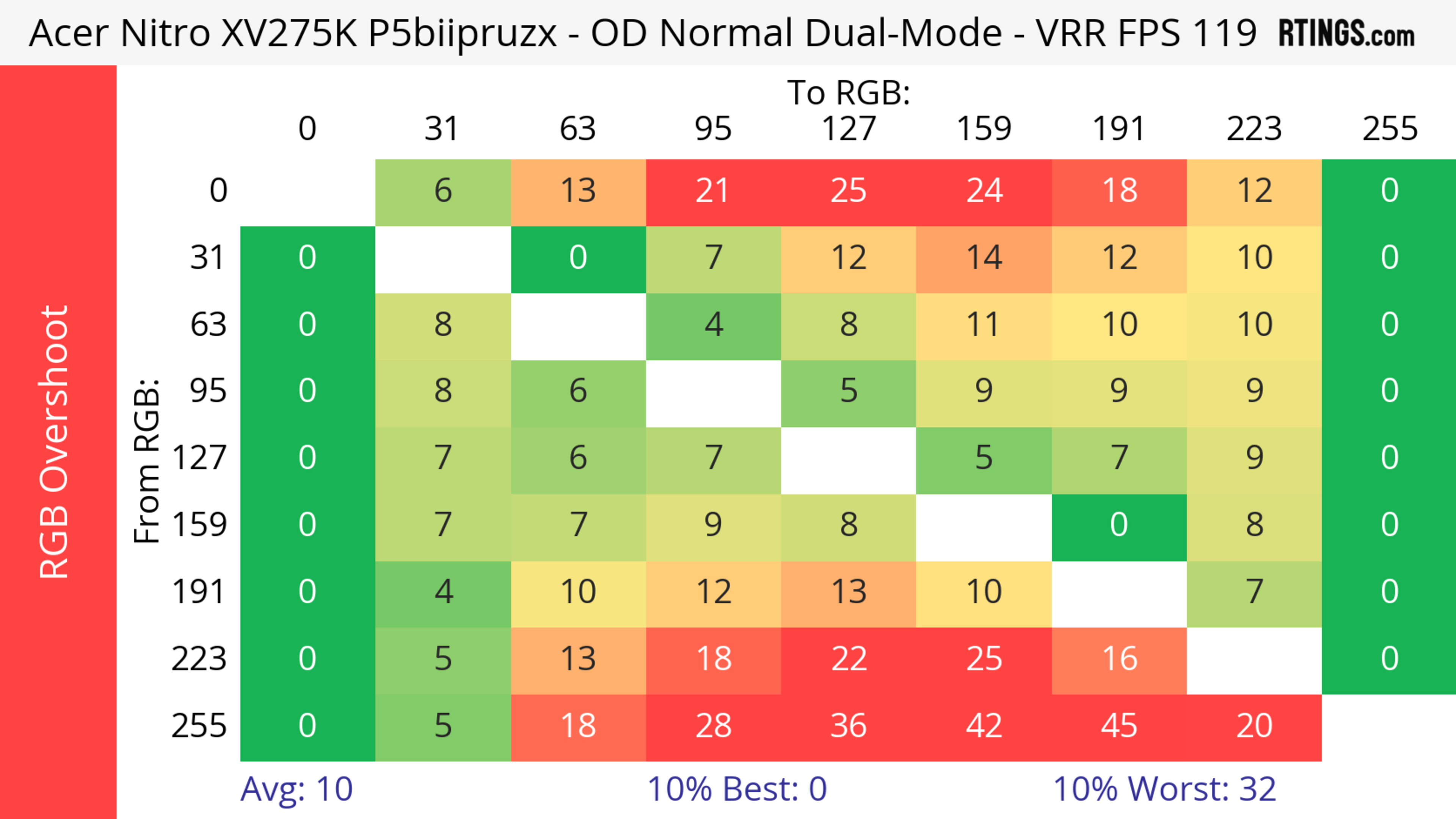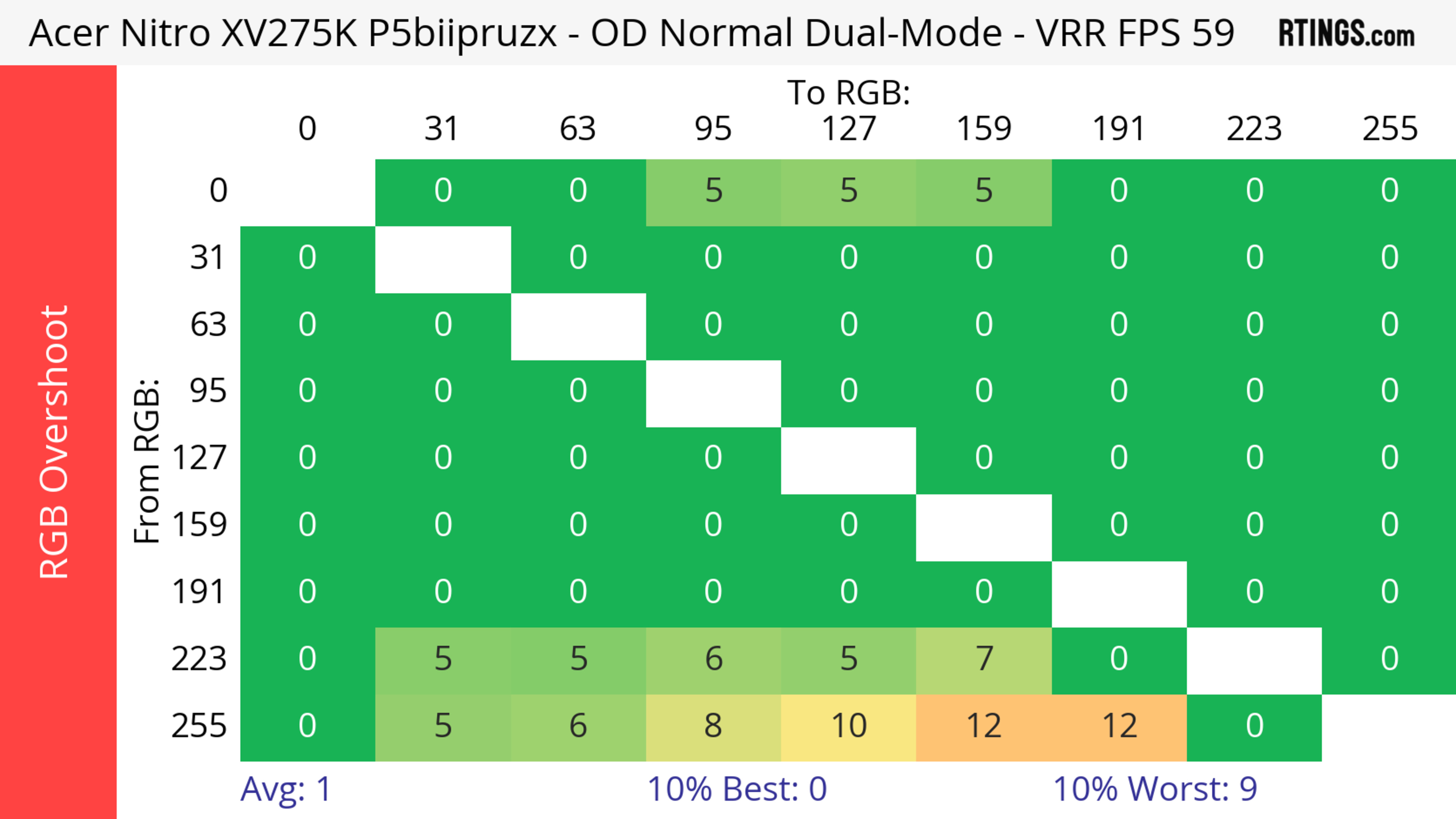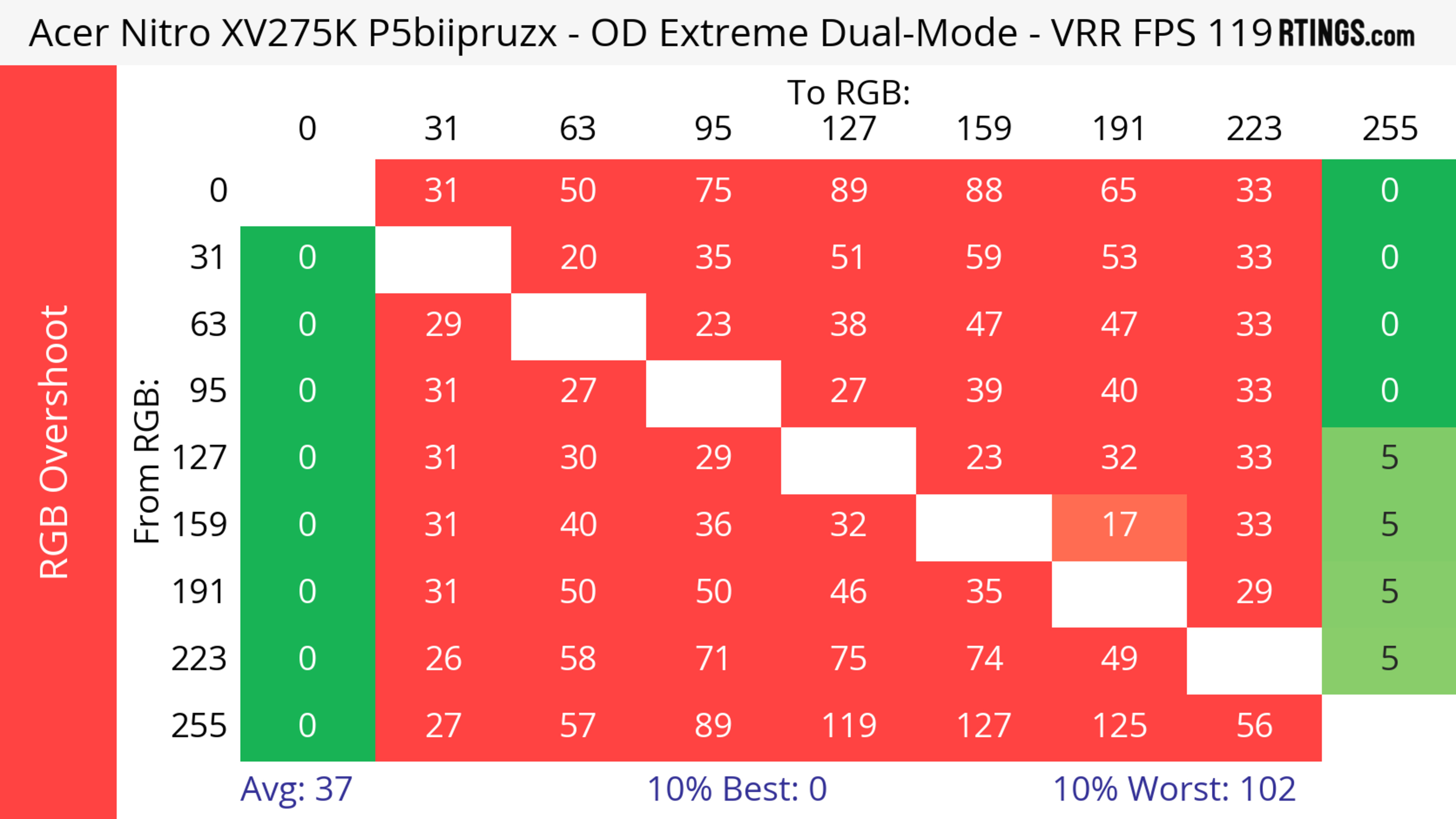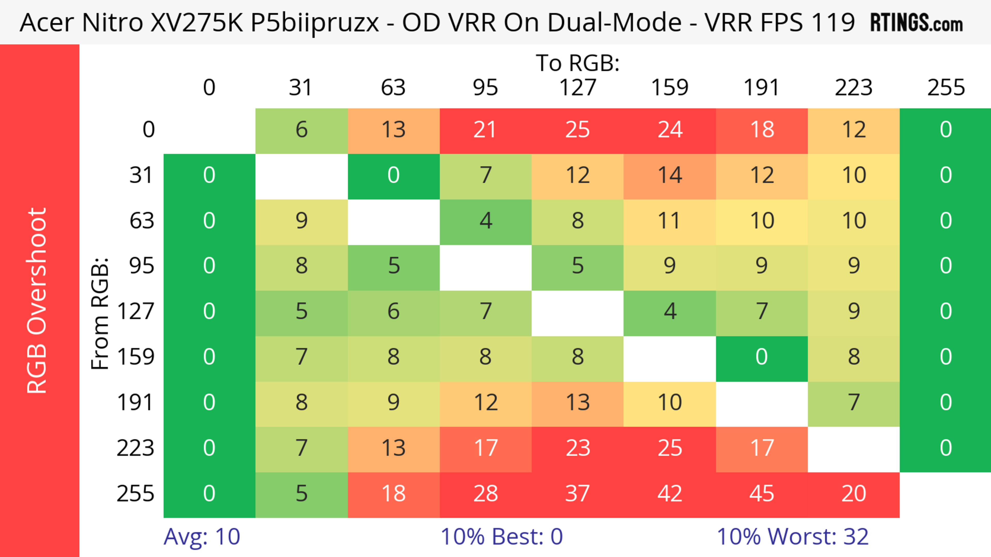 Using VRR disables any of the Over Drive modes. Unlike the older Acer Nitro XV275K P3biipruzx, the previously selected overdrive mode doesn't take effect once you enable VRR, but the 'Normal' setting with VRR off performs the same as using VRR at any refresh rate.
