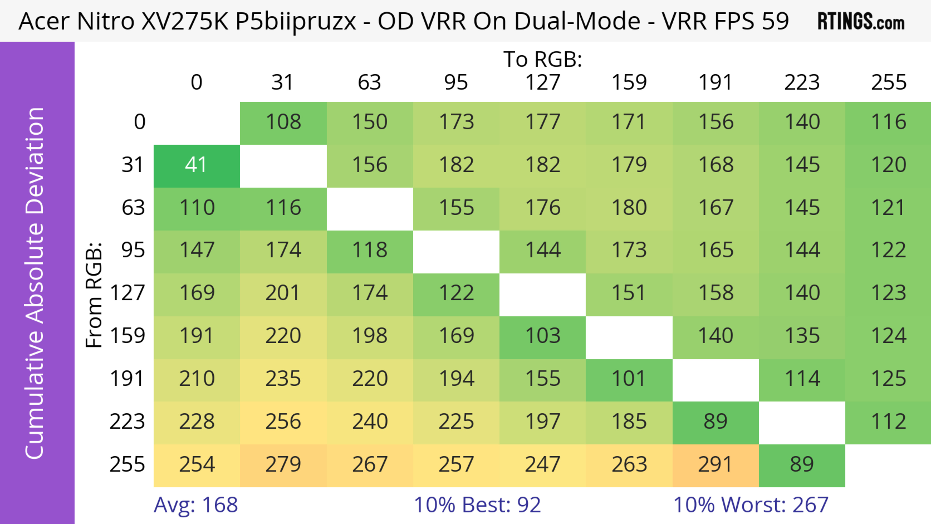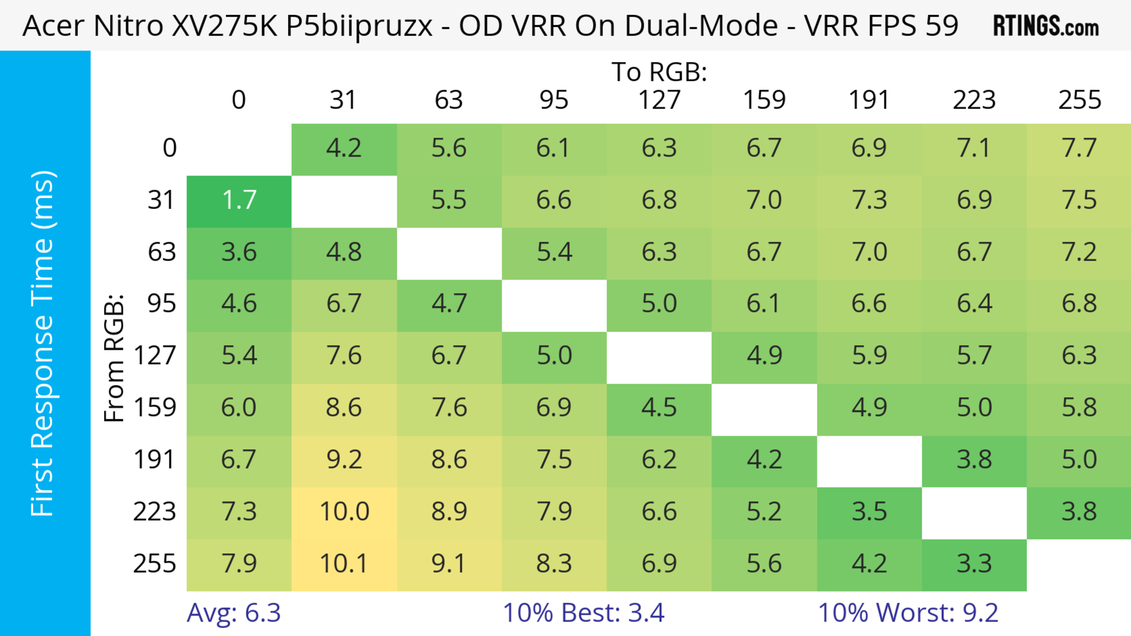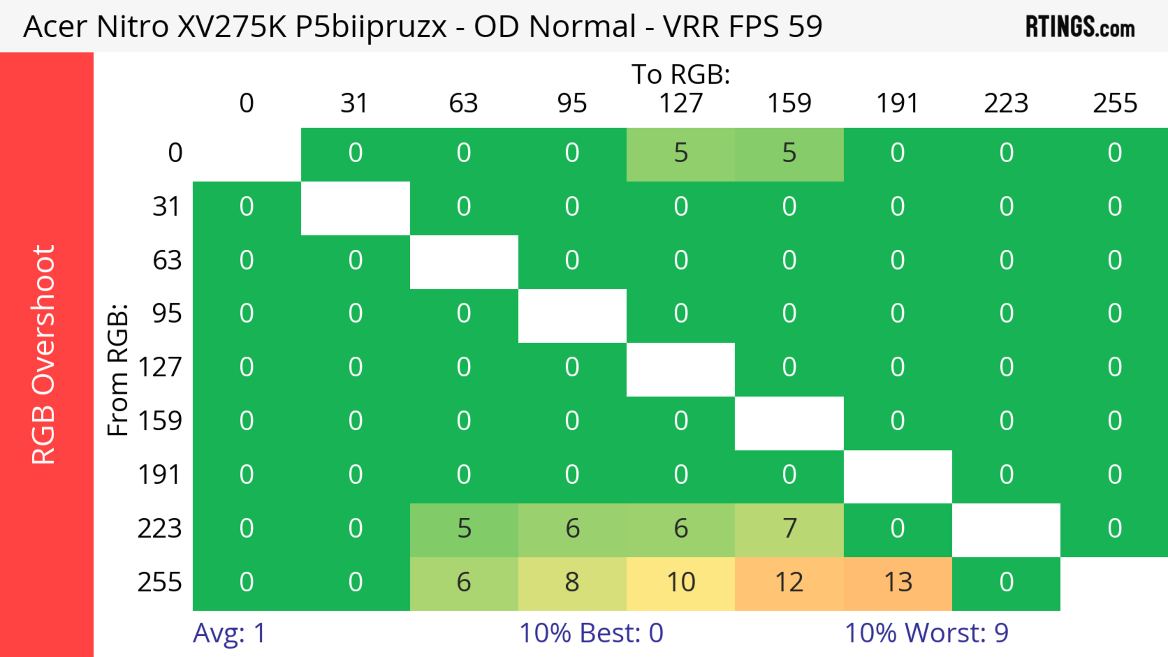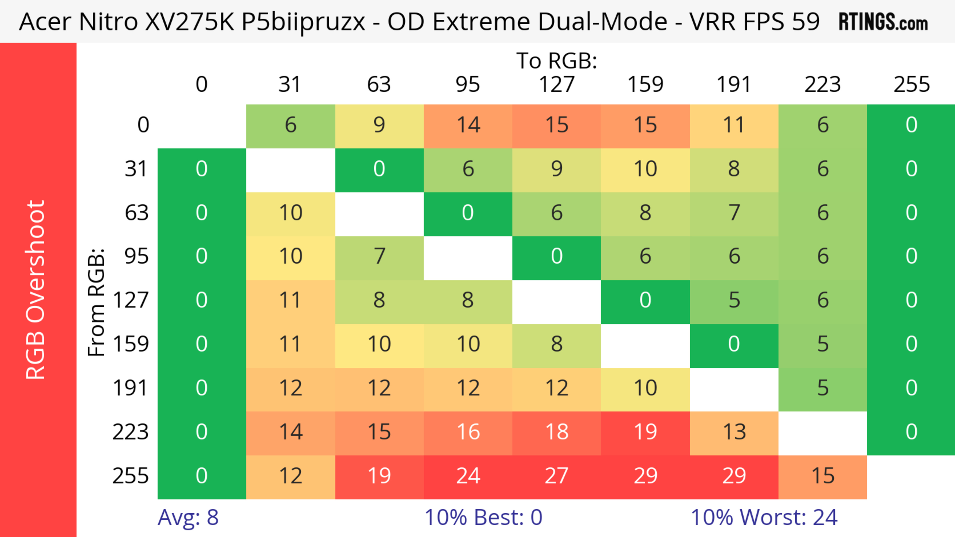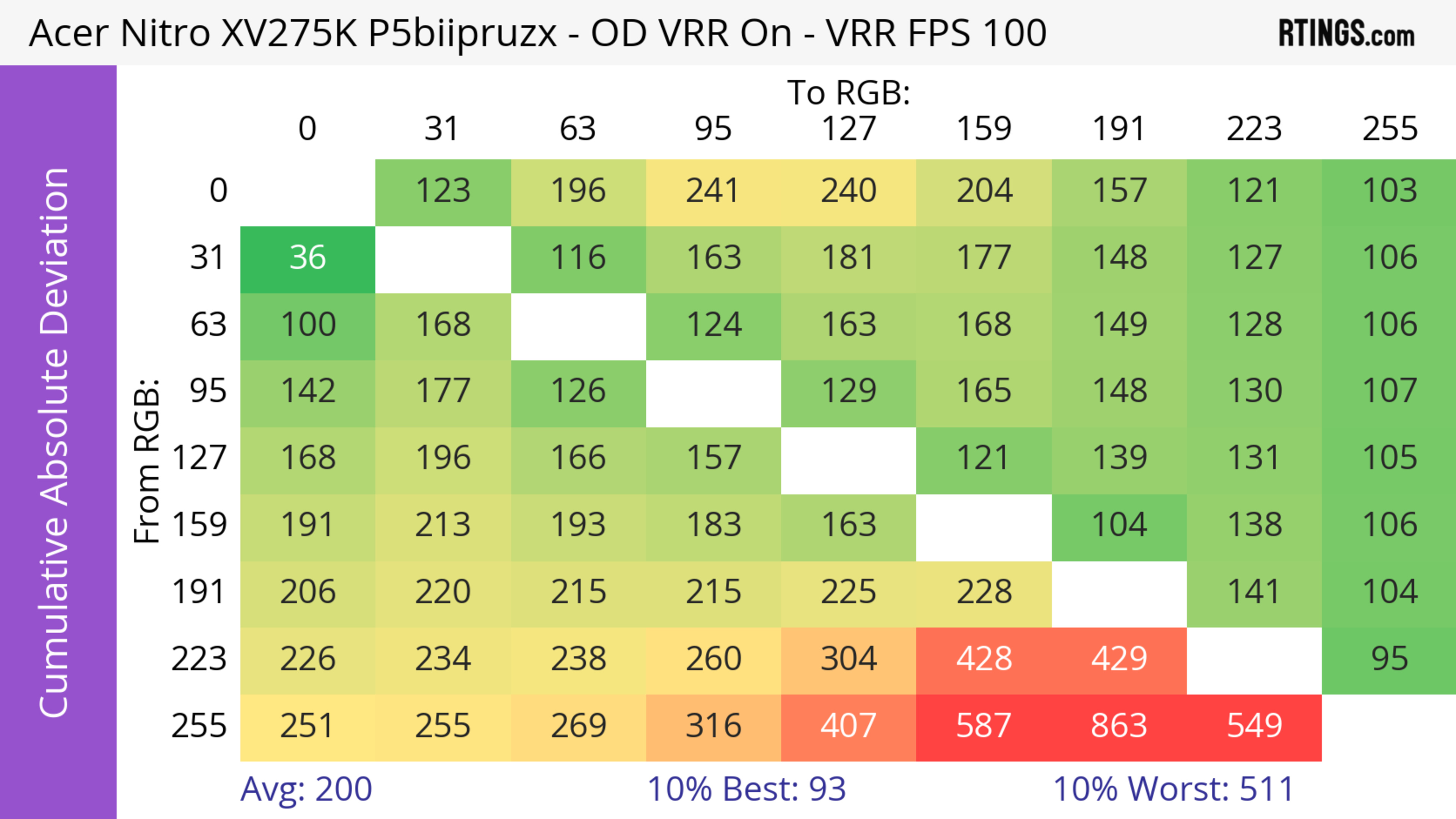 Using VRR disables any of the Over Drive modes. Unlike the older Acer Nitro XV275K P3biipruzx, the previously selected overdrive mode doesn't take effect once you enable VRR, but the 'Normal' setting with VRR off performs the same as using VRR at any refresh rate.