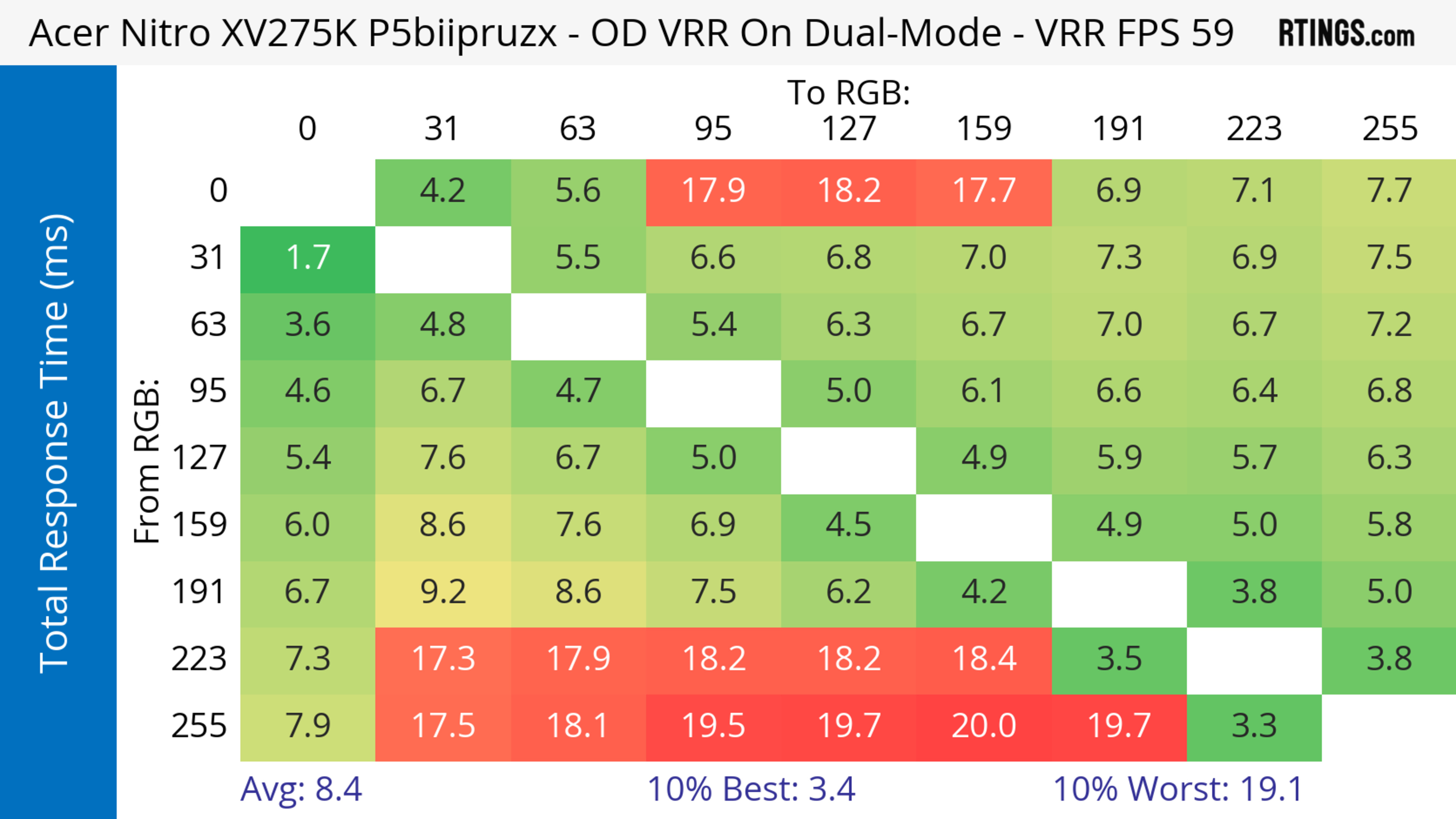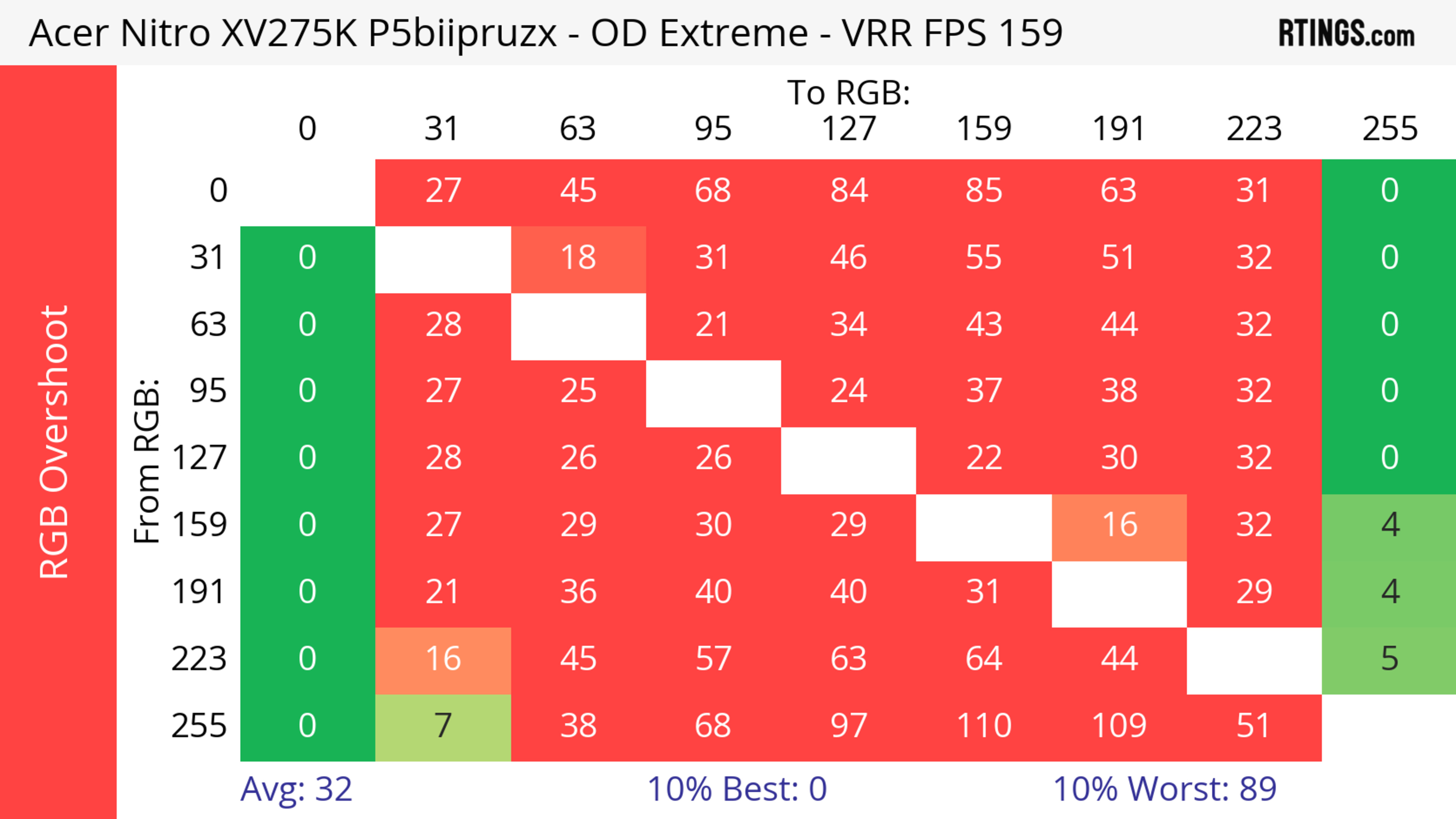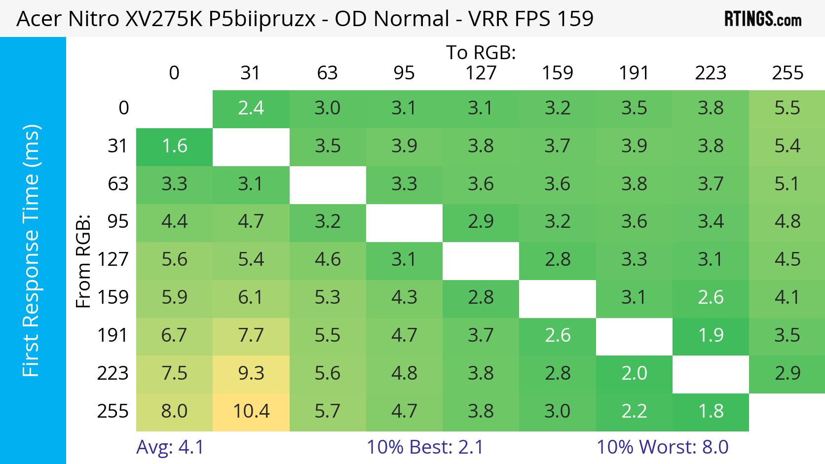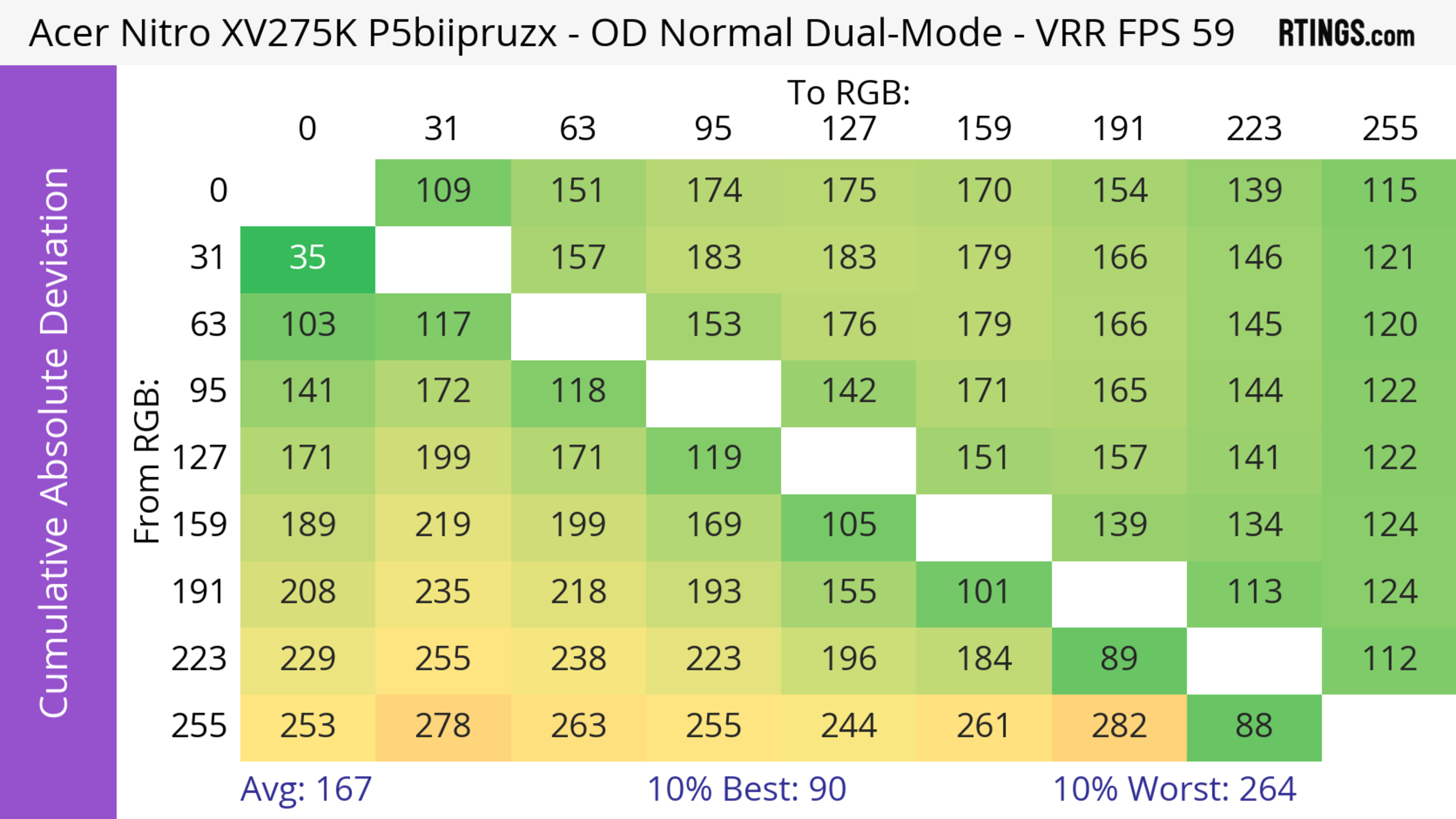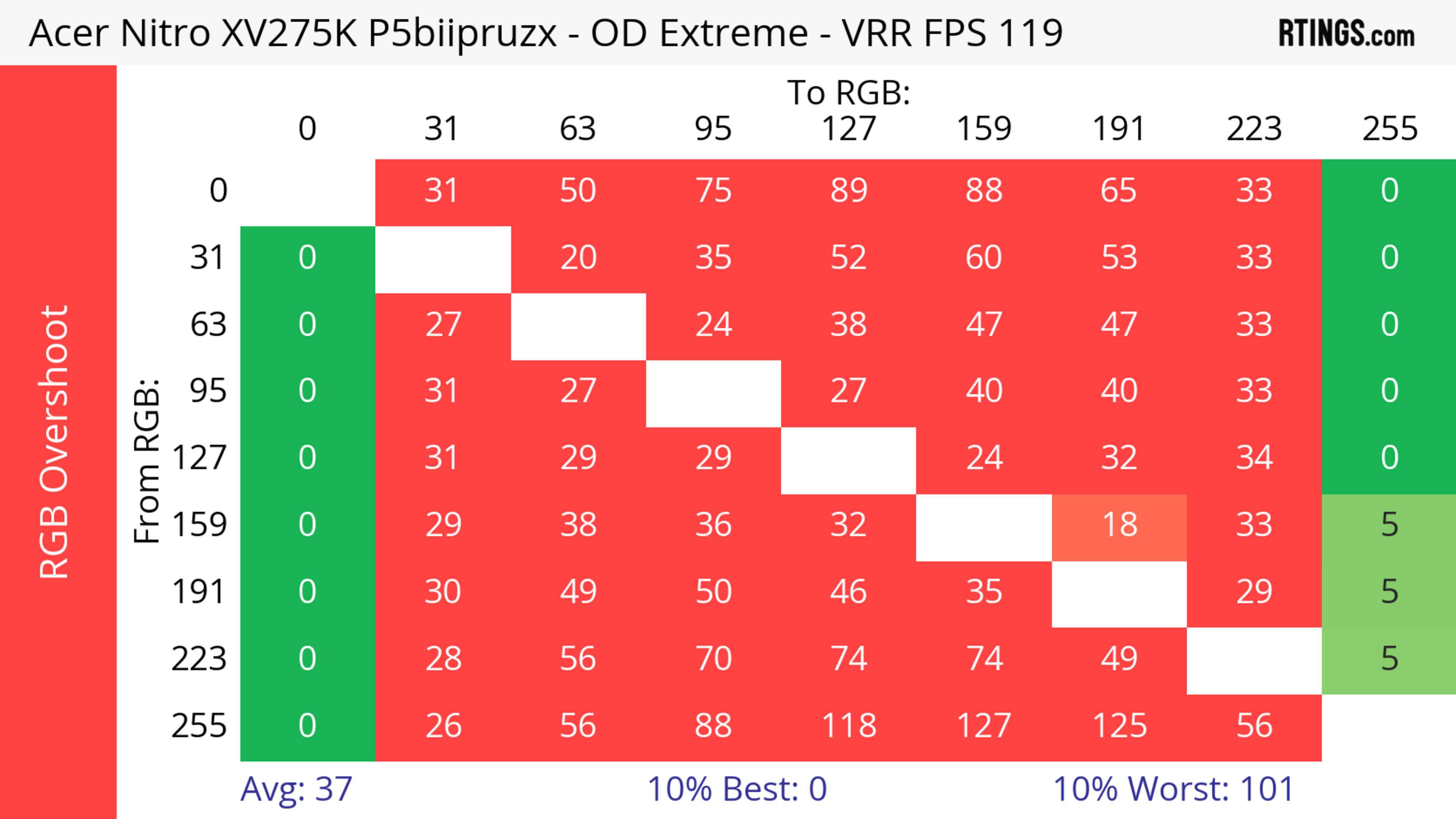 Using VRR disables any of the Over Drive modes. Unlike the older Acer Nitro XV275K P3biipruzx, the previously selected overdrive mode doesn't take effect once you enable VRR, but the 'Normal' setting with VRR off performs the same as using VRR at any refresh rate.
