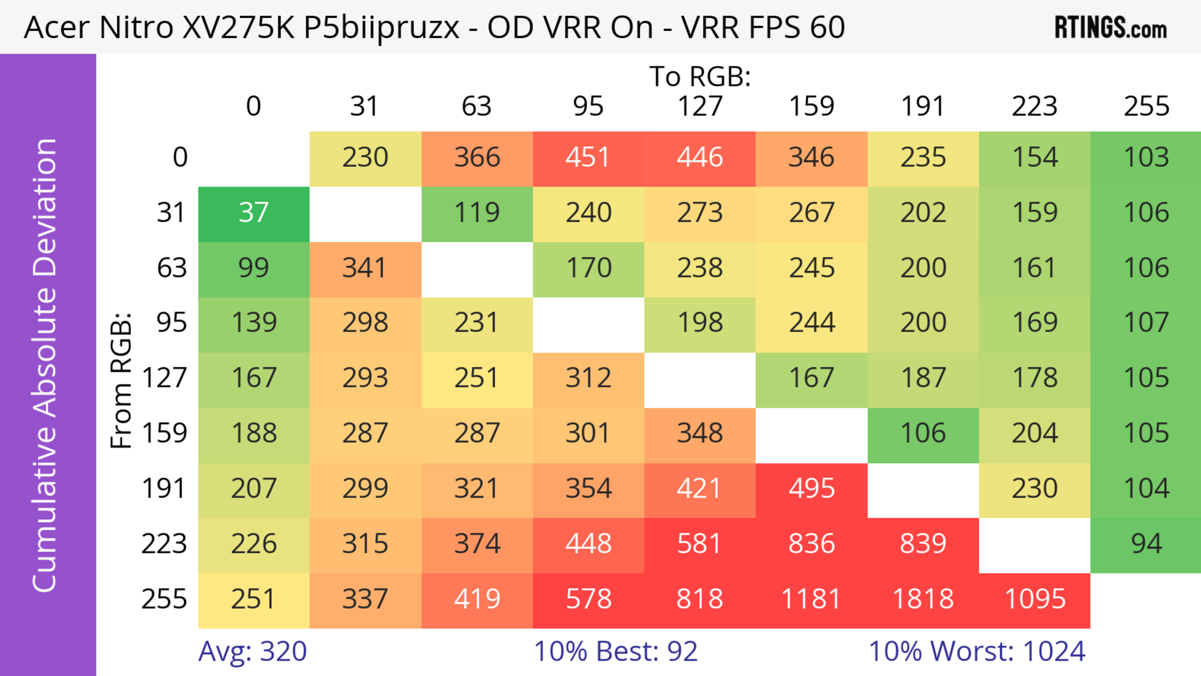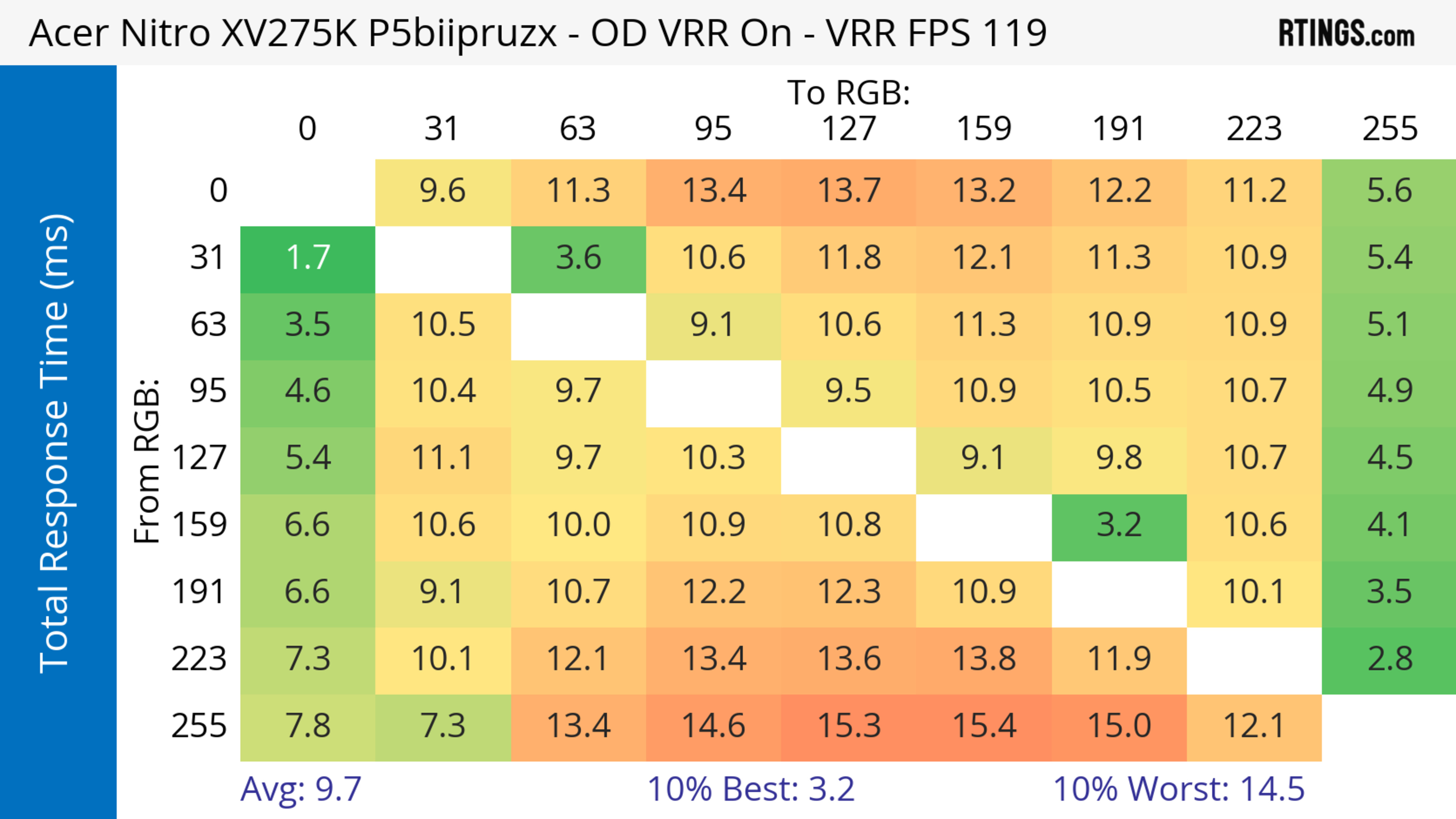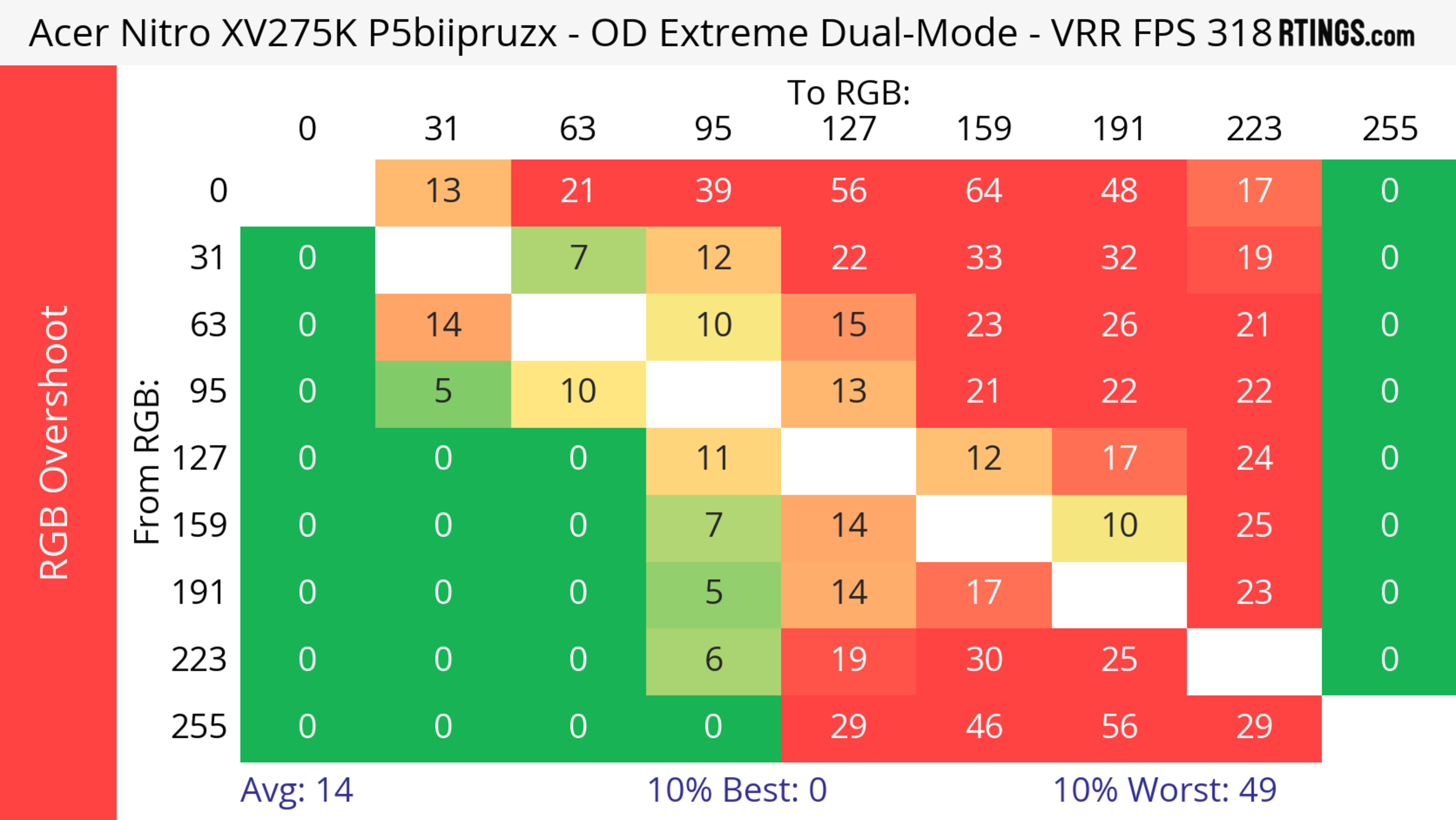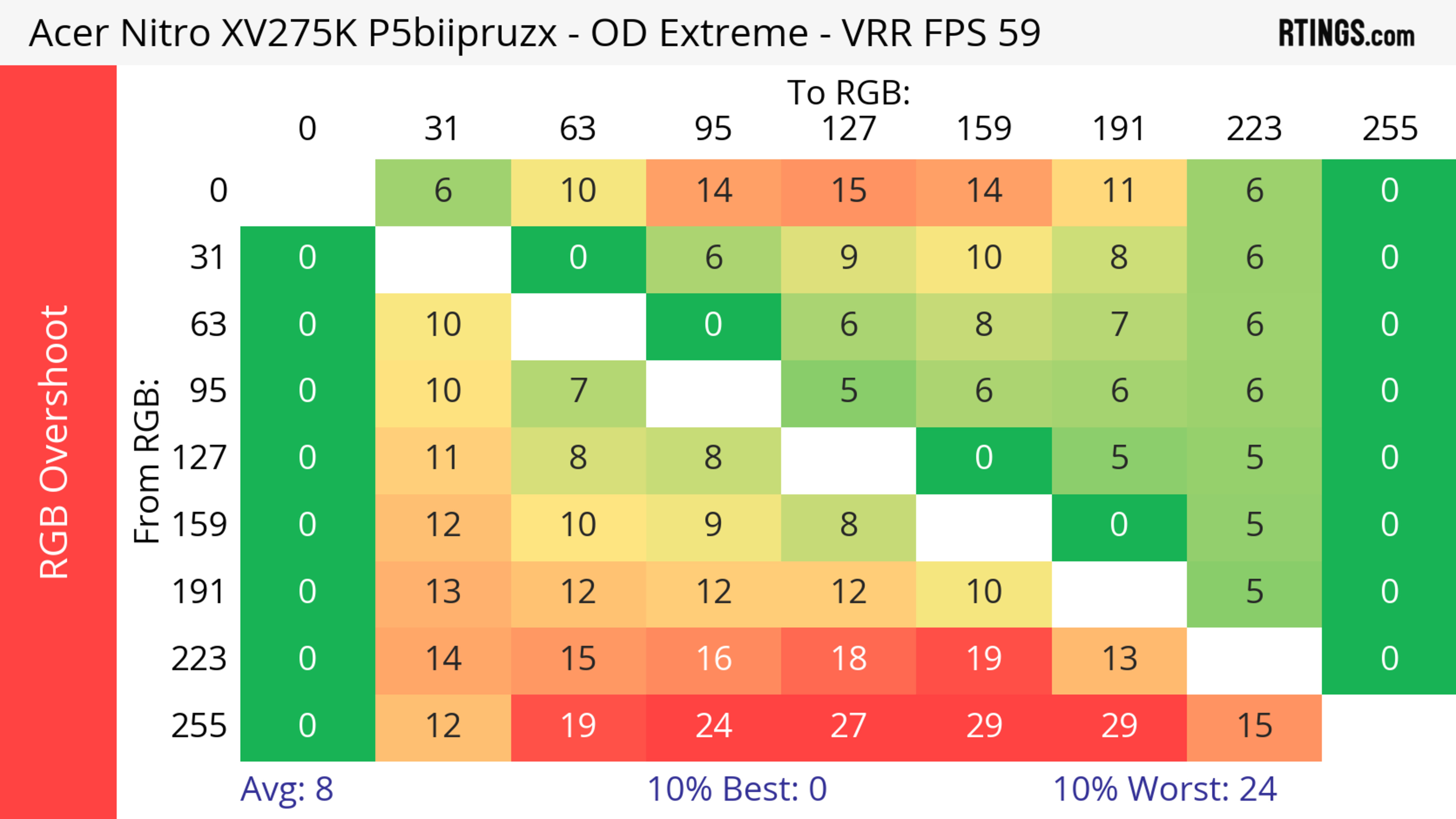 Using VRR disables any of the Over Drive modes. Unlike the older Acer Nitro XV275K P3biipruzx, the previously selected overdrive mode doesn't take effect once you enable VRR, but the 'Normal' setting with VRR off performs the same as using VRR at any refresh rate.