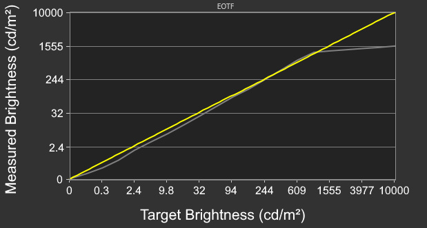 The HDR brightness is incredible. It easily fights glare even in sunny rooms and it makes highlights pop. However, it dims small highlights and has black crush, causing a loss of details in scenes like a starfield. It also has good PQ EOTF tracking, but shadows and mid-tones are darker than intended, and it has a slow roll-off at its peak brightness, so it's tone mapping before your source does.