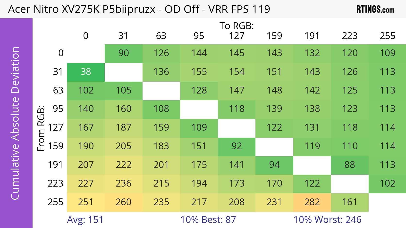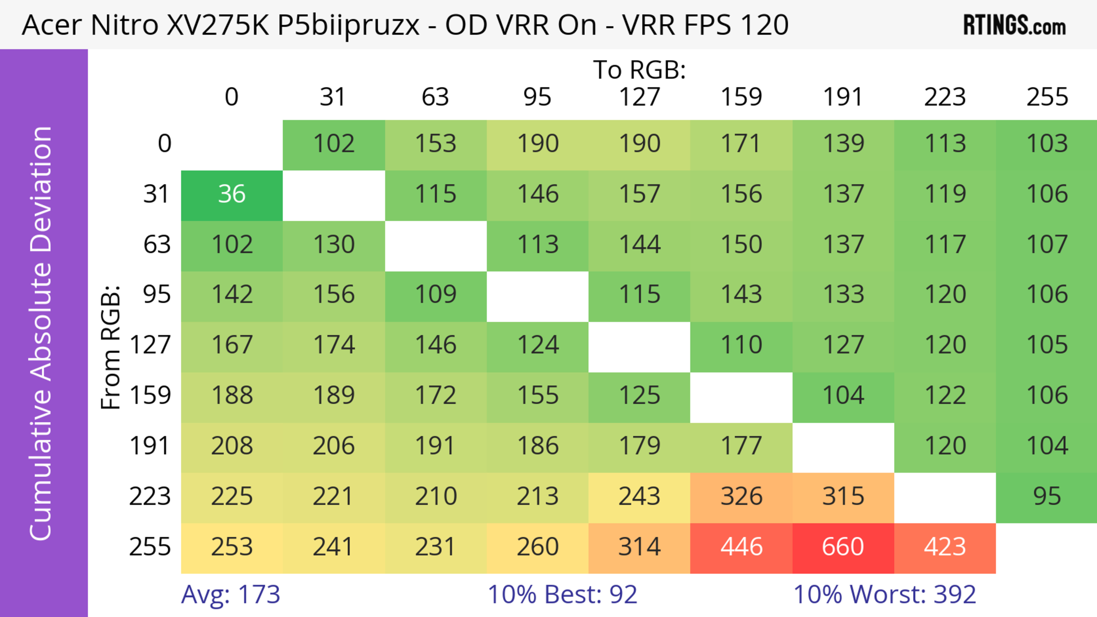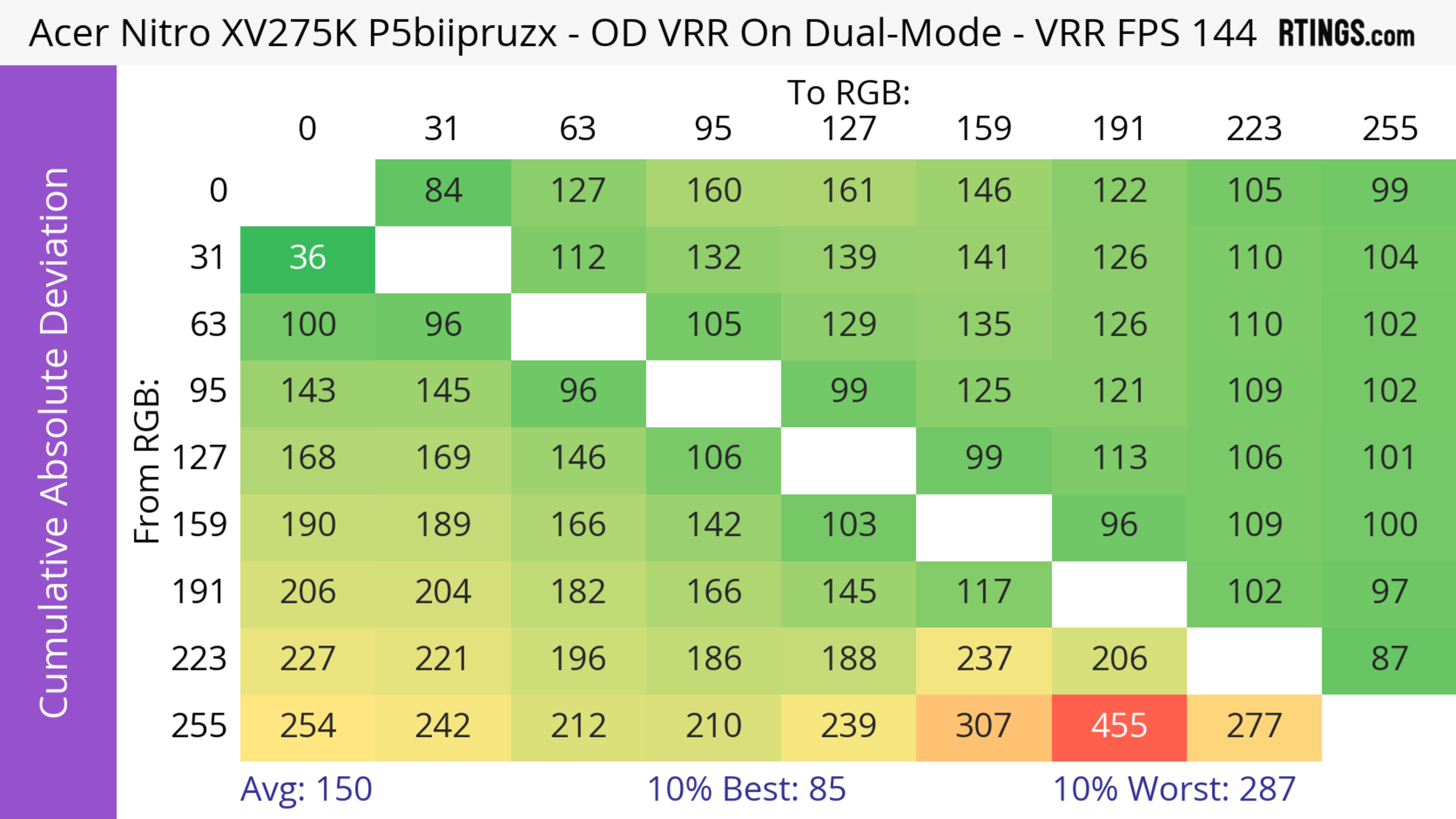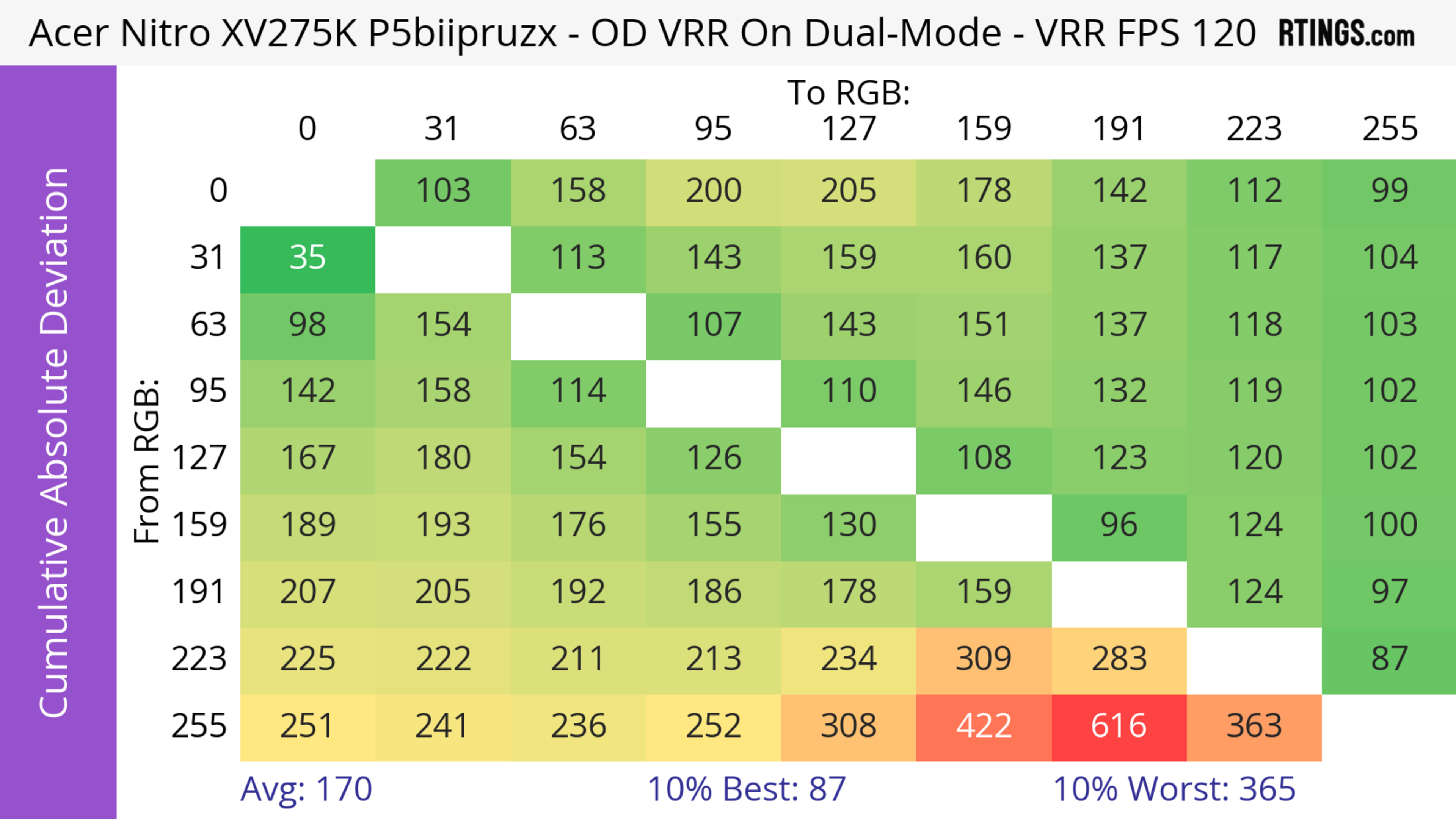 The Acer XV275K P5 has decent motion handling across its VRR range. Fast-moving objects look sharp for the most part, but they have inverse ghosting, particularly at low refresh rates. Using the 1080p mode results in smoother motion at higher refresh rates, but for the most part, it performs like the 4k mode at 165Hz and below. However, Low Framerate Compensation (LFC) kicks in earlier in the 1080p mode, as it starts at 61 fps, which you can see in the VRR motion performance graph. With 60 fps content in the 1080p mode, the screen is actually refreshing at 120Hz.