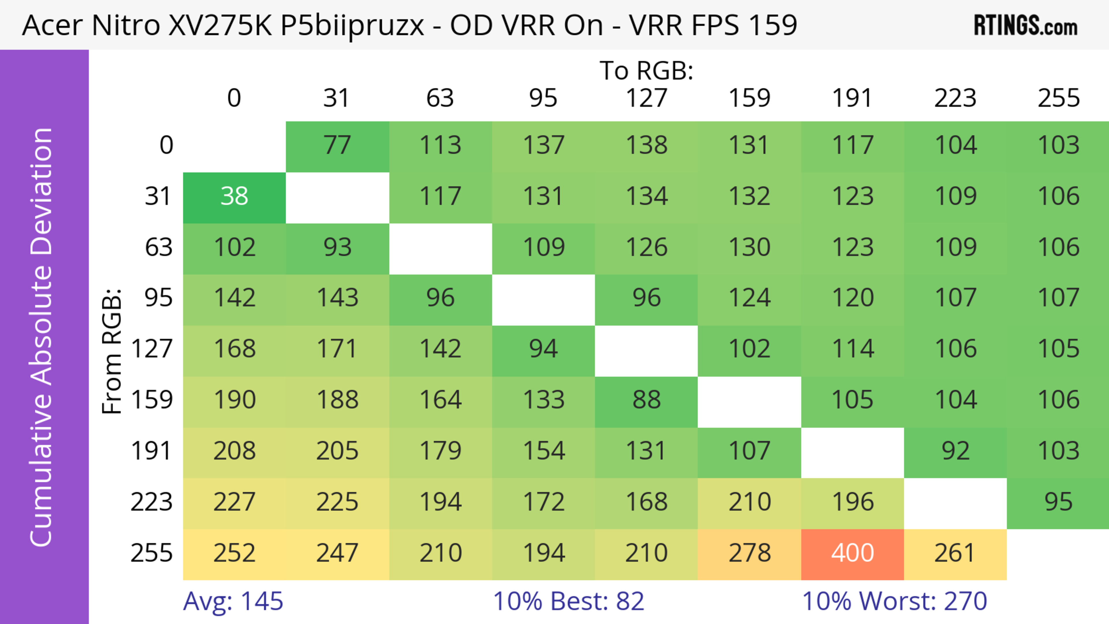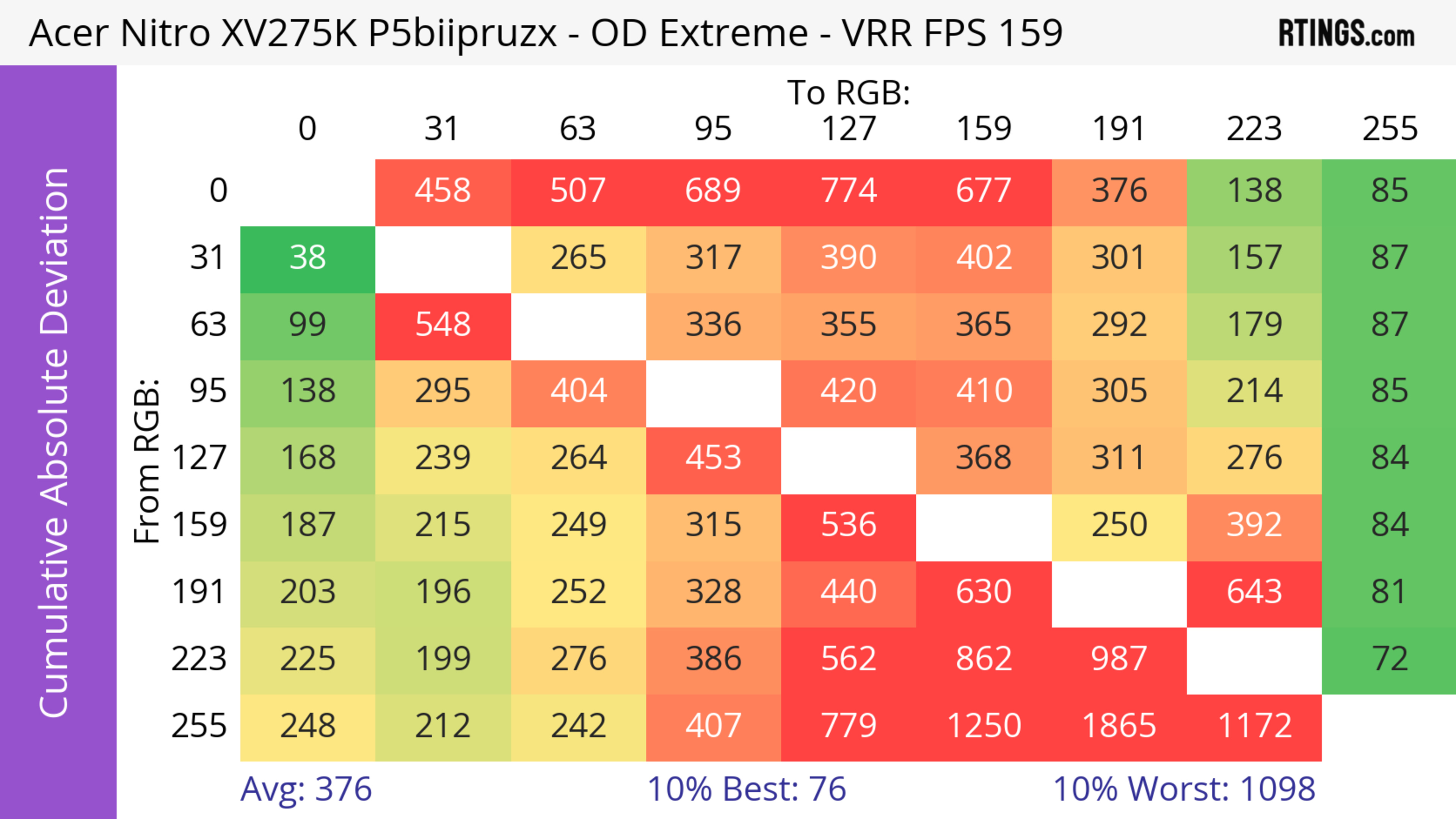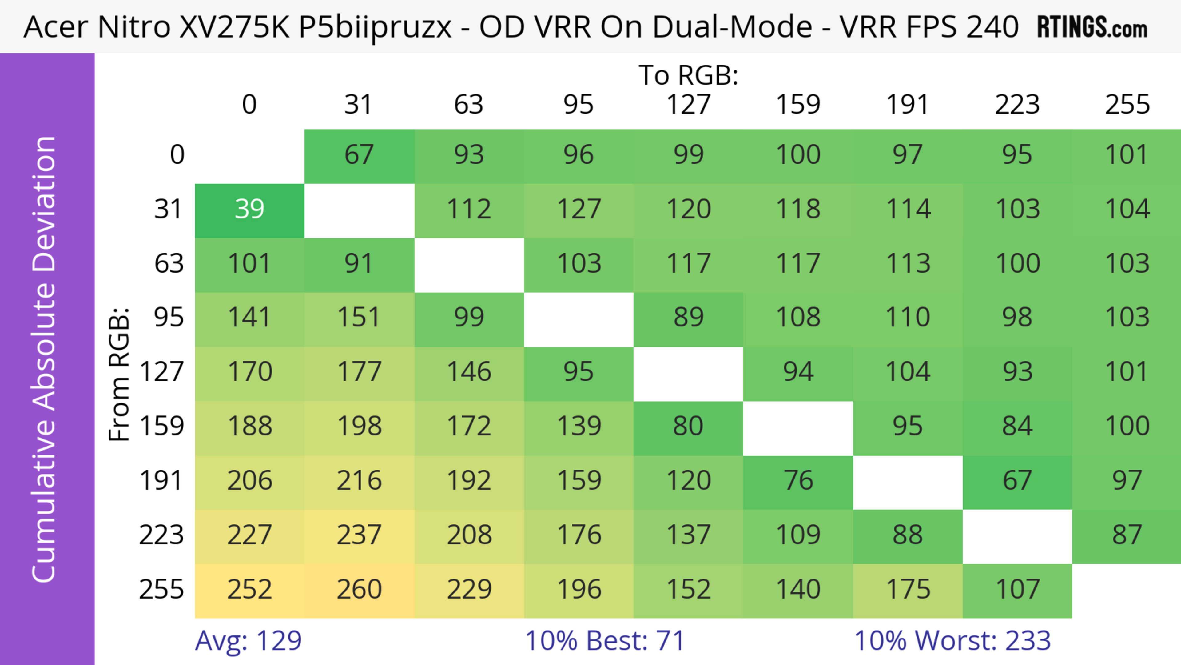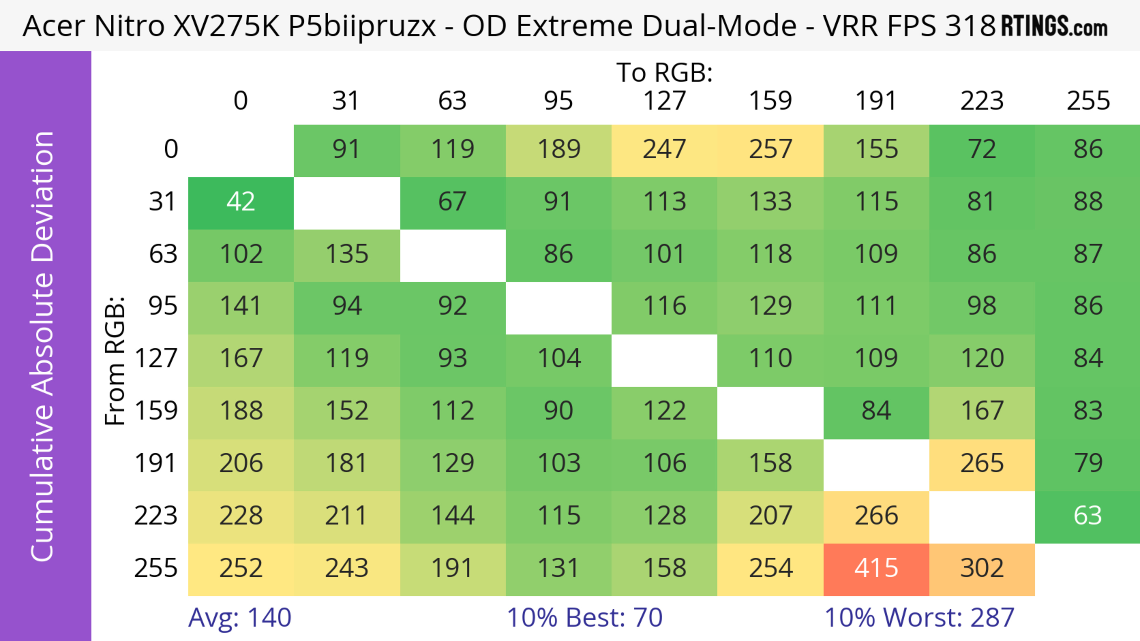 The Acer XV275K P5 has decent motion handling across its VRR range. Fast-moving objects look sharp for the most part, but they have inverse ghosting, particularly at low refresh rates. Using the 1080p mode results in smoother motion at higher refresh rates, but for the most part, it performs like the 4k mode at 165Hz and below. However, Low Framerate Compensation (LFC) kicks in earlier in the 1080p mode, as it starts at 61 fps, which you can see in the VRR motion performance graph. With 60 fps content in the 1080p mode, the screen is actually refreshing at 120Hz.