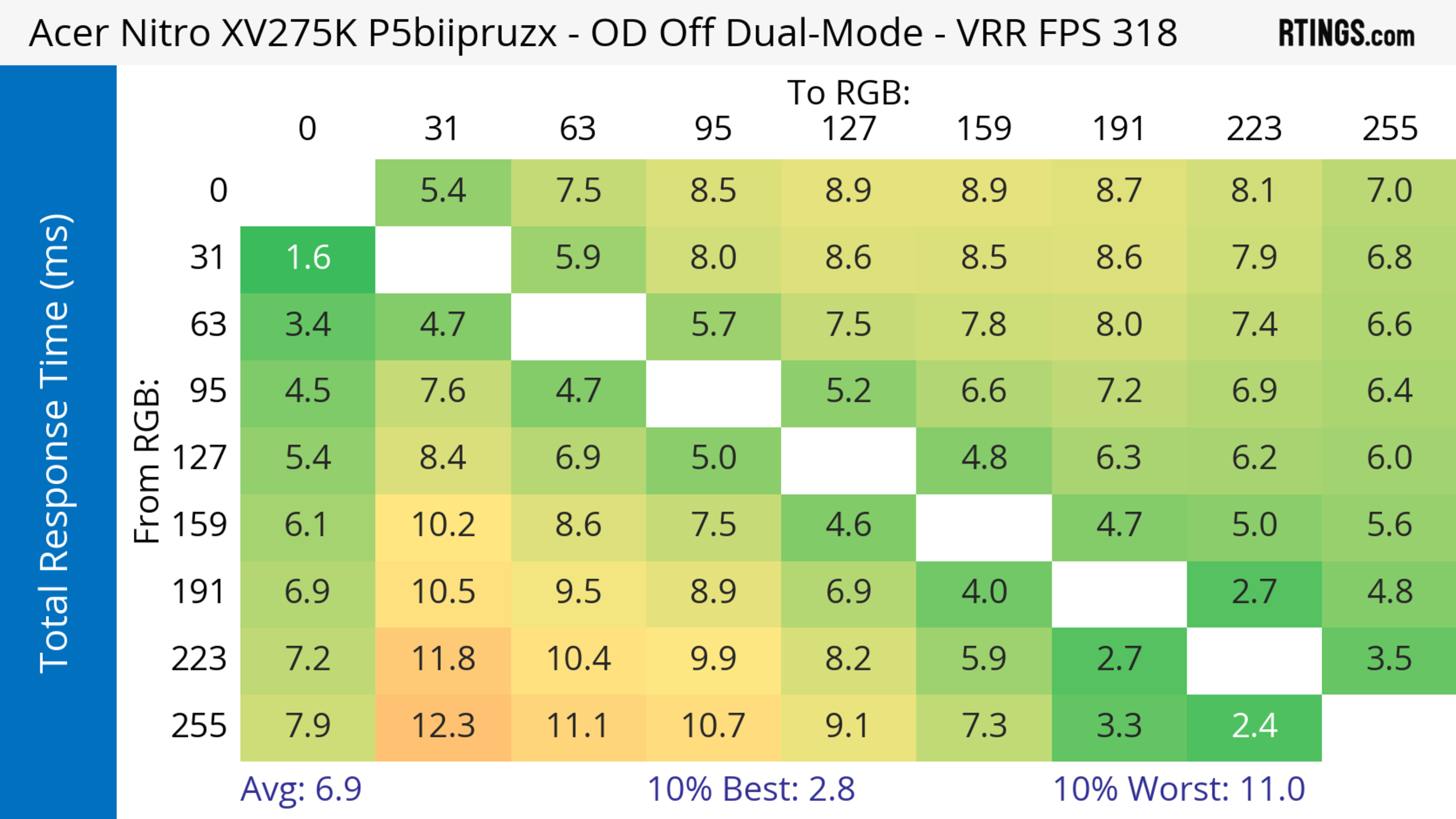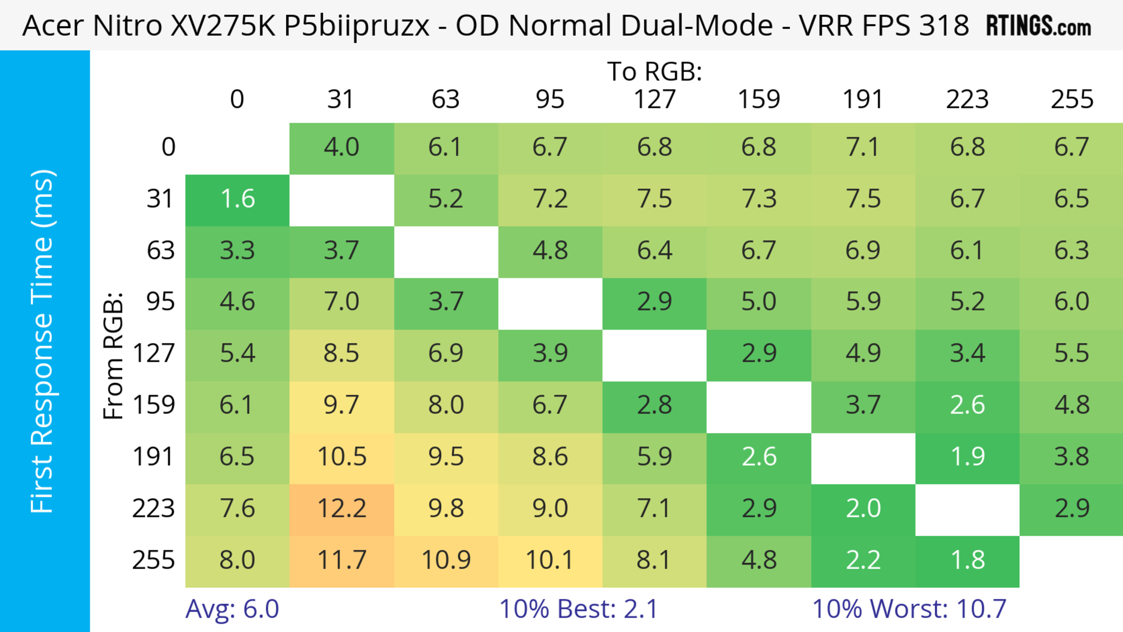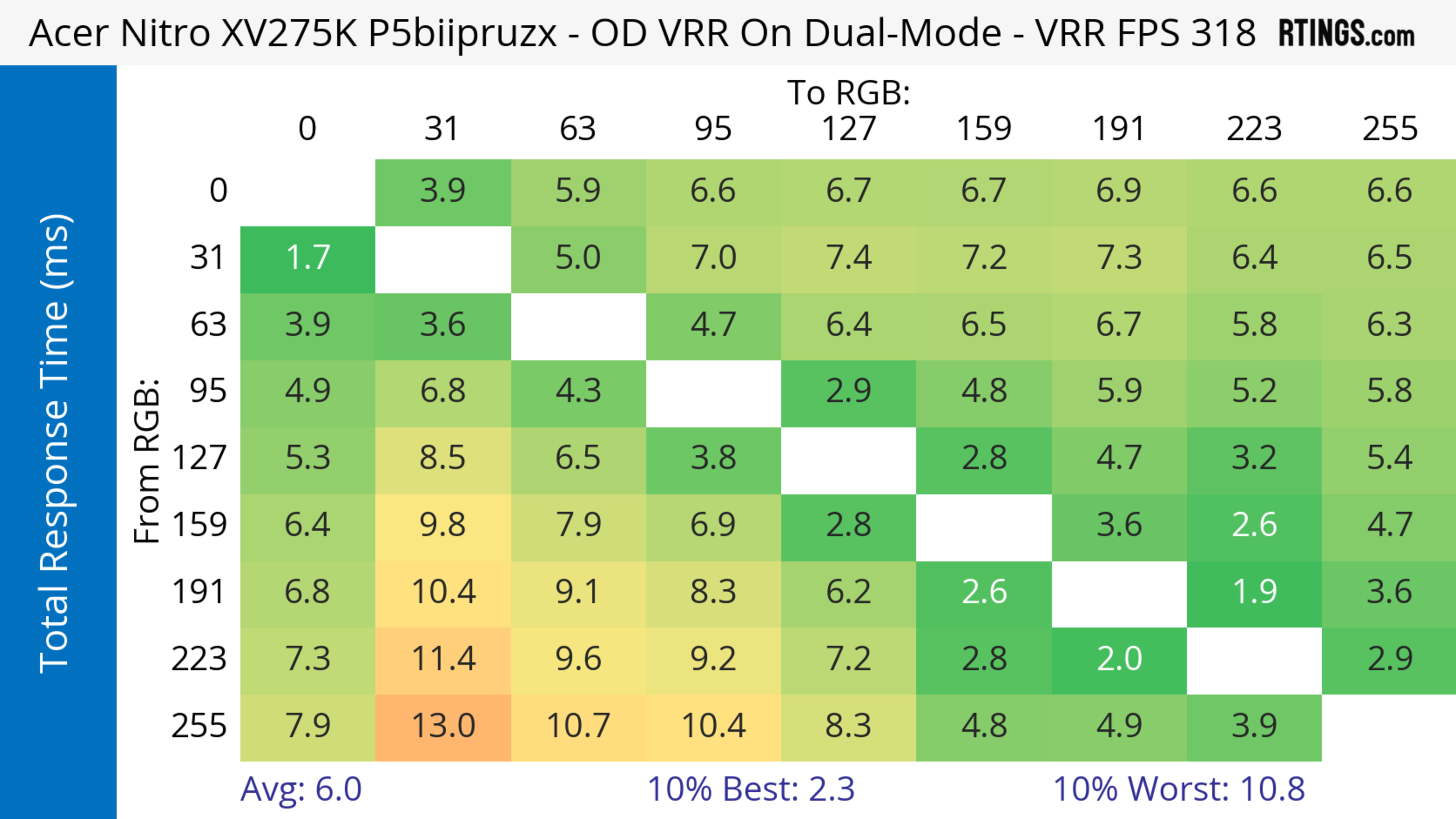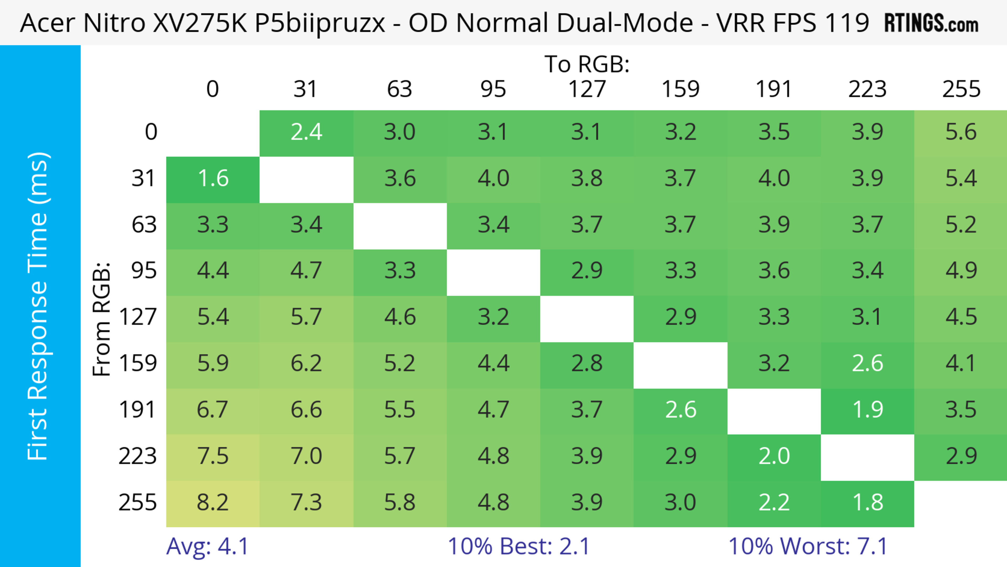 The Acer Nitro XV275K P5 has low input lag at any refresh rate, including at 60Hz. These results are in the 4k mode, but you can also see them in the 1080p mode:
