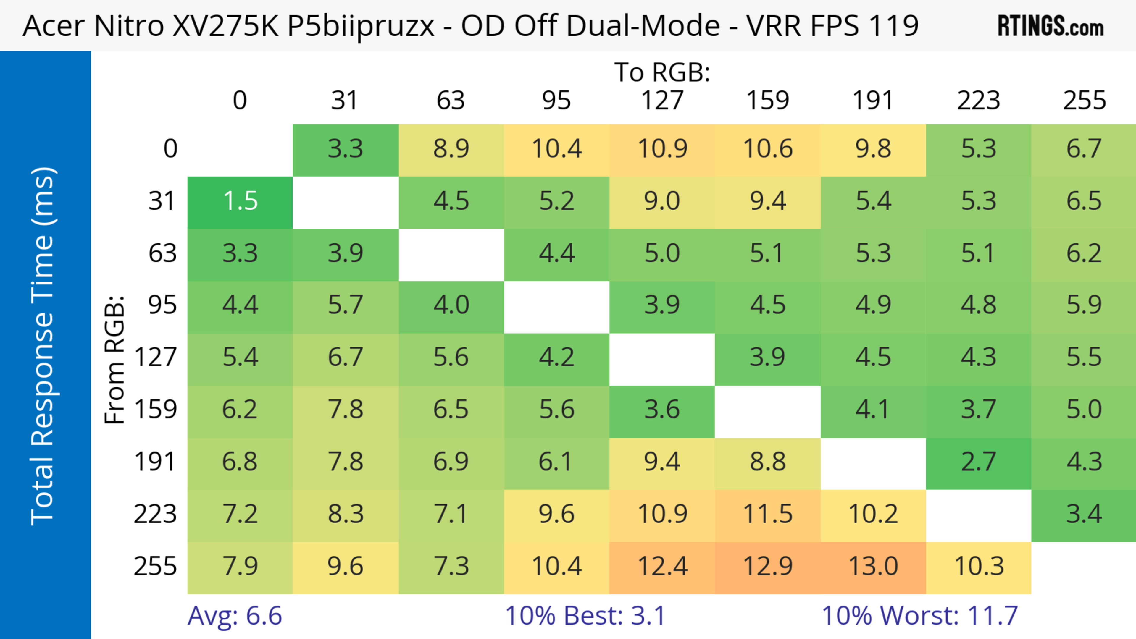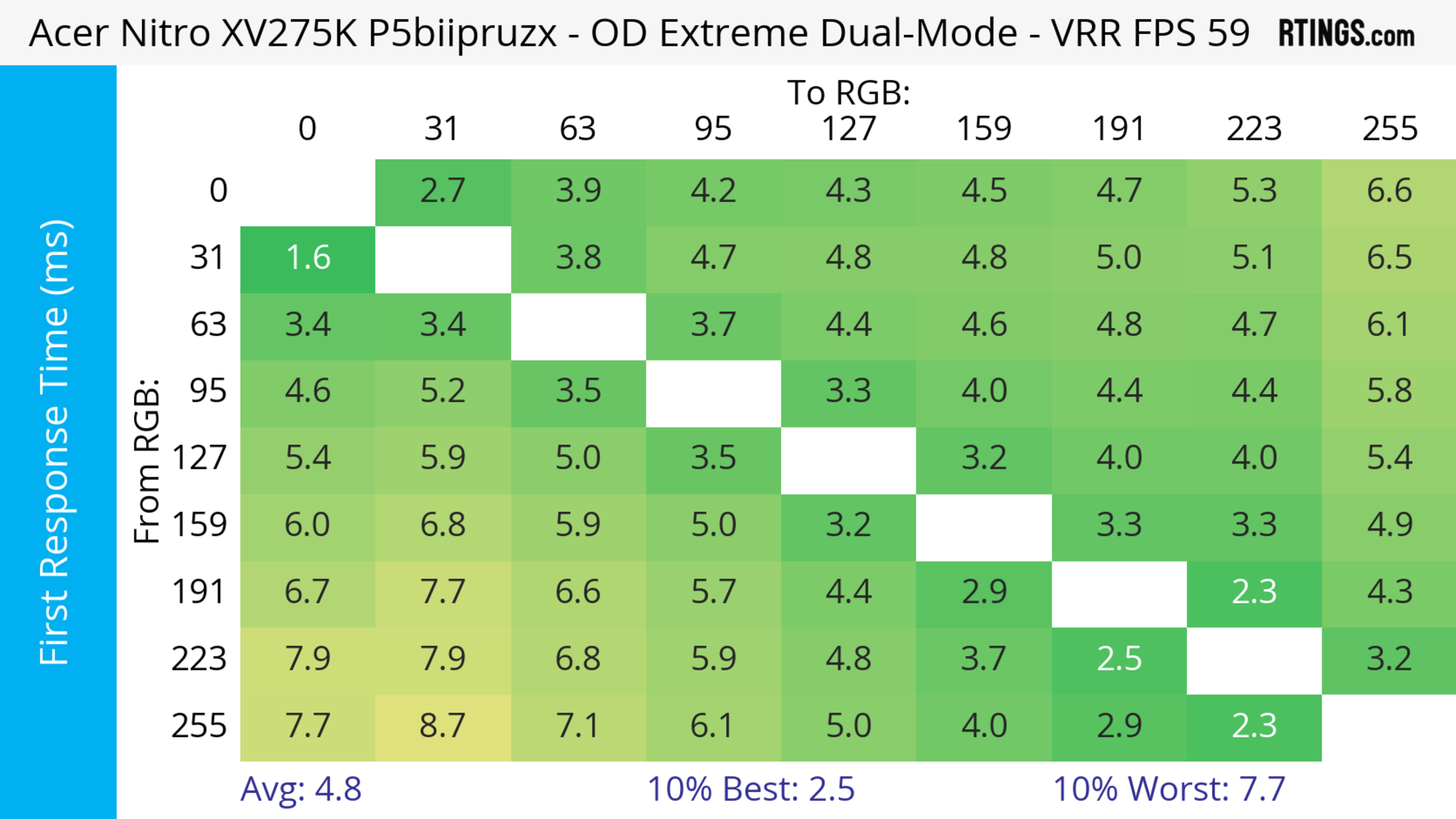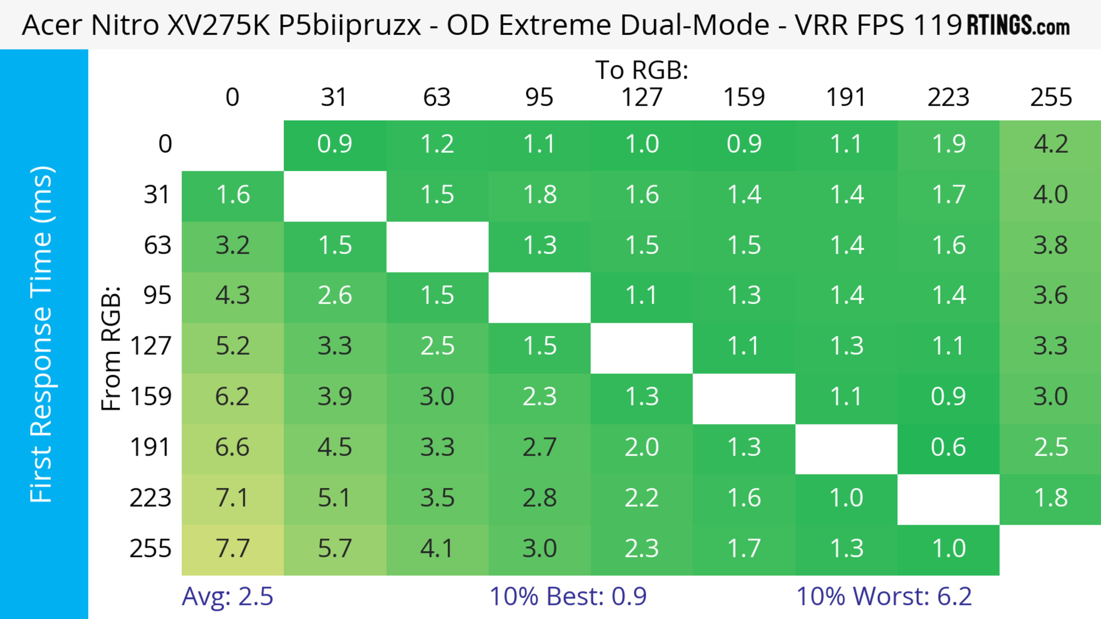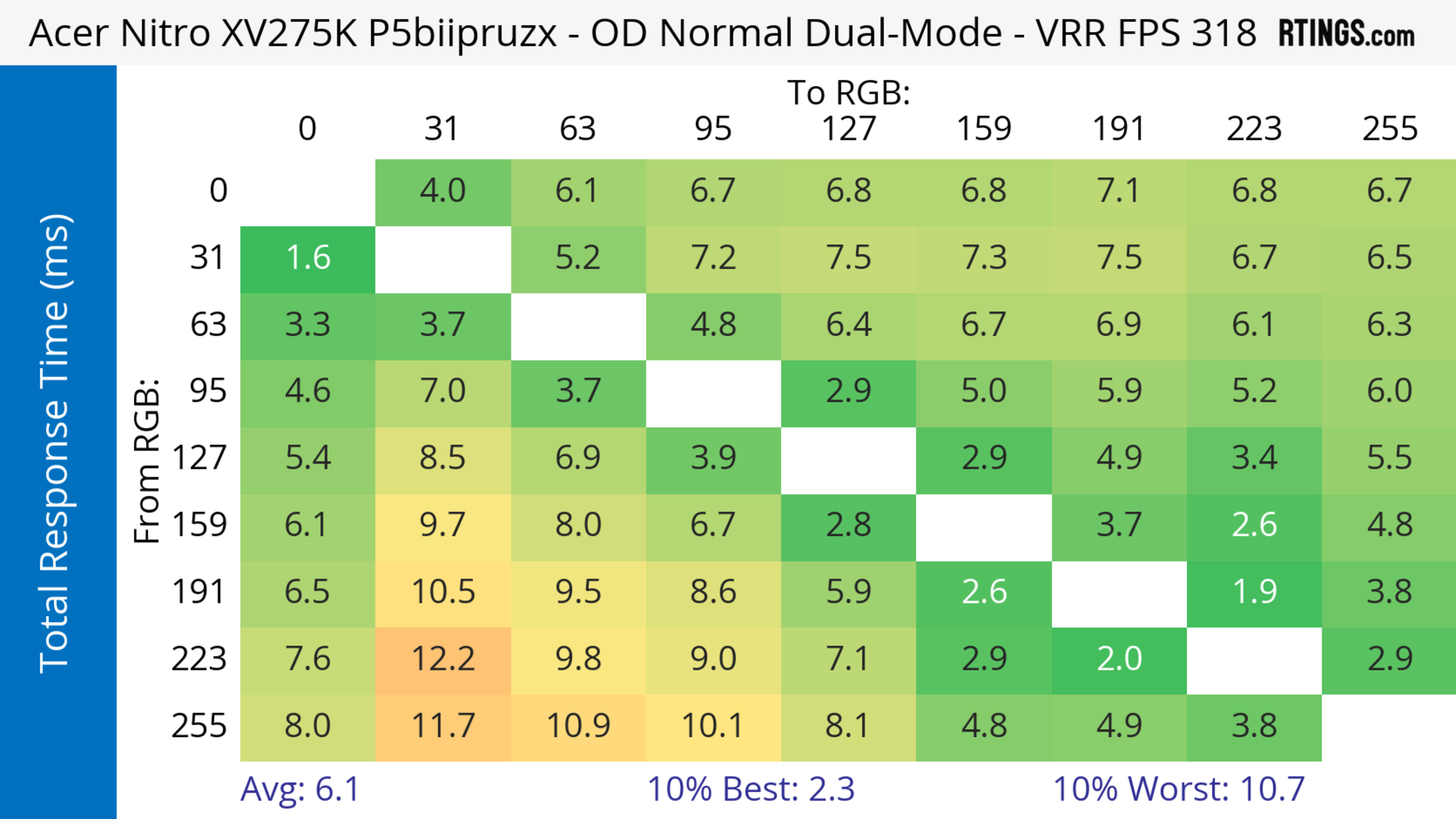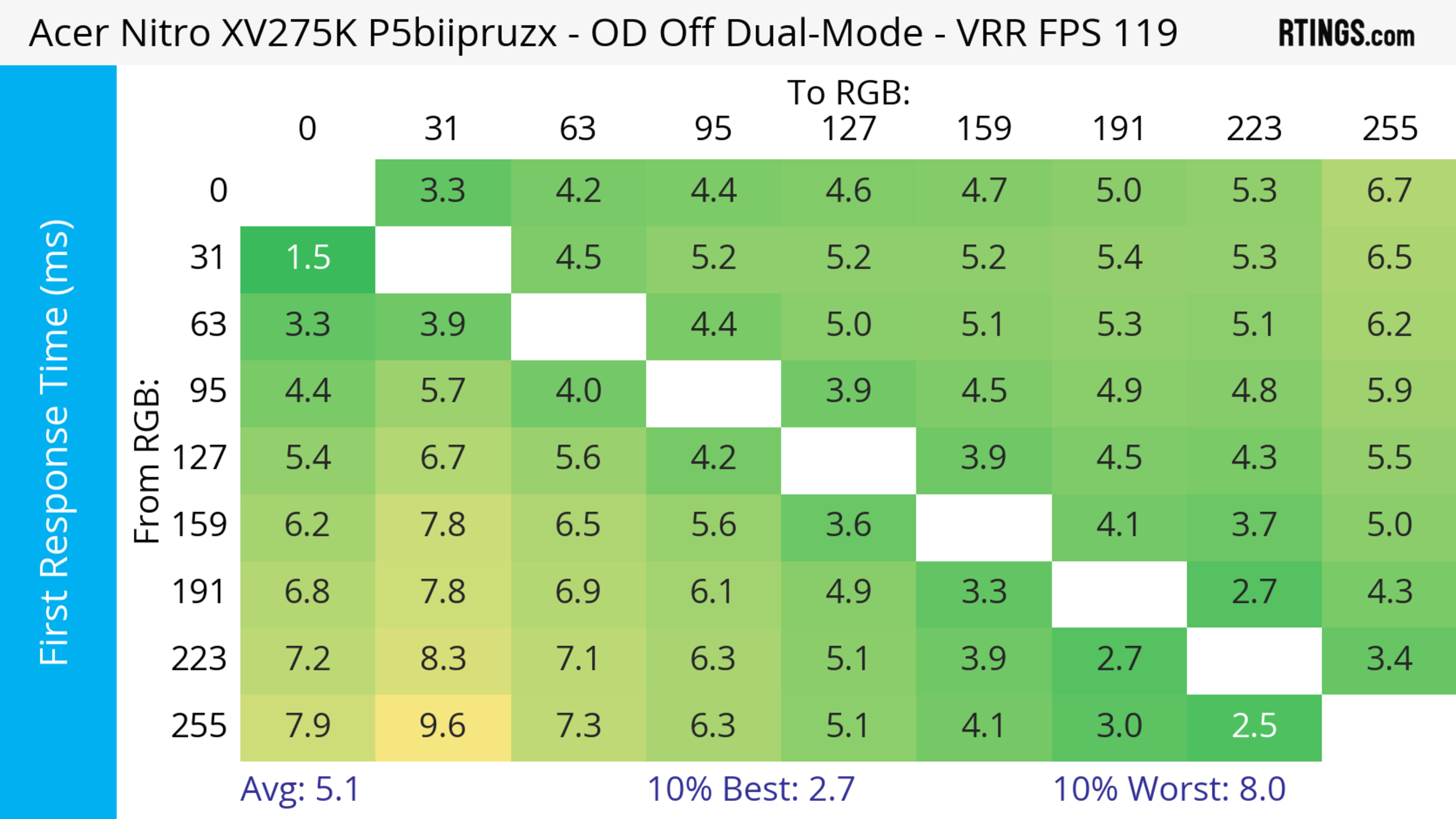 The Acer Nitro XV275K P5 has low input lag at any refresh rate, including at 60Hz. These results are in the 4k mode, but you can also see them in the 1080p mode: