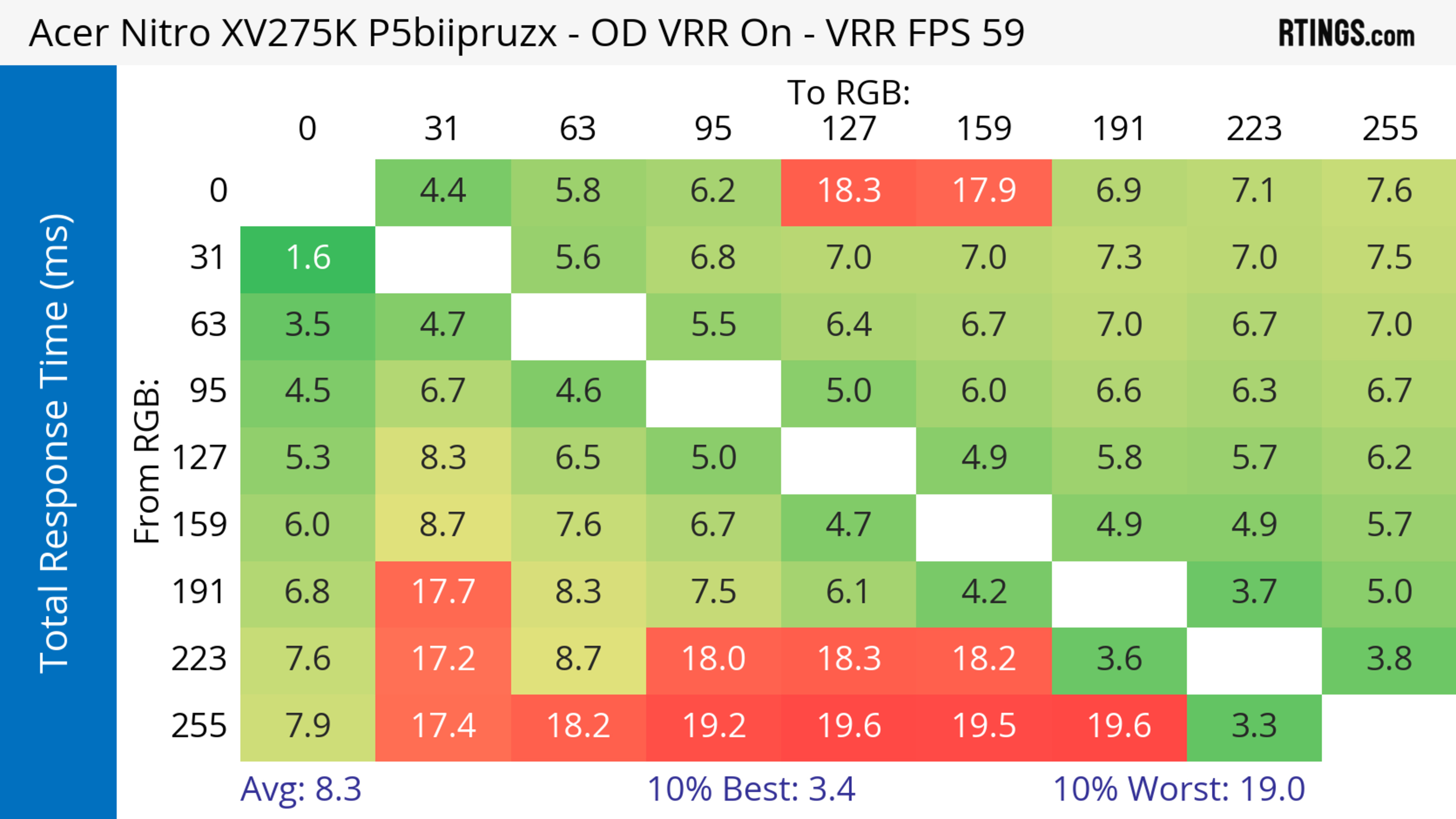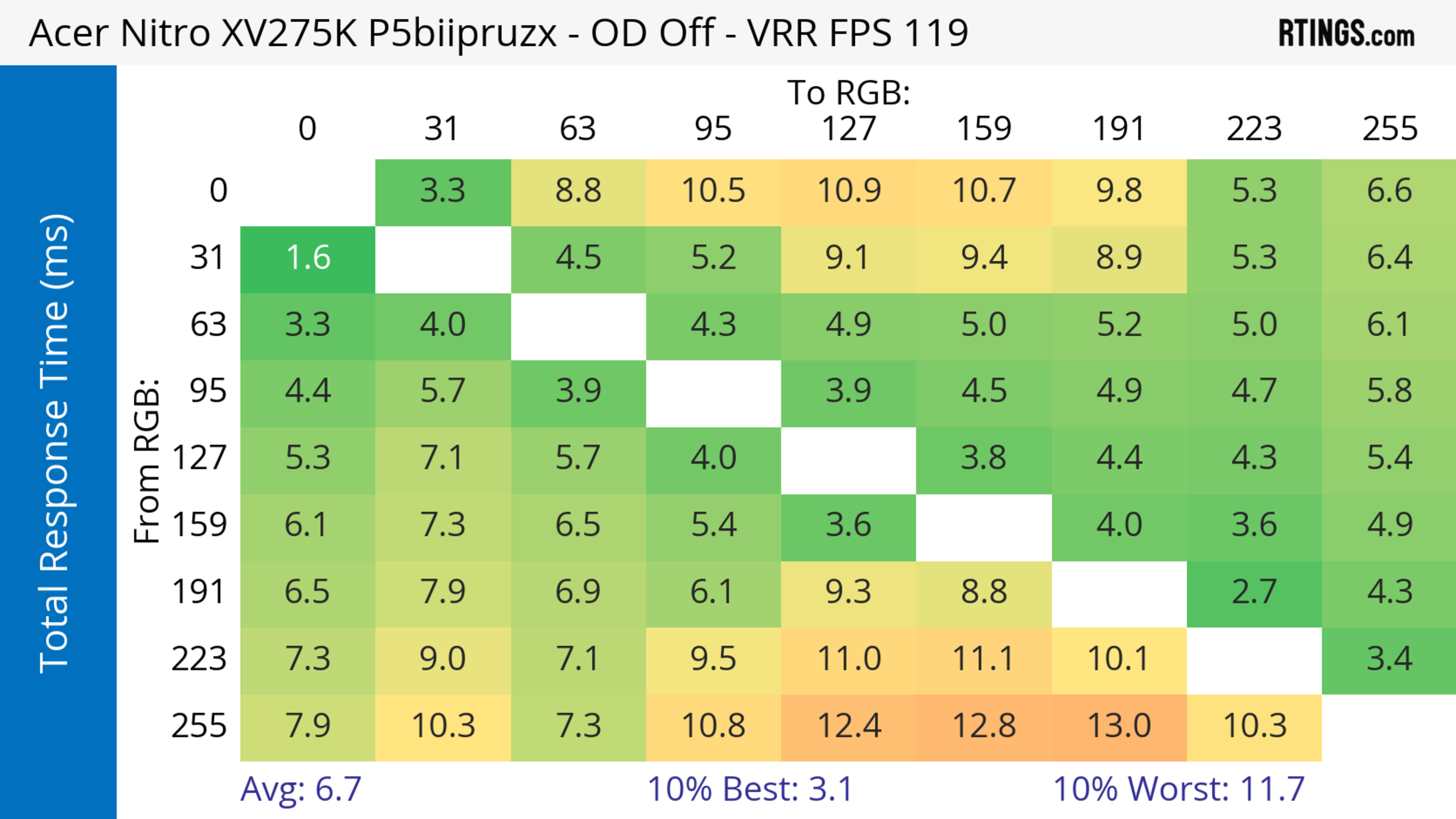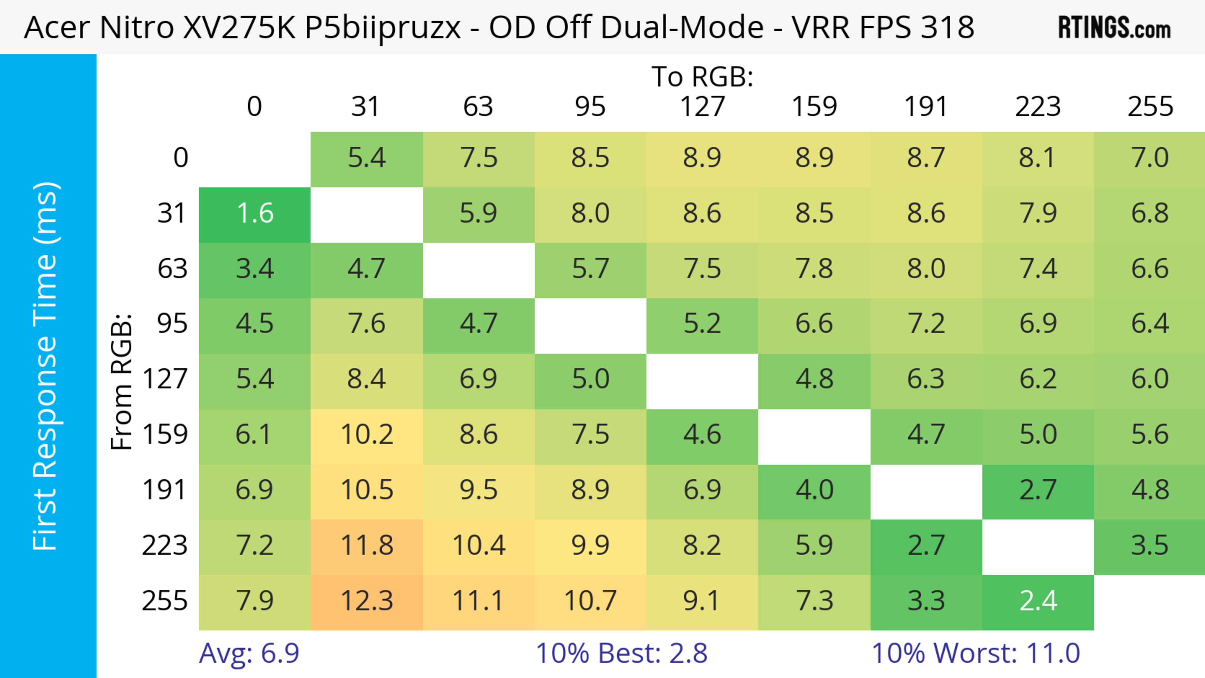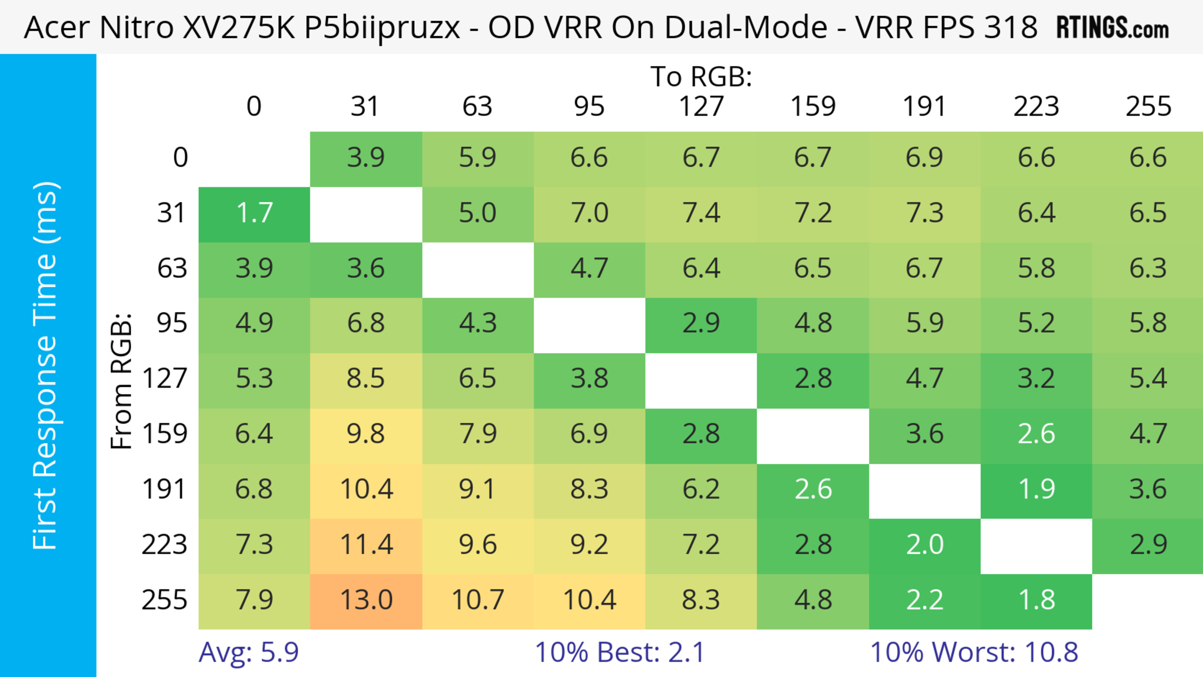 The Acer Nitro XV275K P5 has low input lag at any refresh rate, including at 60Hz. These results are in the 4k mode, but you can also see them in the 1080p mode: