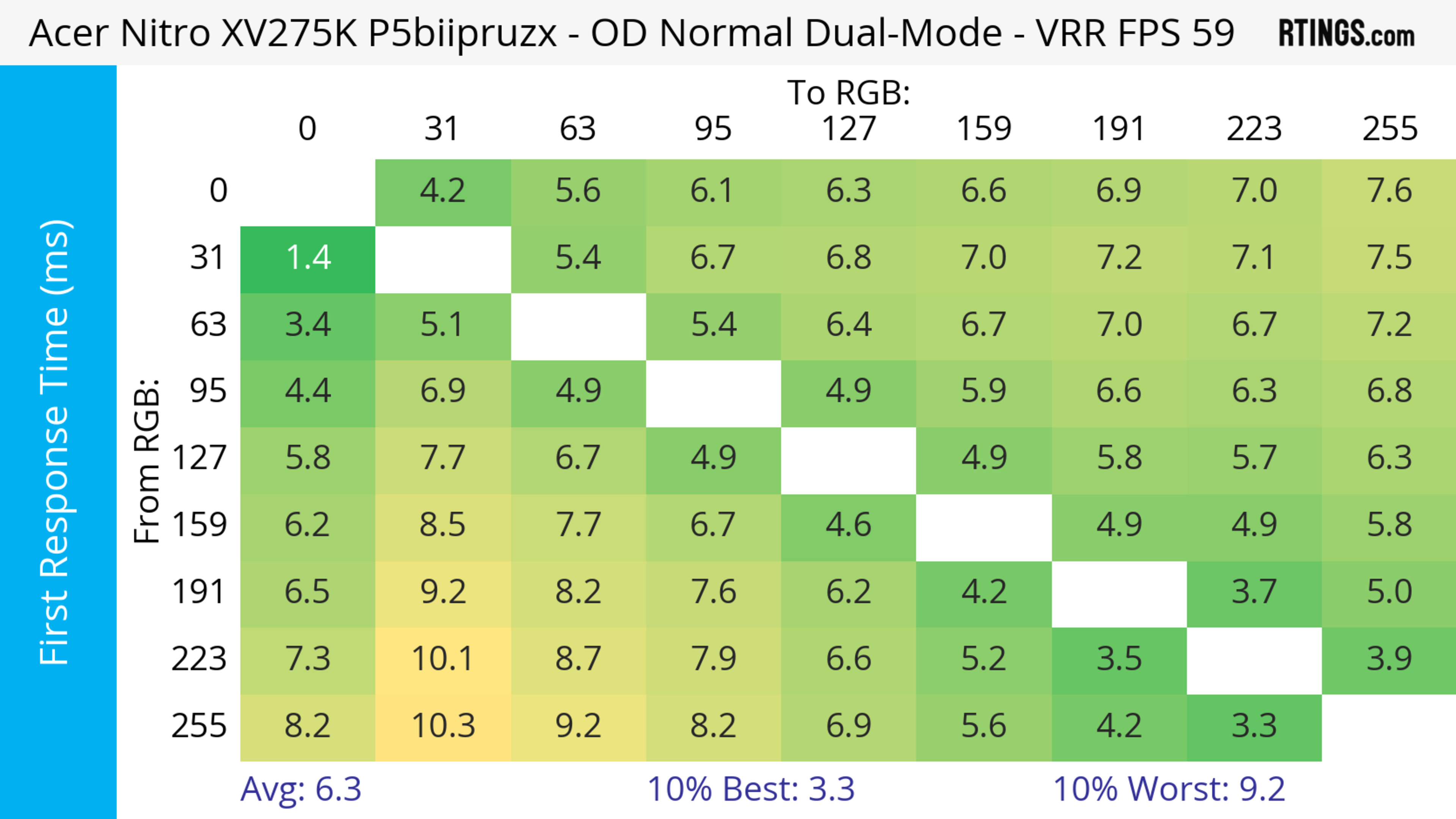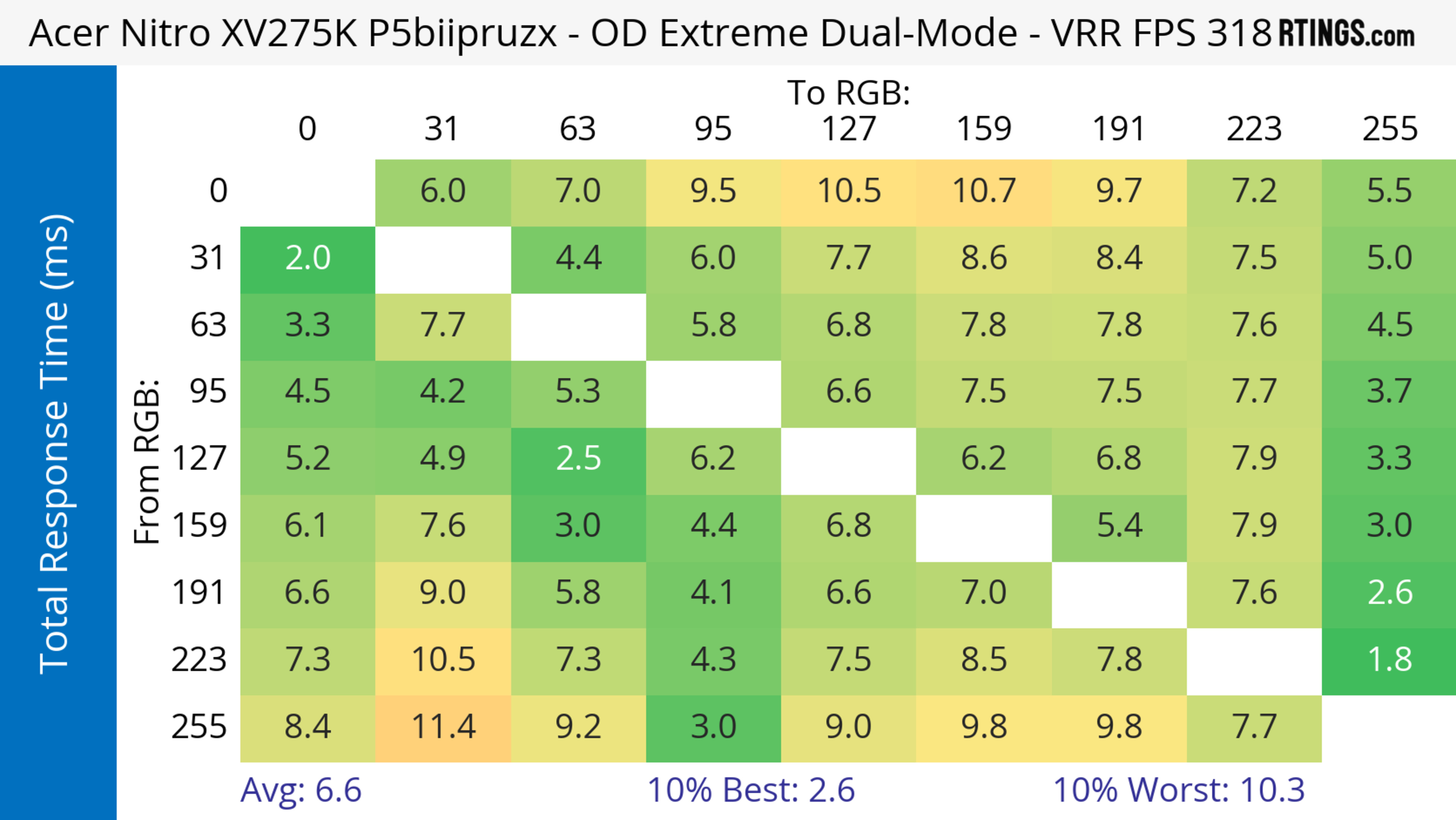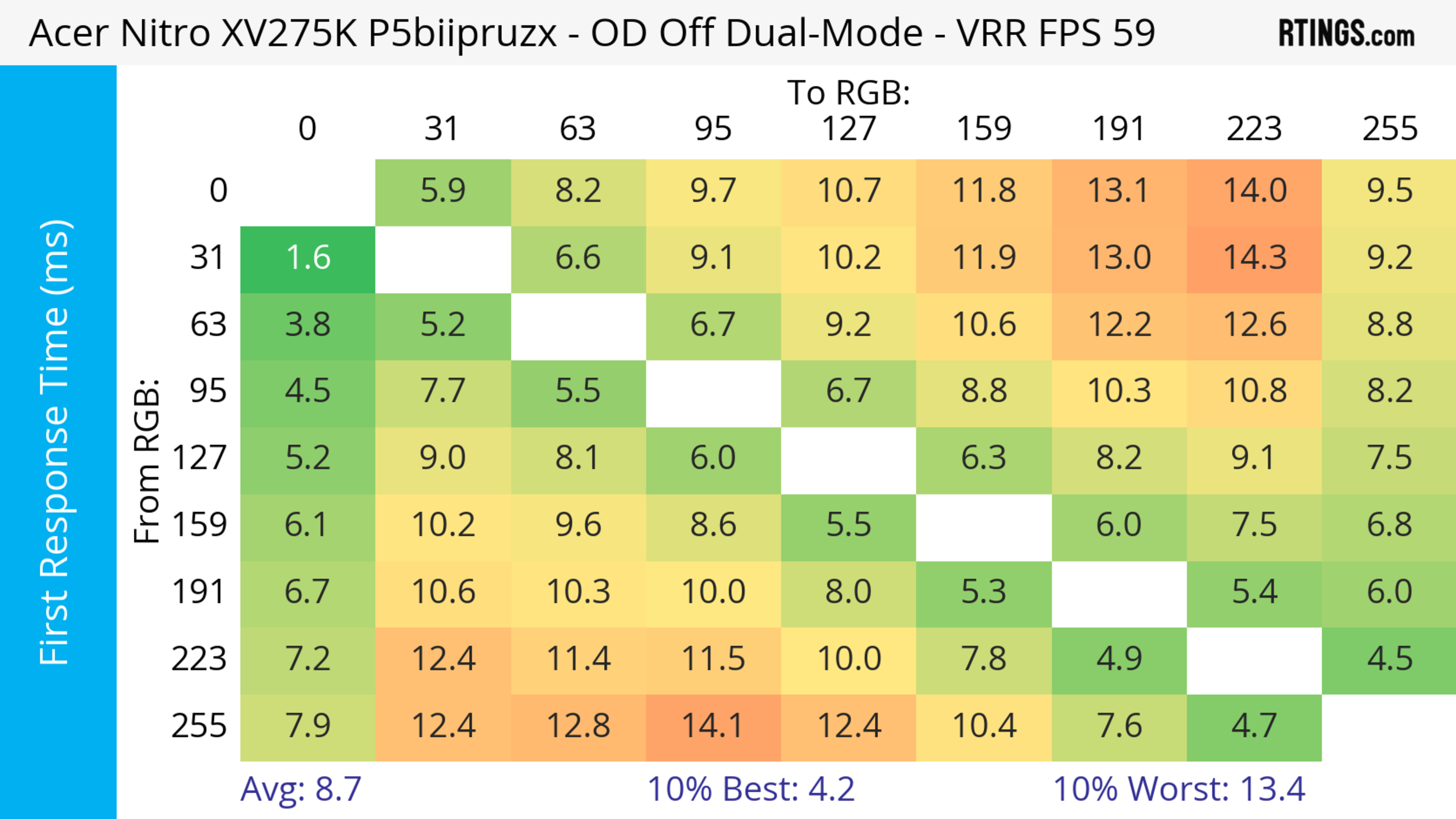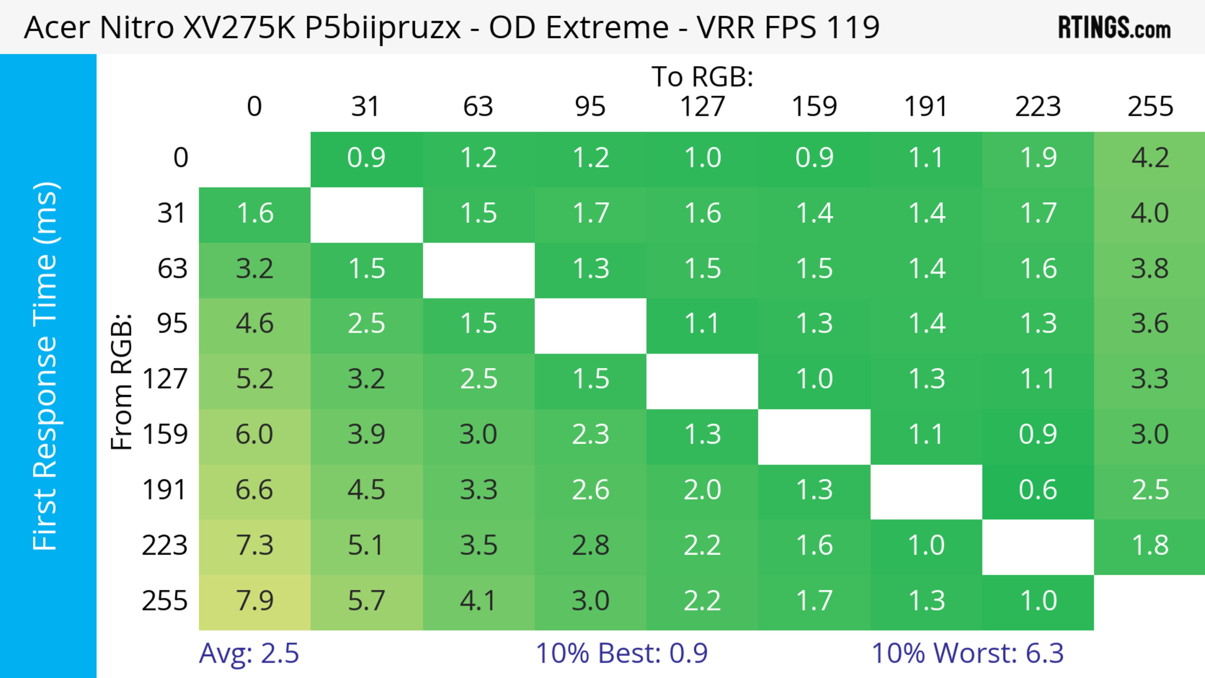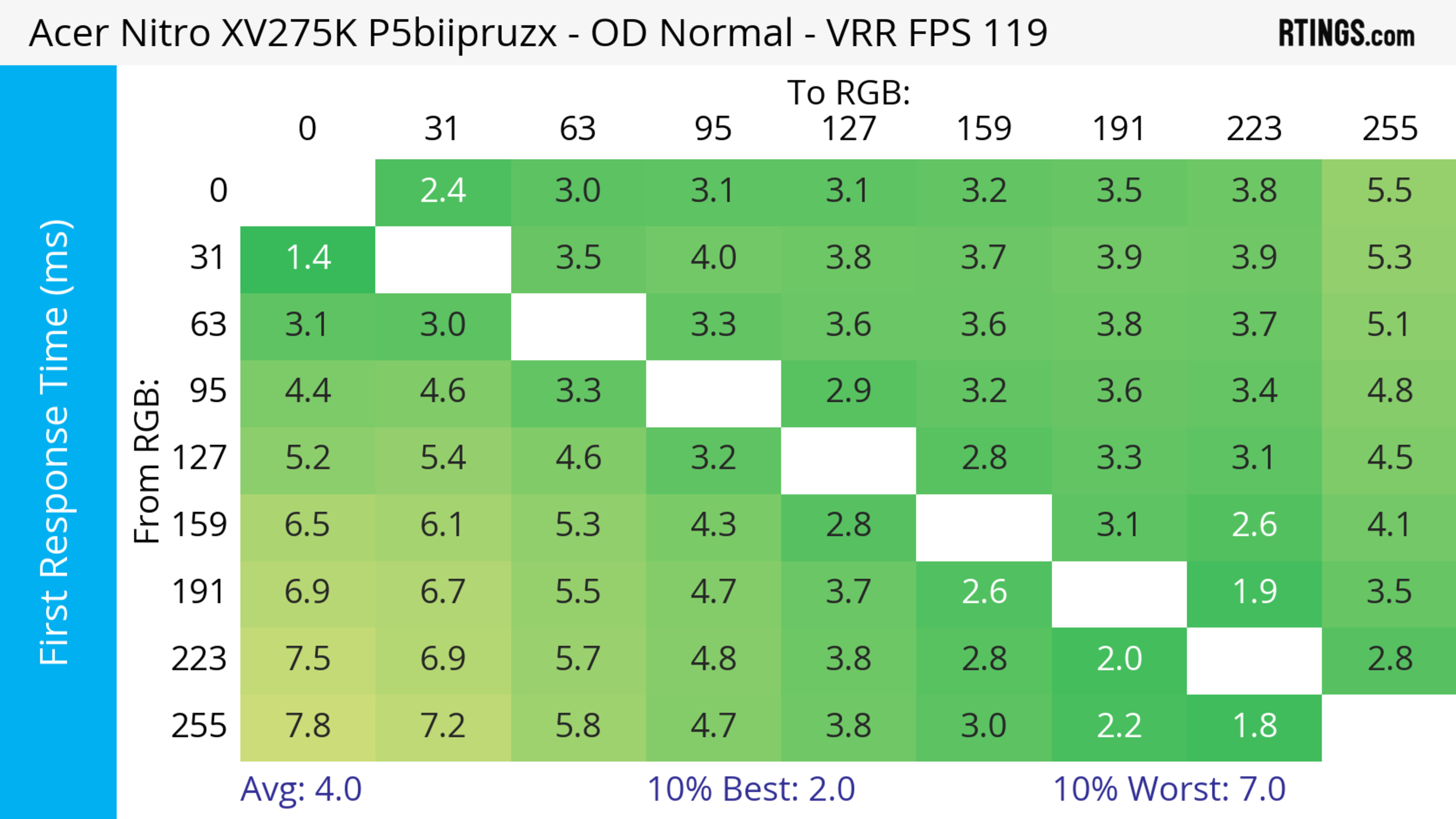The Acer Nitro XV275K P5 has low input lag at any refresh rate, including at 60Hz. These results are in the 4k mode, but you can also see them in the 1080p mode: