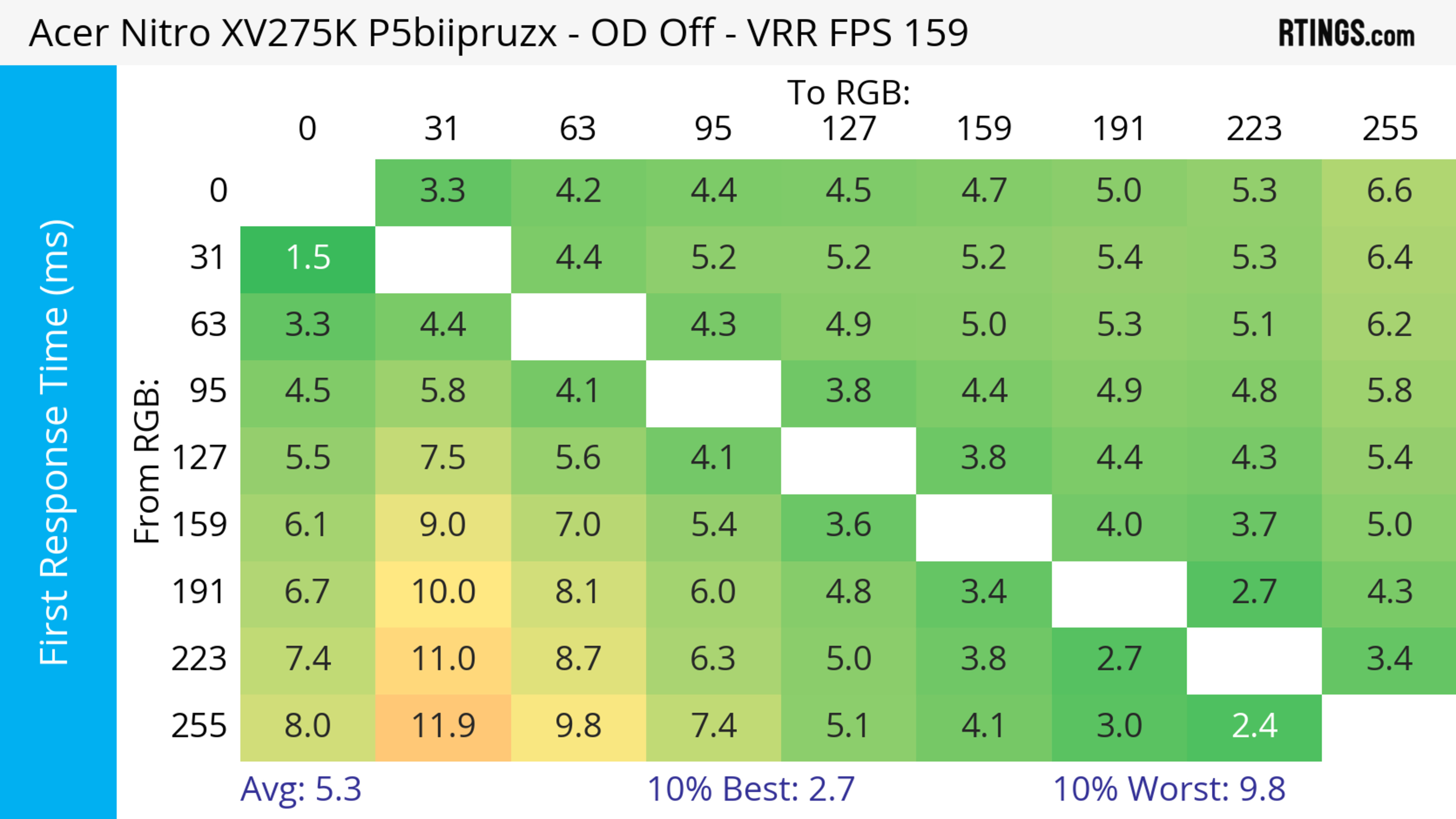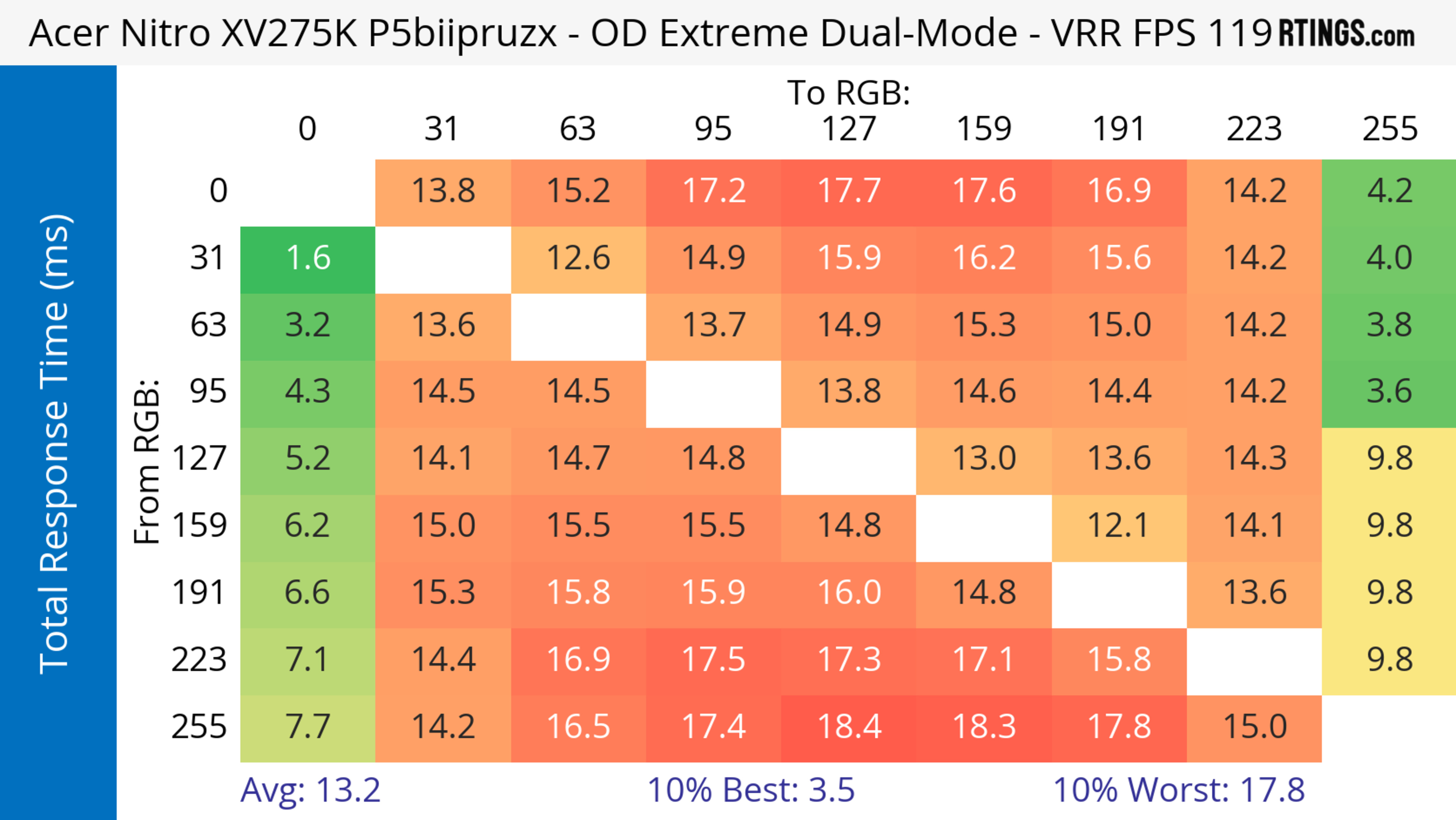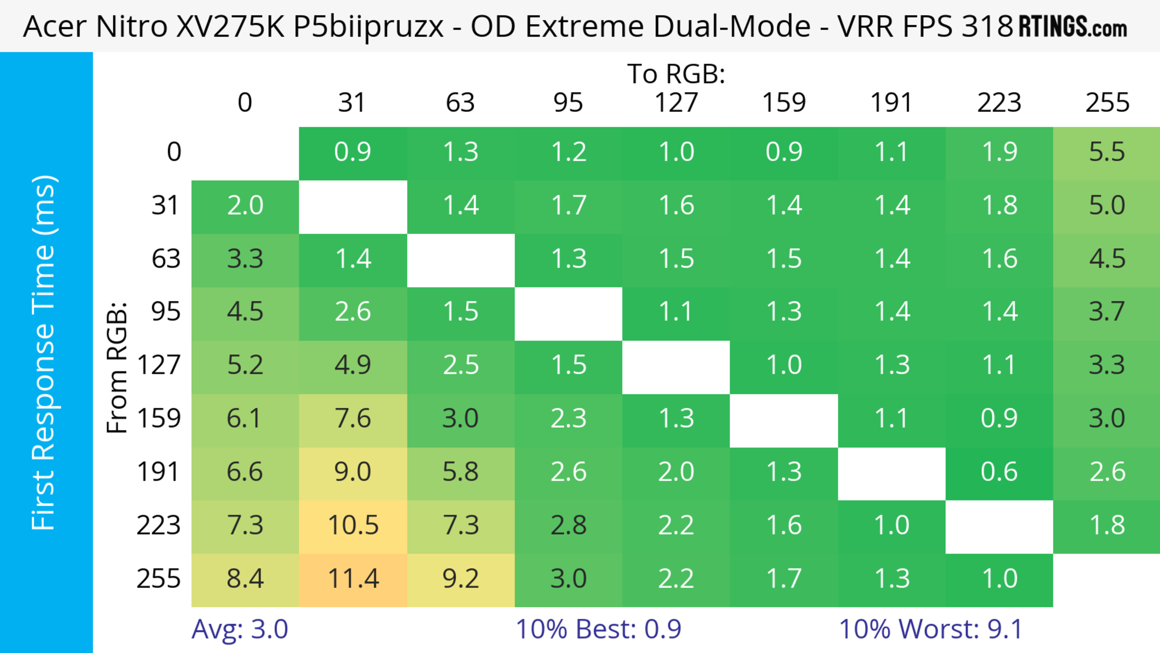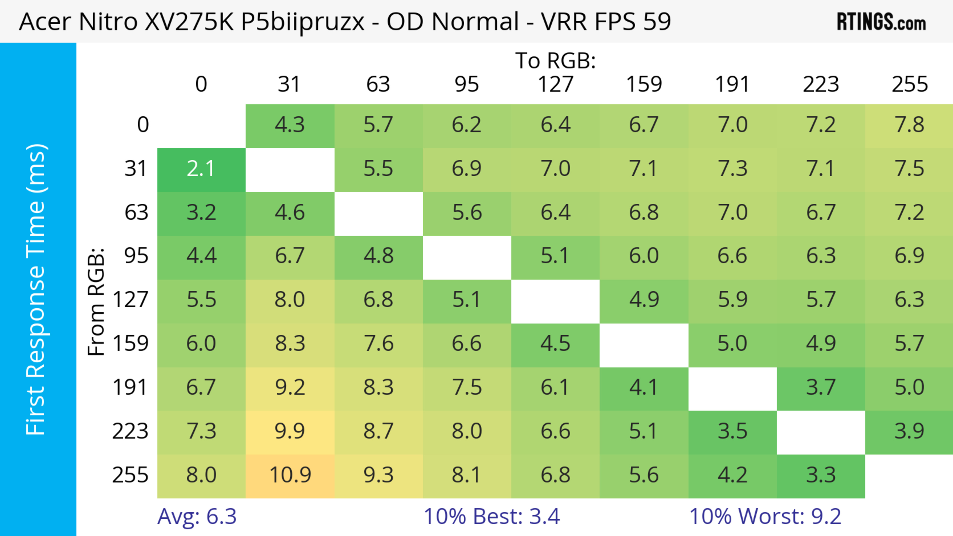 The Acer Nitro XV275K P5 has low input lag at any refresh rate, including at 60Hz. These results are in the 4k mode, but you can also see them in the 1080p mode: