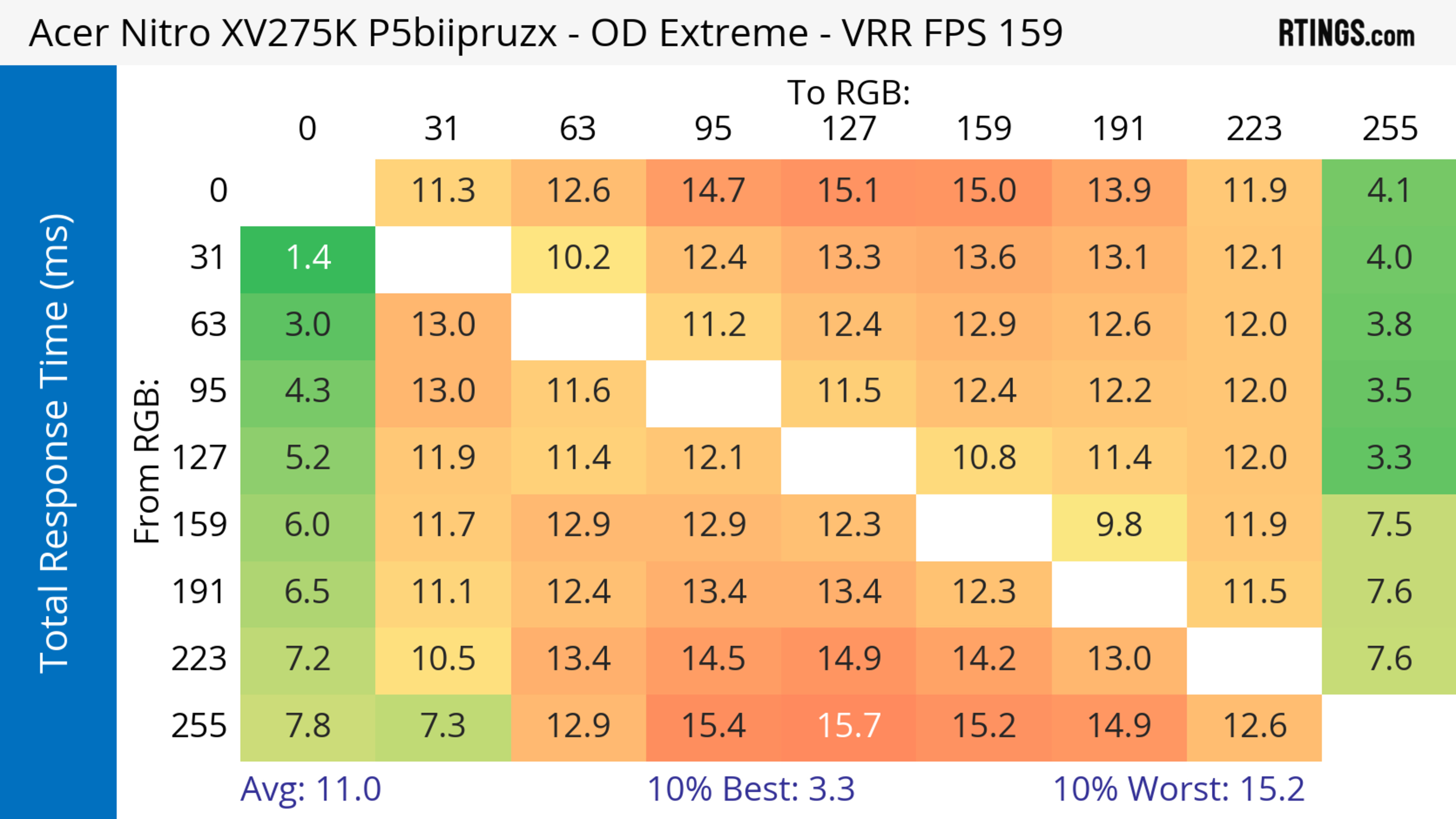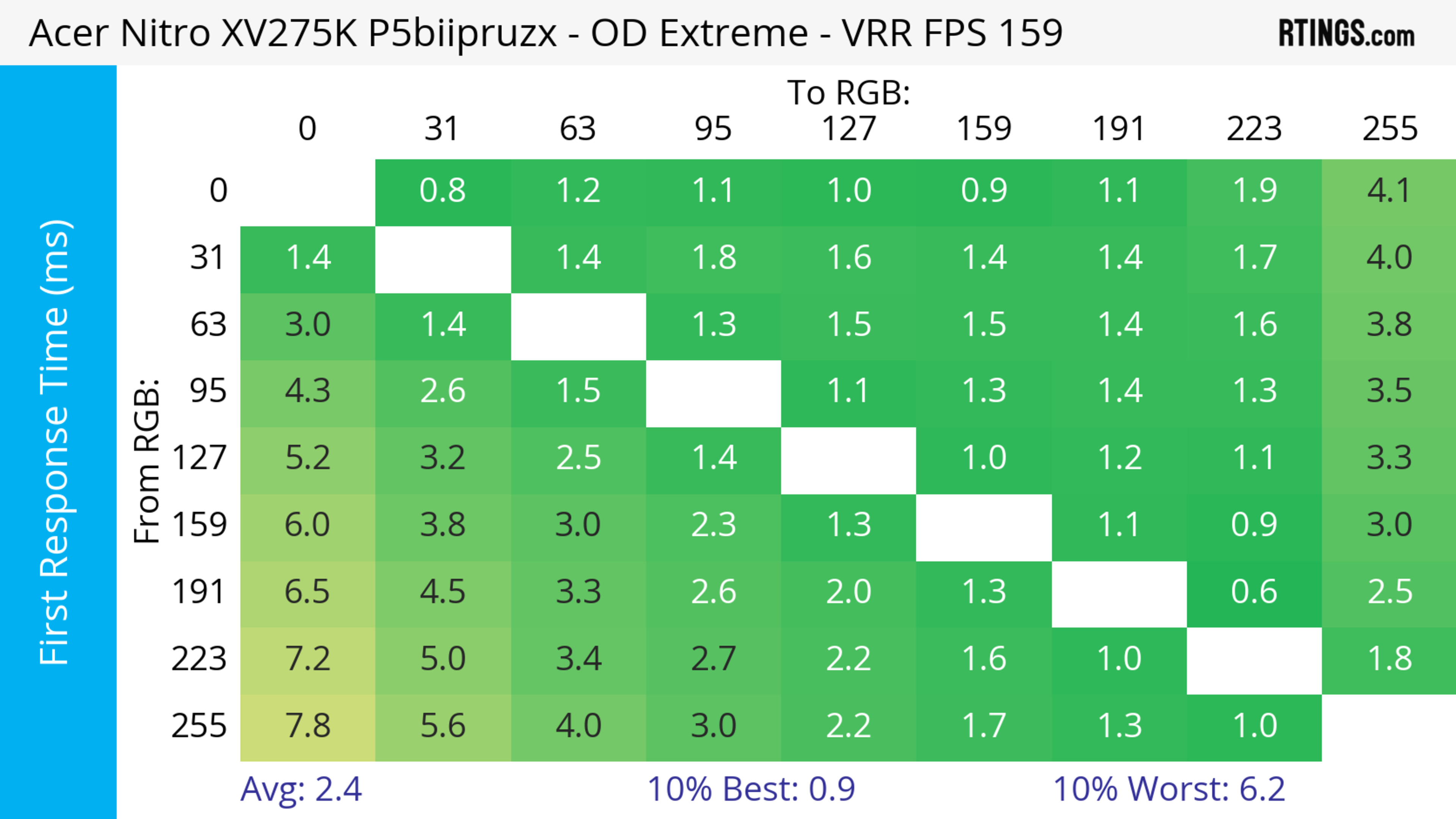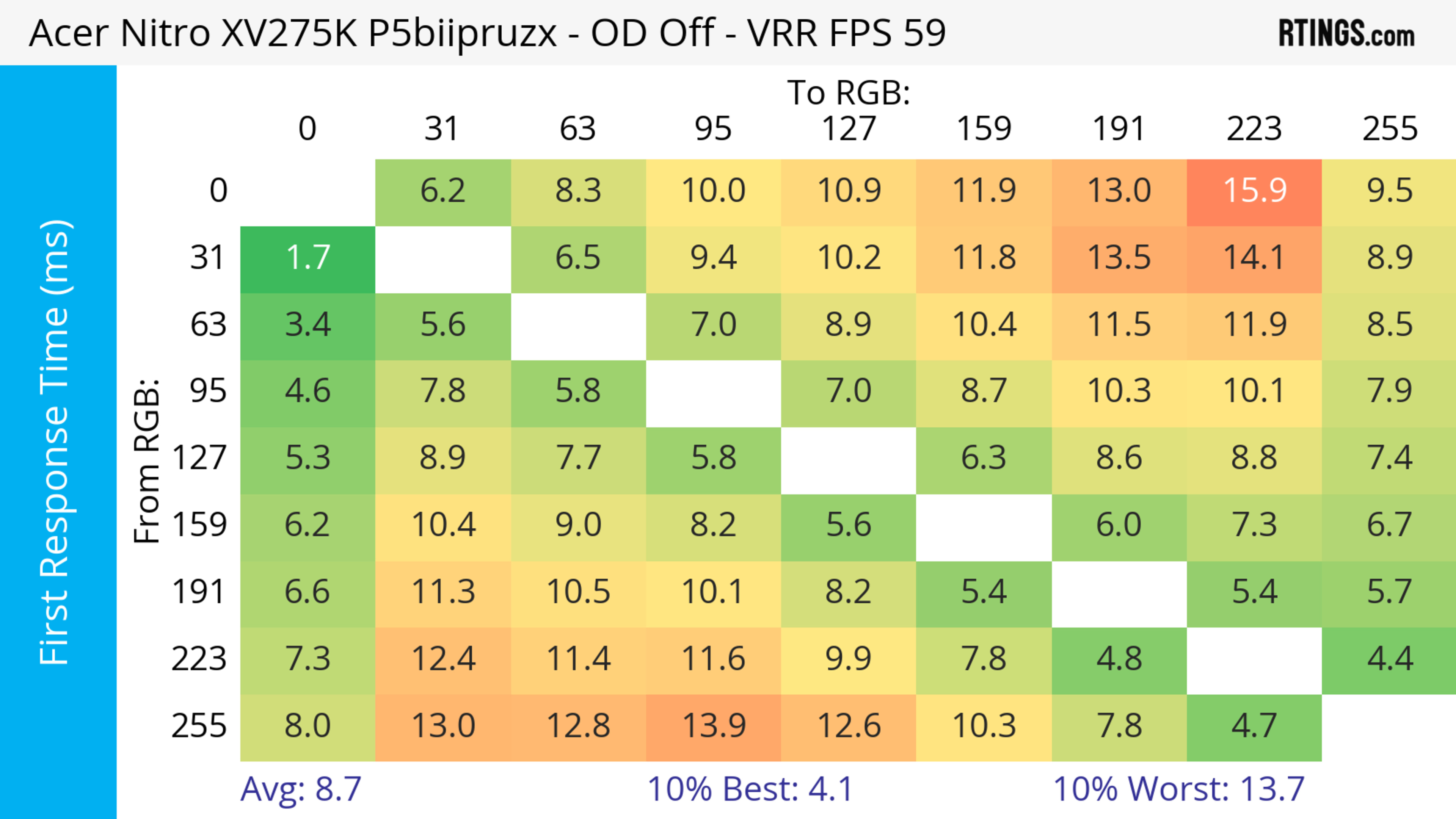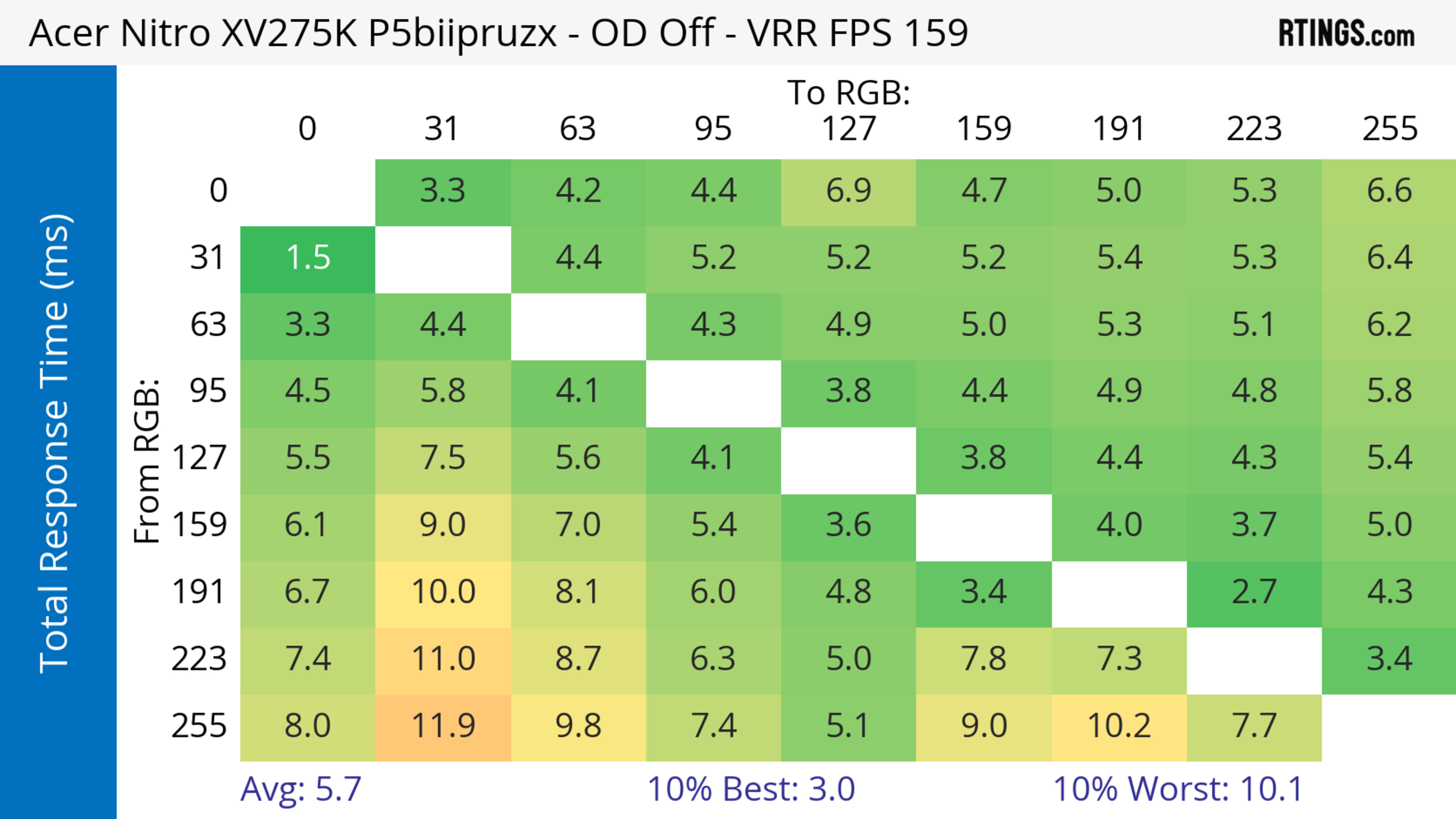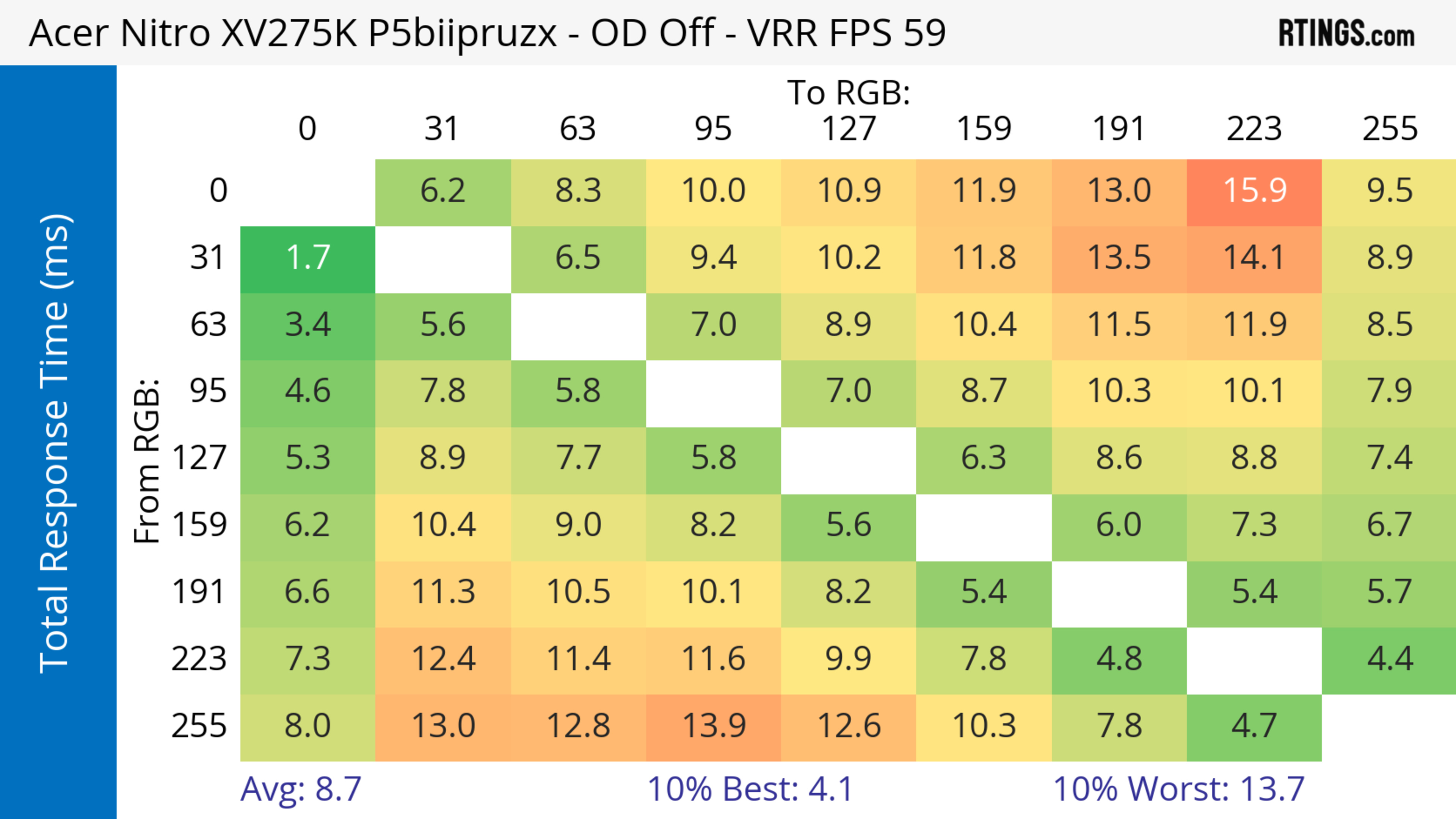 The Acer Nitro XV275K P5 has low input lag at any refresh rate, including at 60Hz. These results are in the 4k mode, but you can also see them in the 1080p mode: