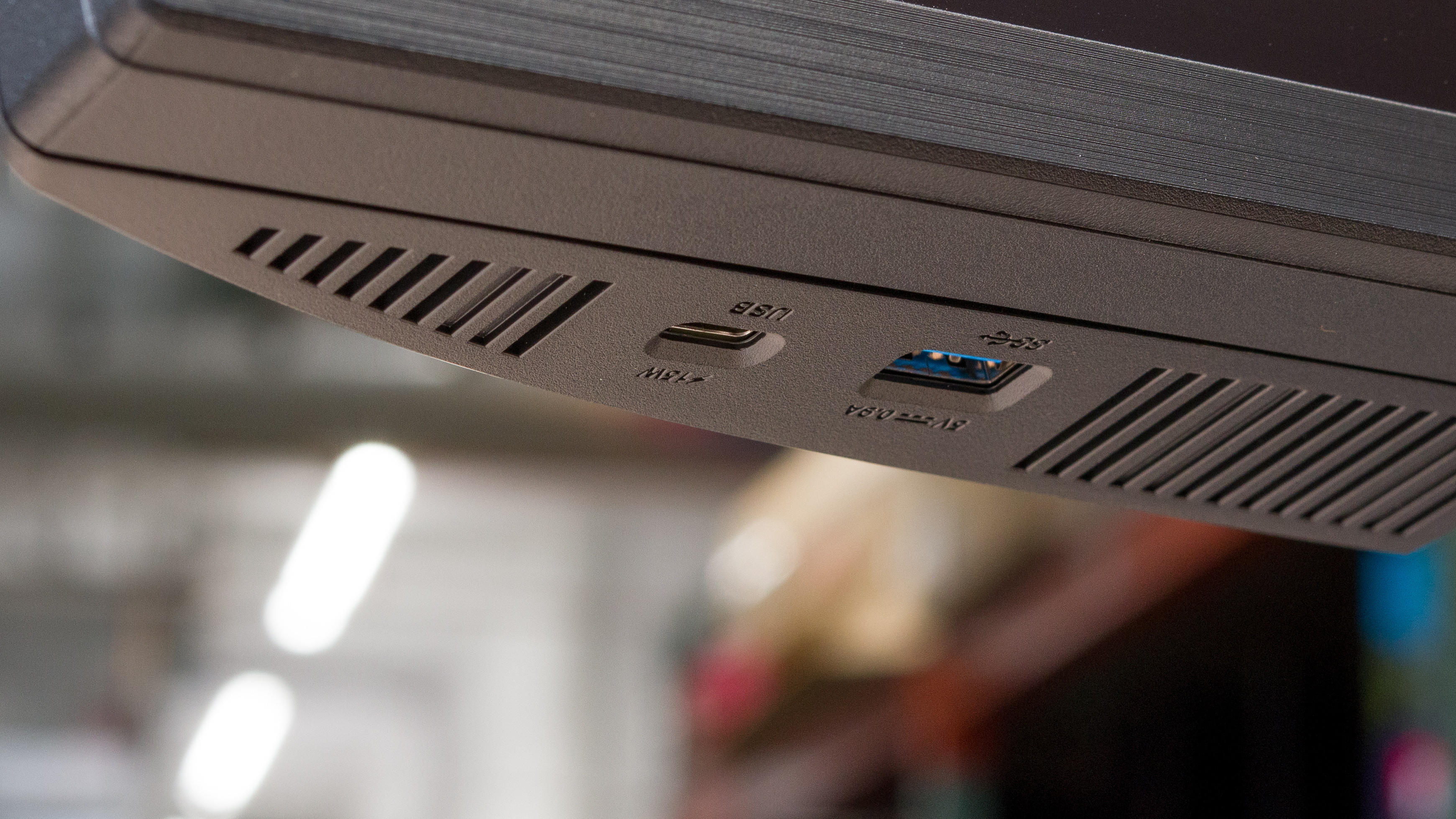 Two of the four USB-C ports support Thunderbolt, and they're both at the back of the monitor. One has 90W of power delivery and is meant to connect to your laptop. The other is Thunderbolt out to daisy-chain a second monitor, and we confirmed that it works. If you aren't going to use it for daisy chaining, it acts as a downstream port with 15W of power delivery. The USB-C port located beneath the bottom bezel is downstream only and also provides 15W of power. The other USB-C port in the back is upstream only and doesn't support power delivery, so you need to use this for the KVM switch to work properly.