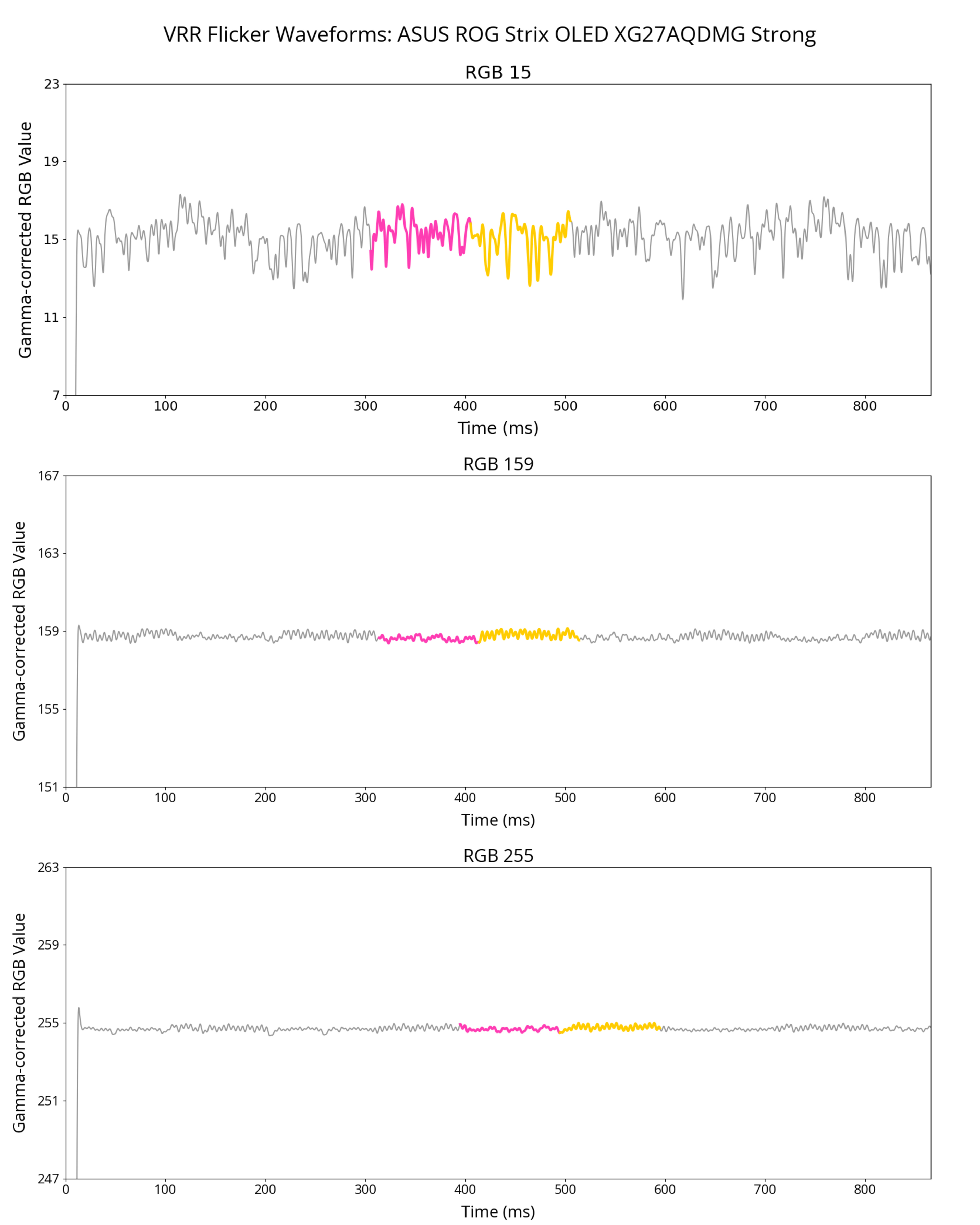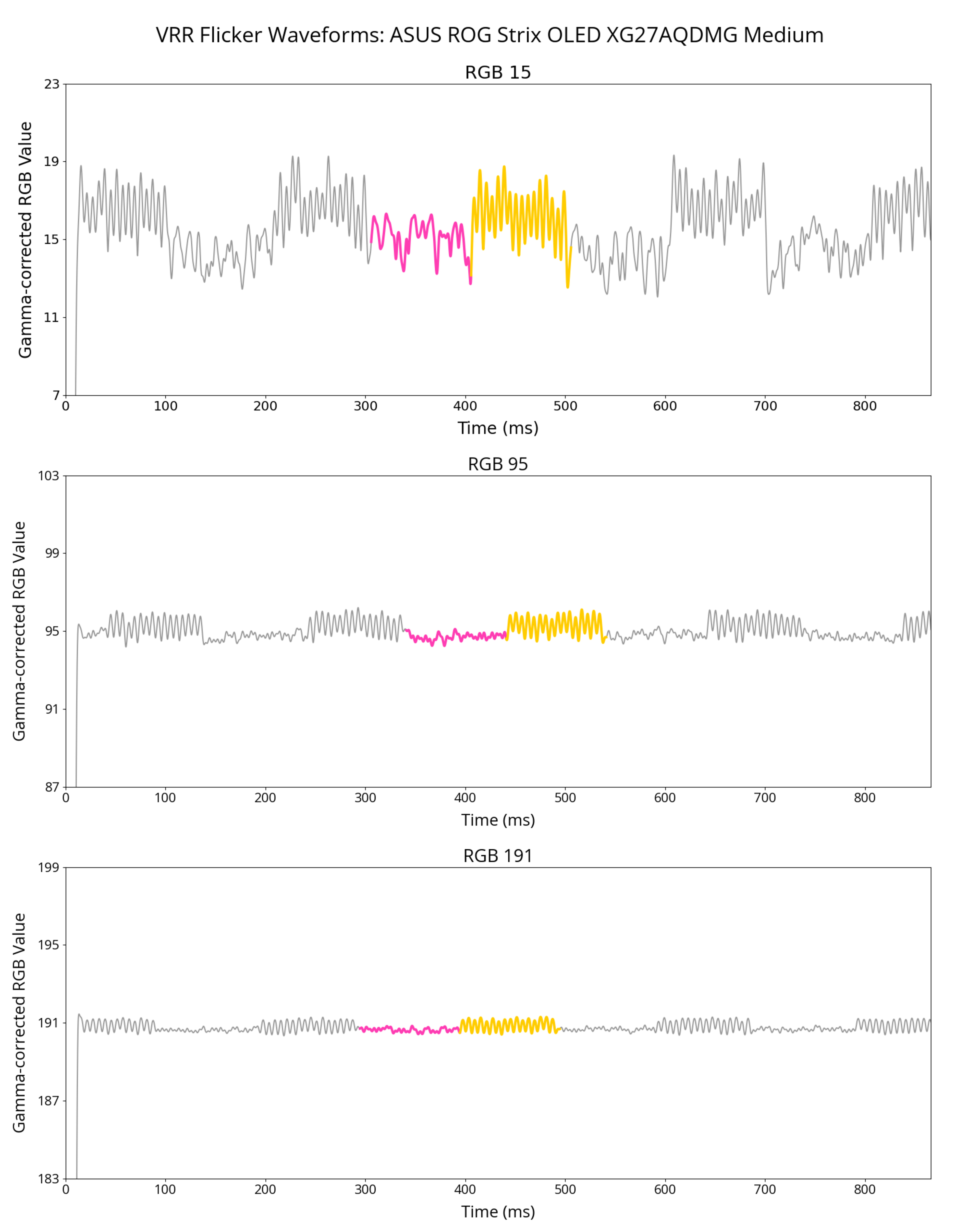 The ASUS ROG Strix OLED XG27AQDMG has quite distracting VRR flicker with changing frame rates if OLED Anti-Flicker is off. It can be particularly distracting if the frame rate changes a lot, especially in darker parts of scenes. That said, this doesn't happen if your PC can maintain consistent frame rates.