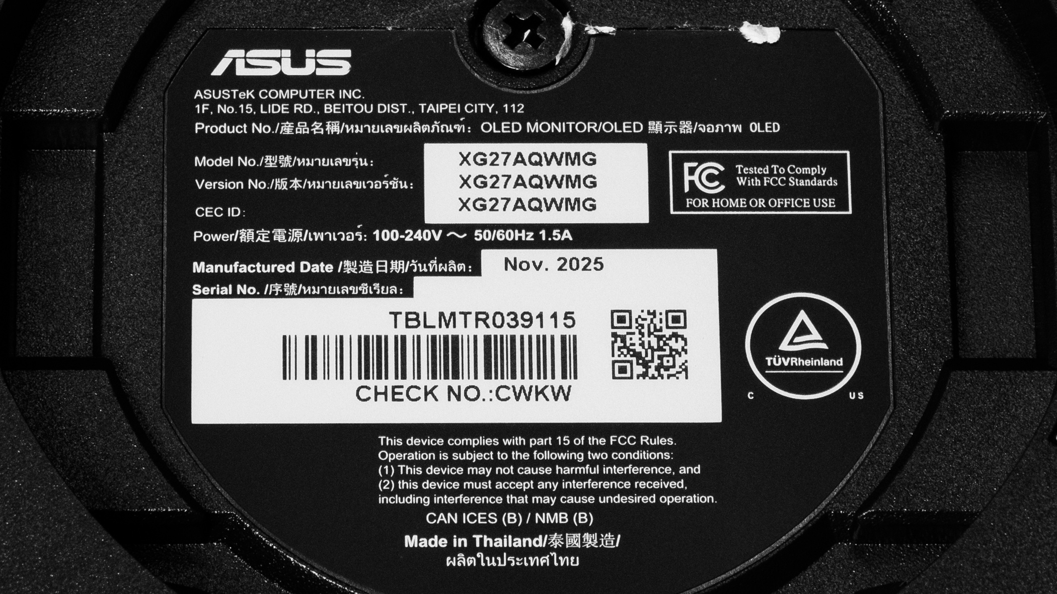 Our unit's label indicates it was manufactured in November 2025 in Thailand. We tested it with firmware MCM104.