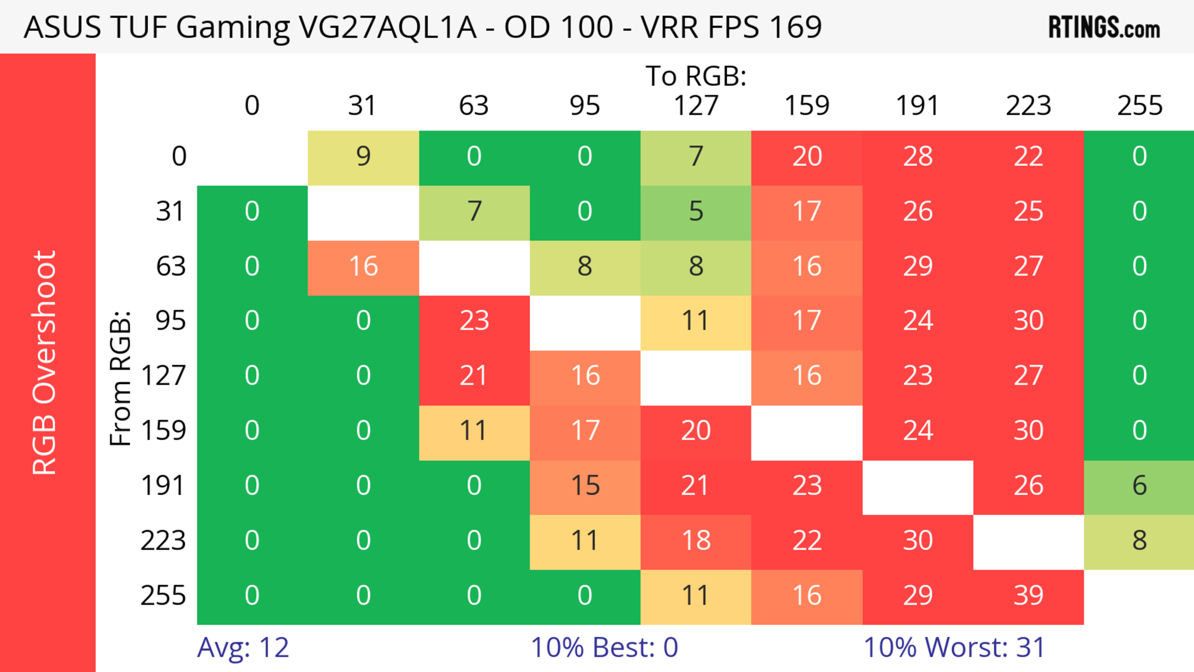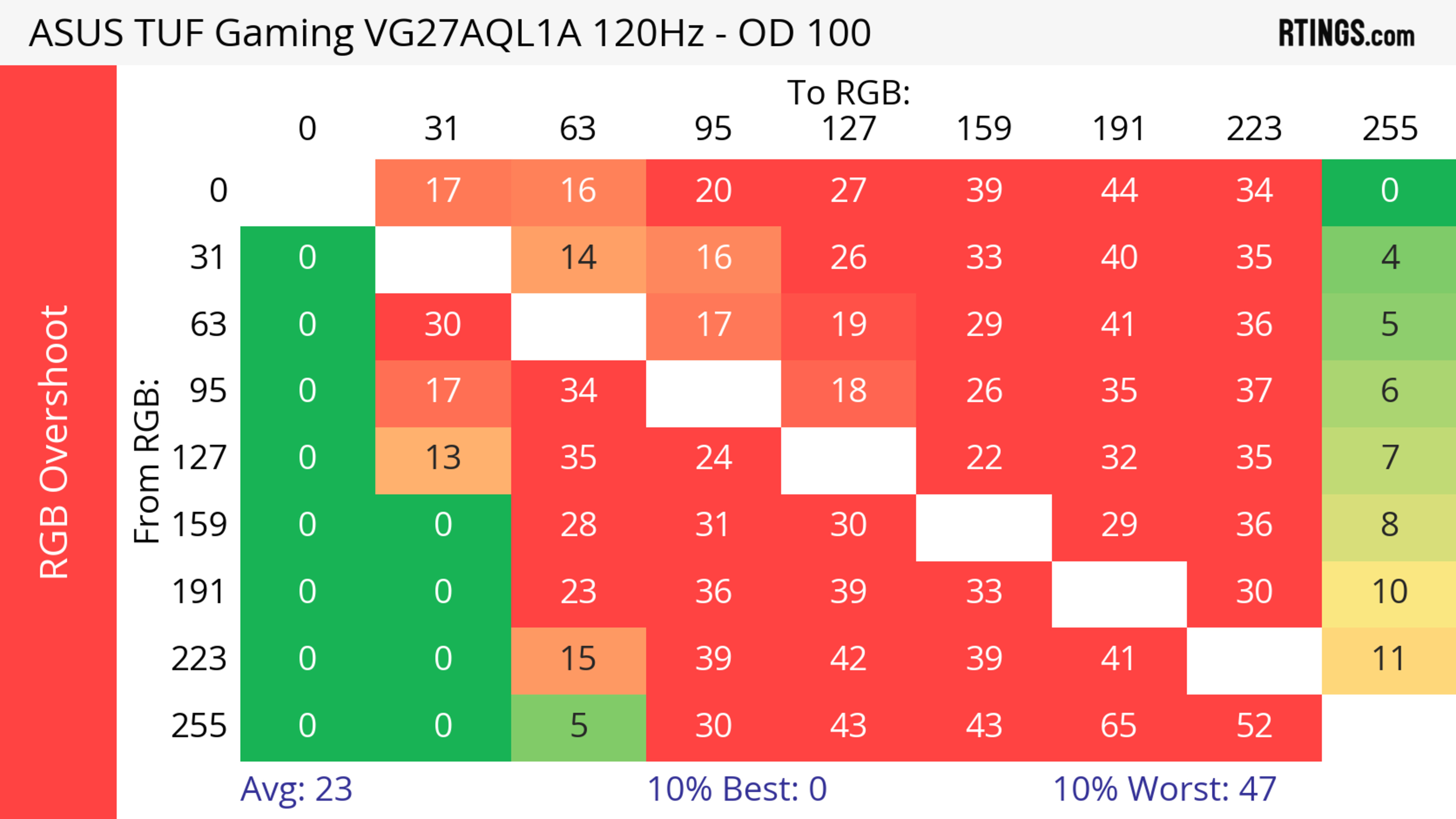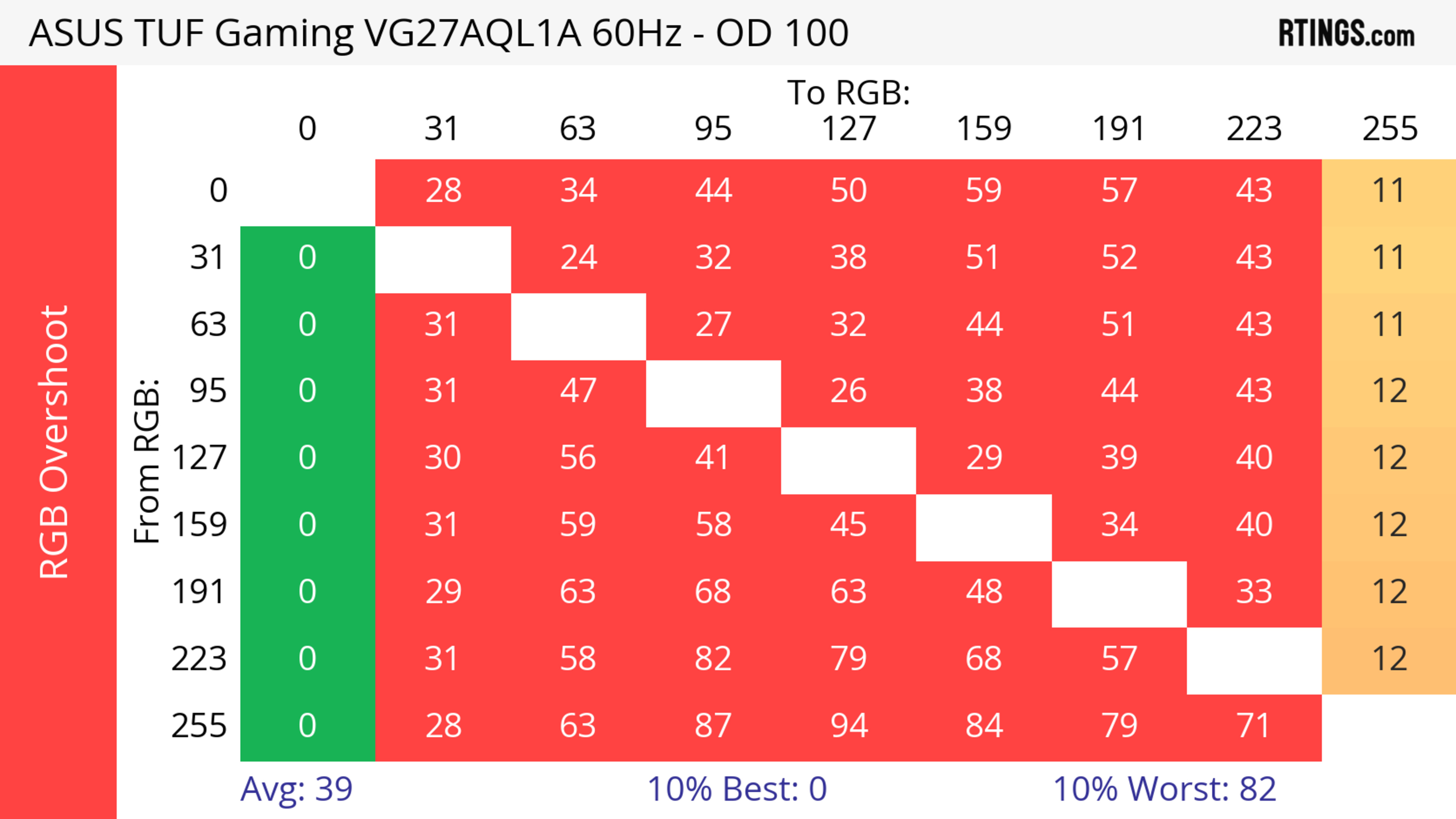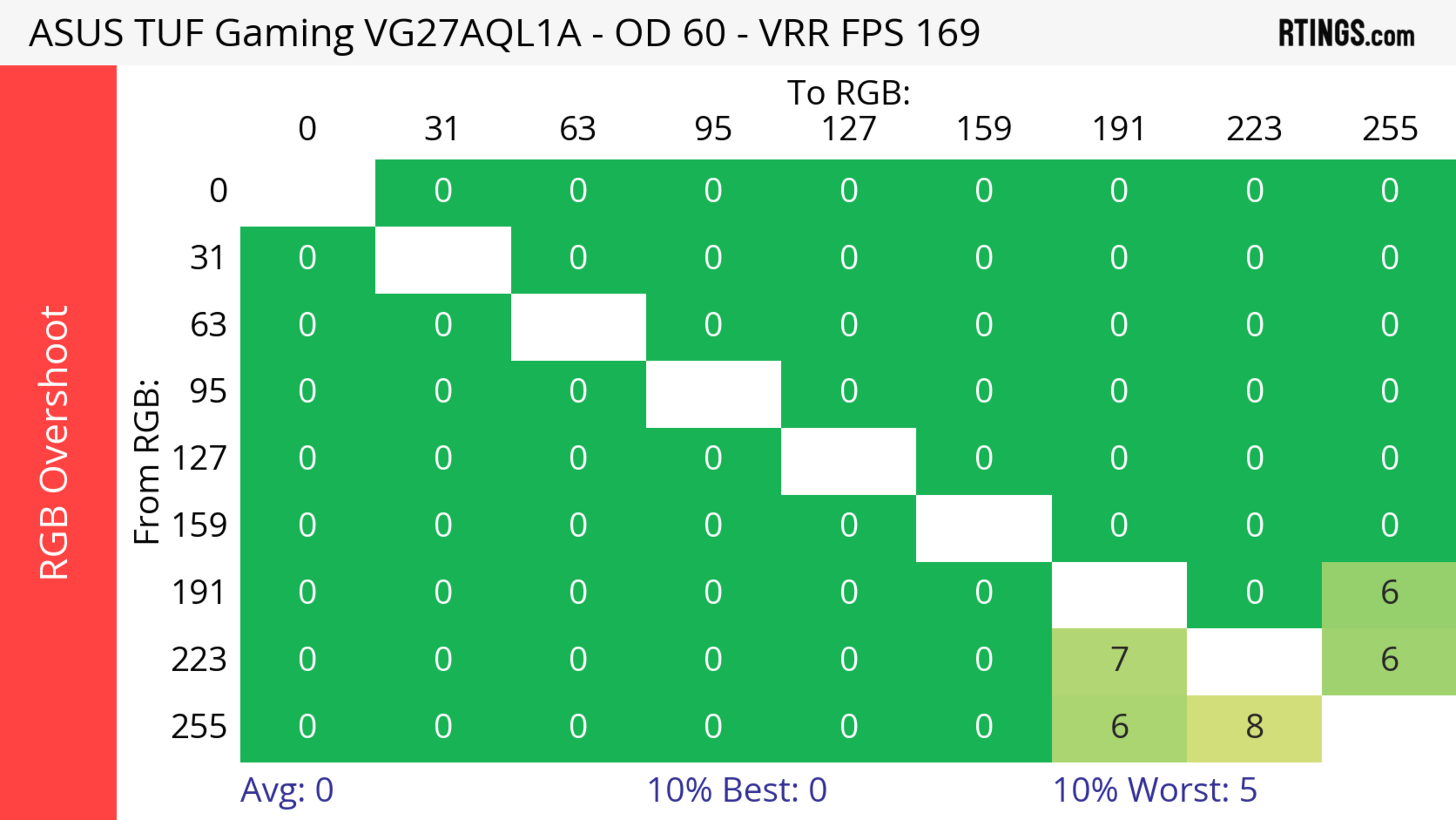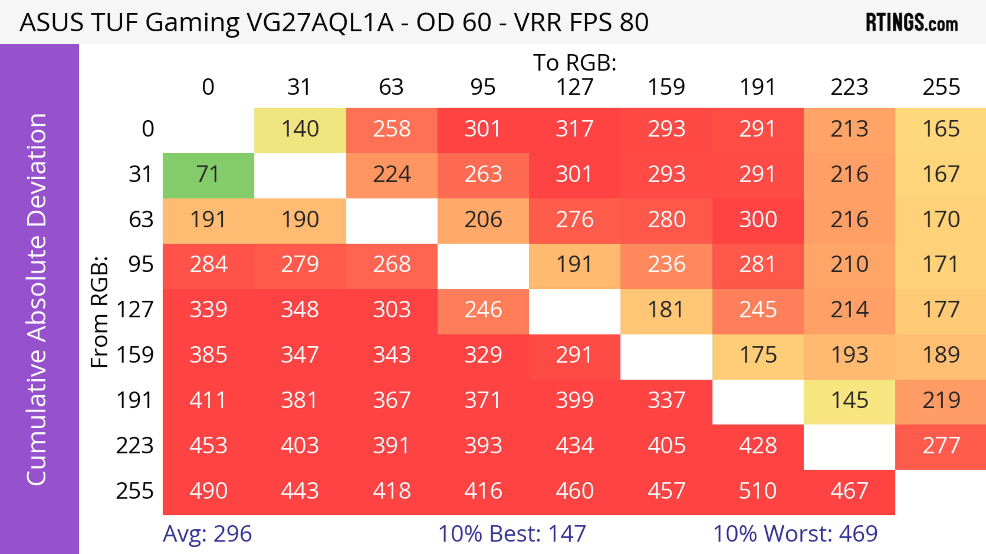 The ASUS VG27AQL1A has mediocre motion handling across its VRR range. All the overdrive settings performly inconsistently as the frame rate drops, as even the recommend overdrive of '60' has inverse ghosting. There's also noticeable blur and some smearing with fast-moving objects.