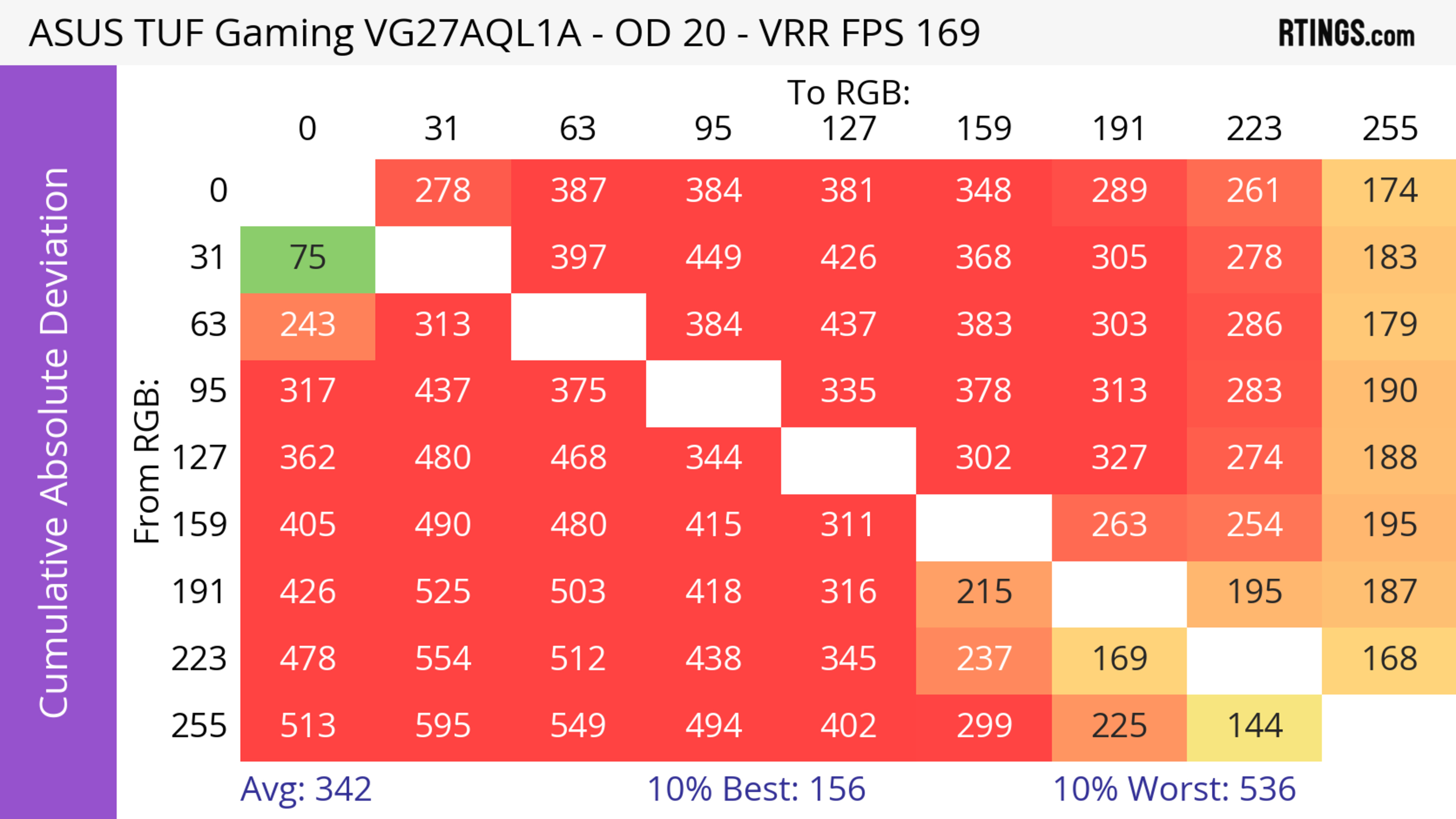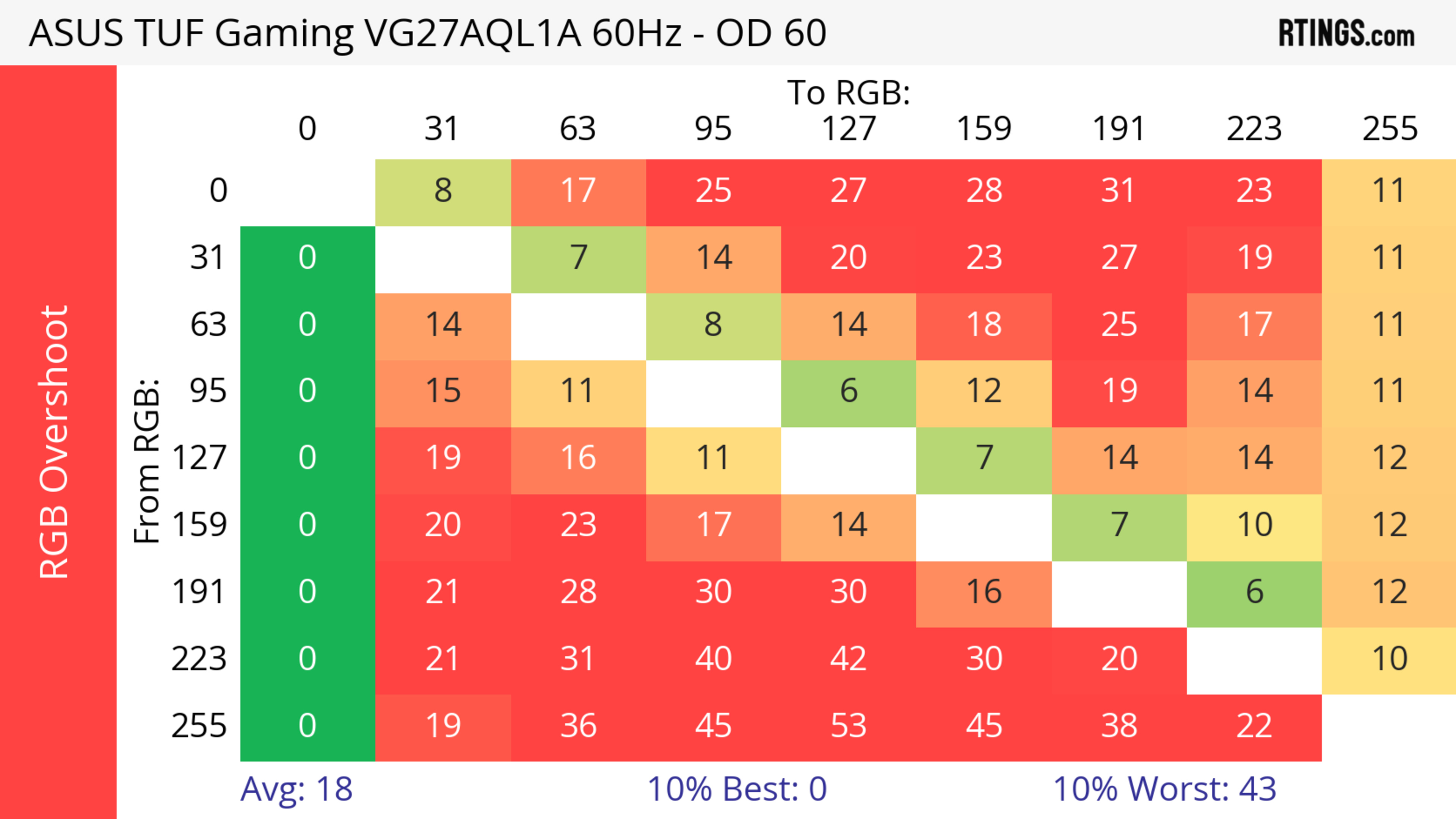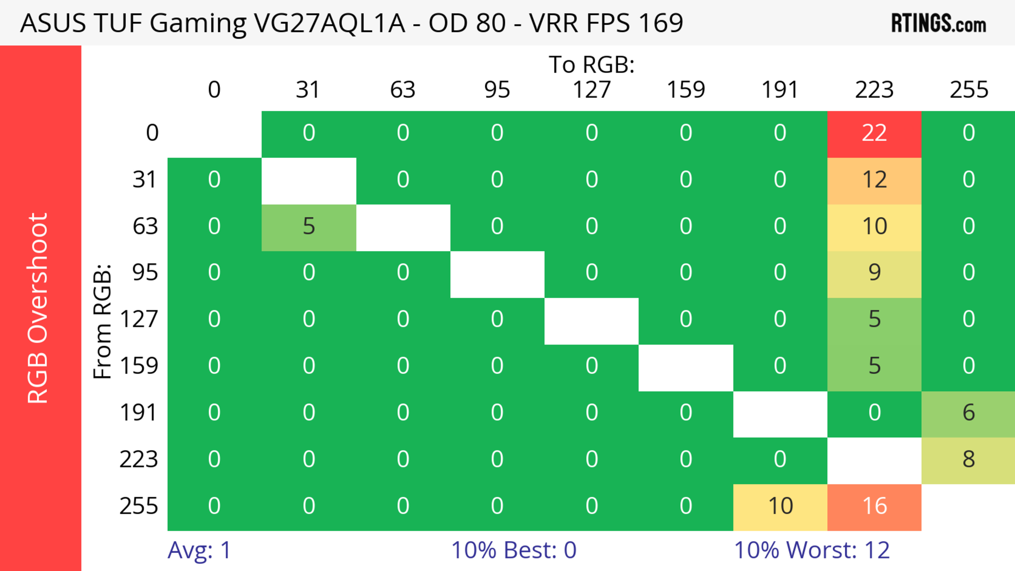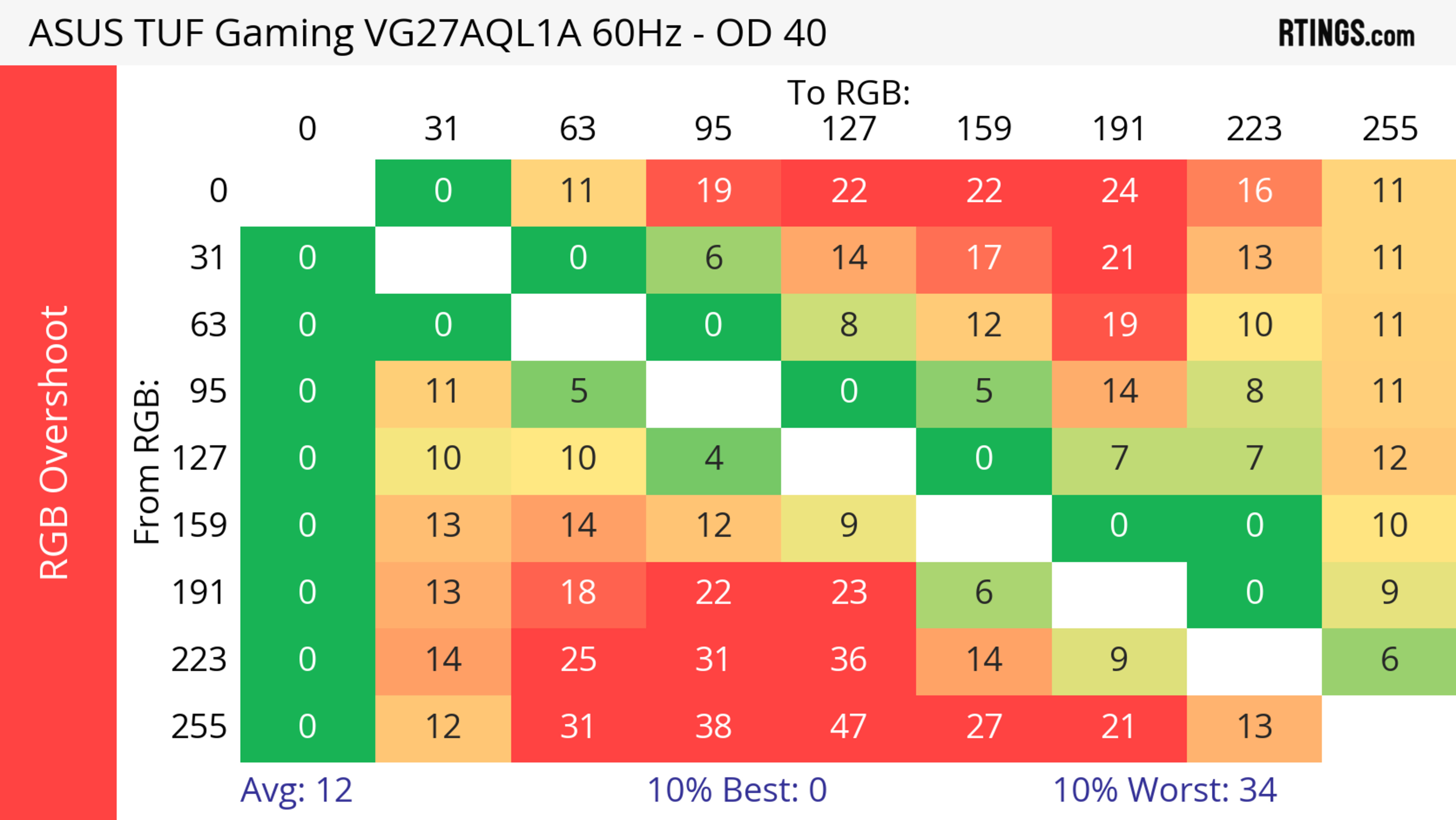 The ASUS VG27AQL1A has mediocre motion handling across its VRR range. All the overdrive settings performly inconsistently as the frame rate drops, as even the recommend overdrive of '60' has inverse ghosting. There's also noticeable blur and some smearing with fast-moving objects.