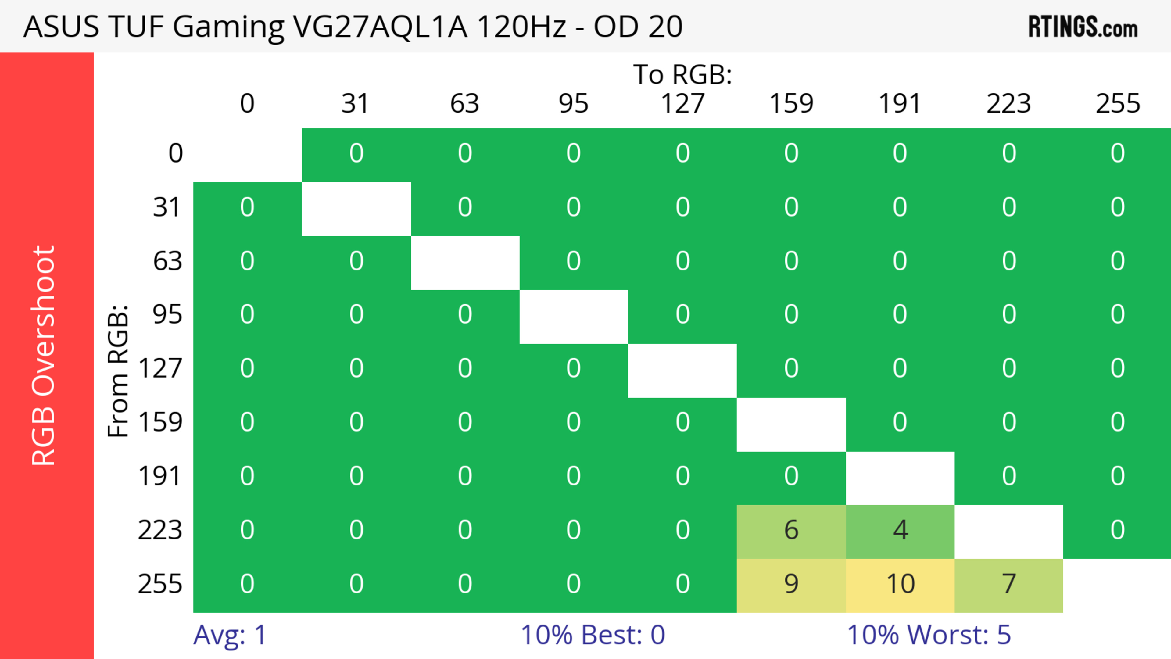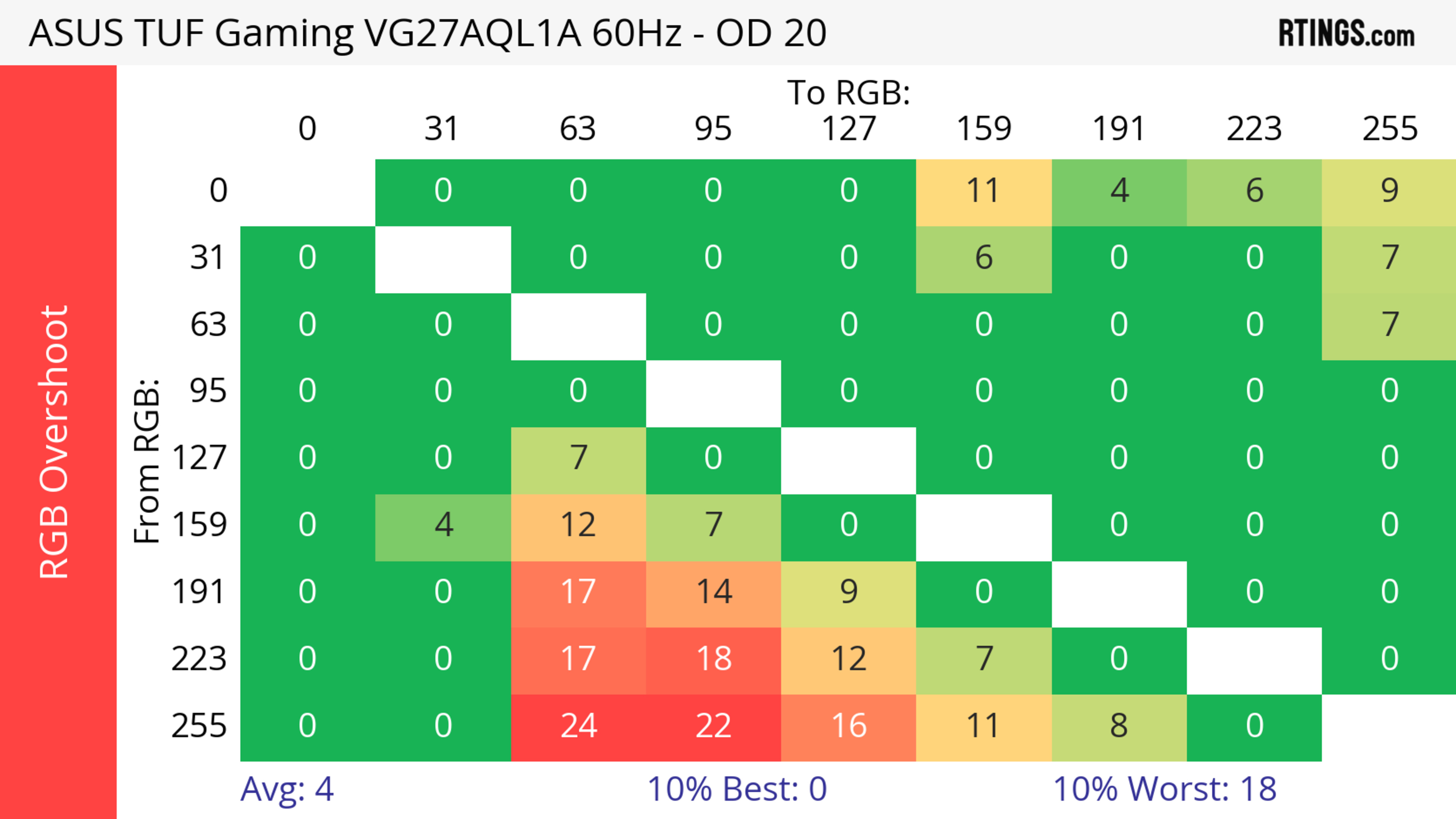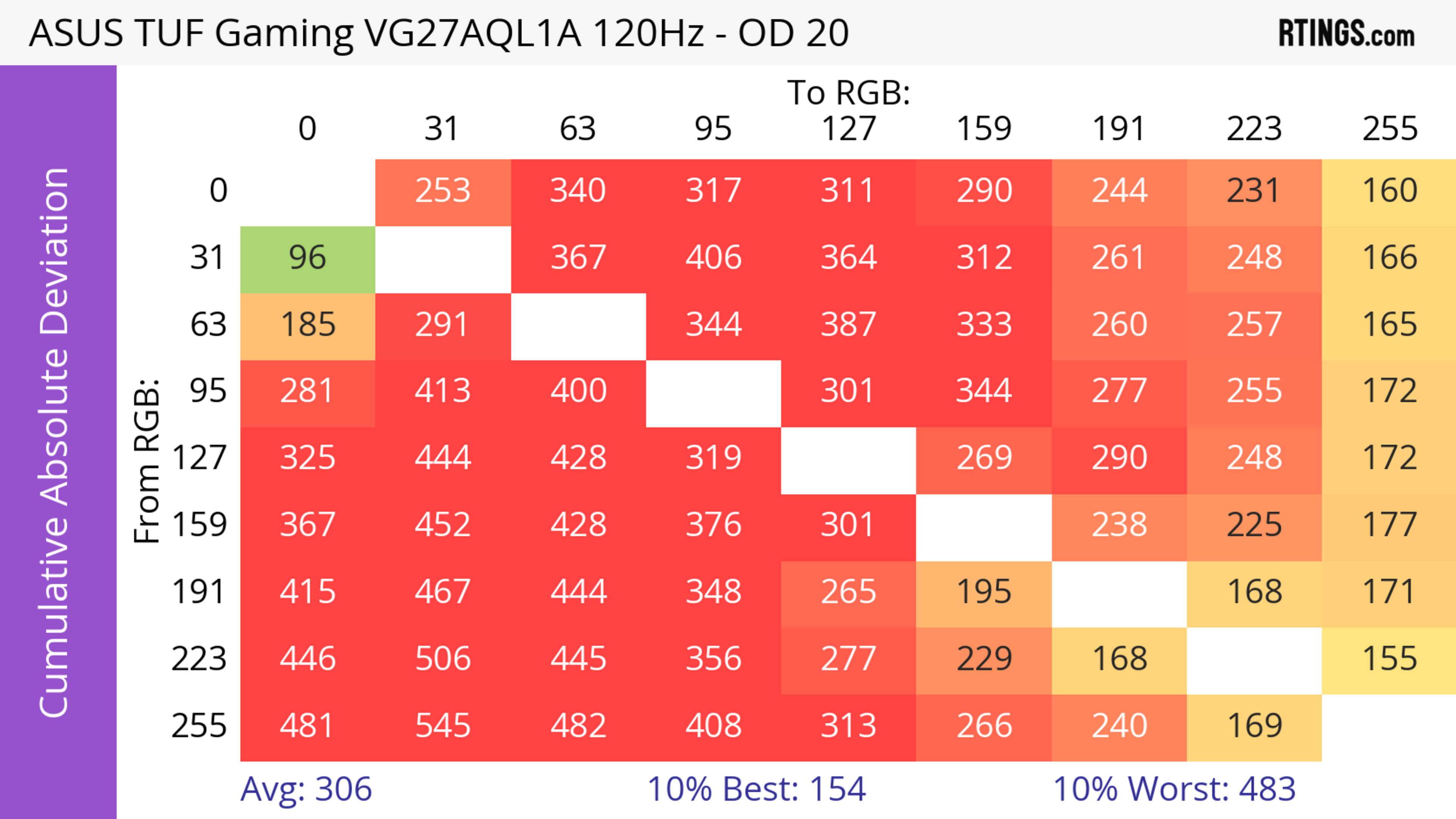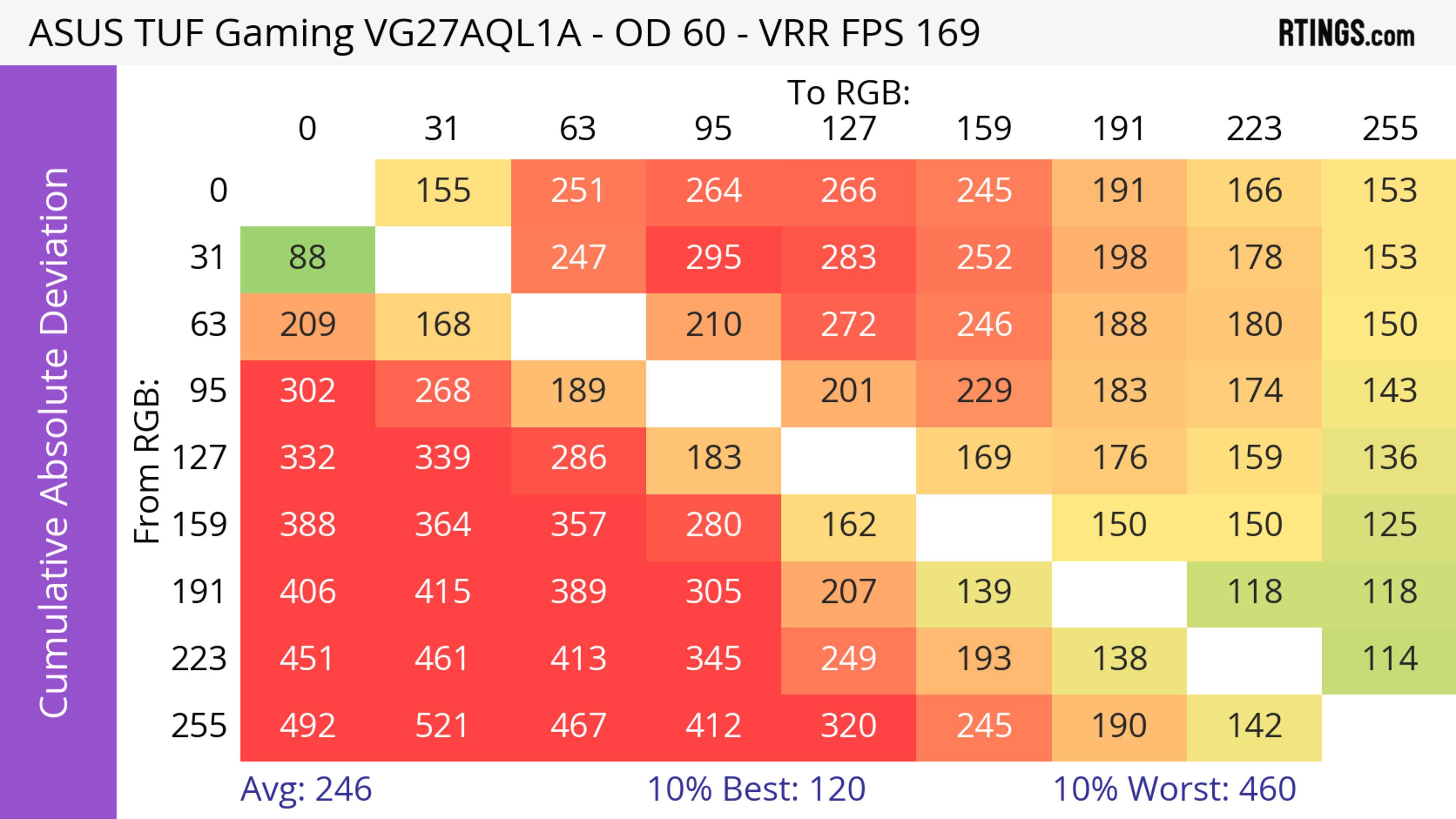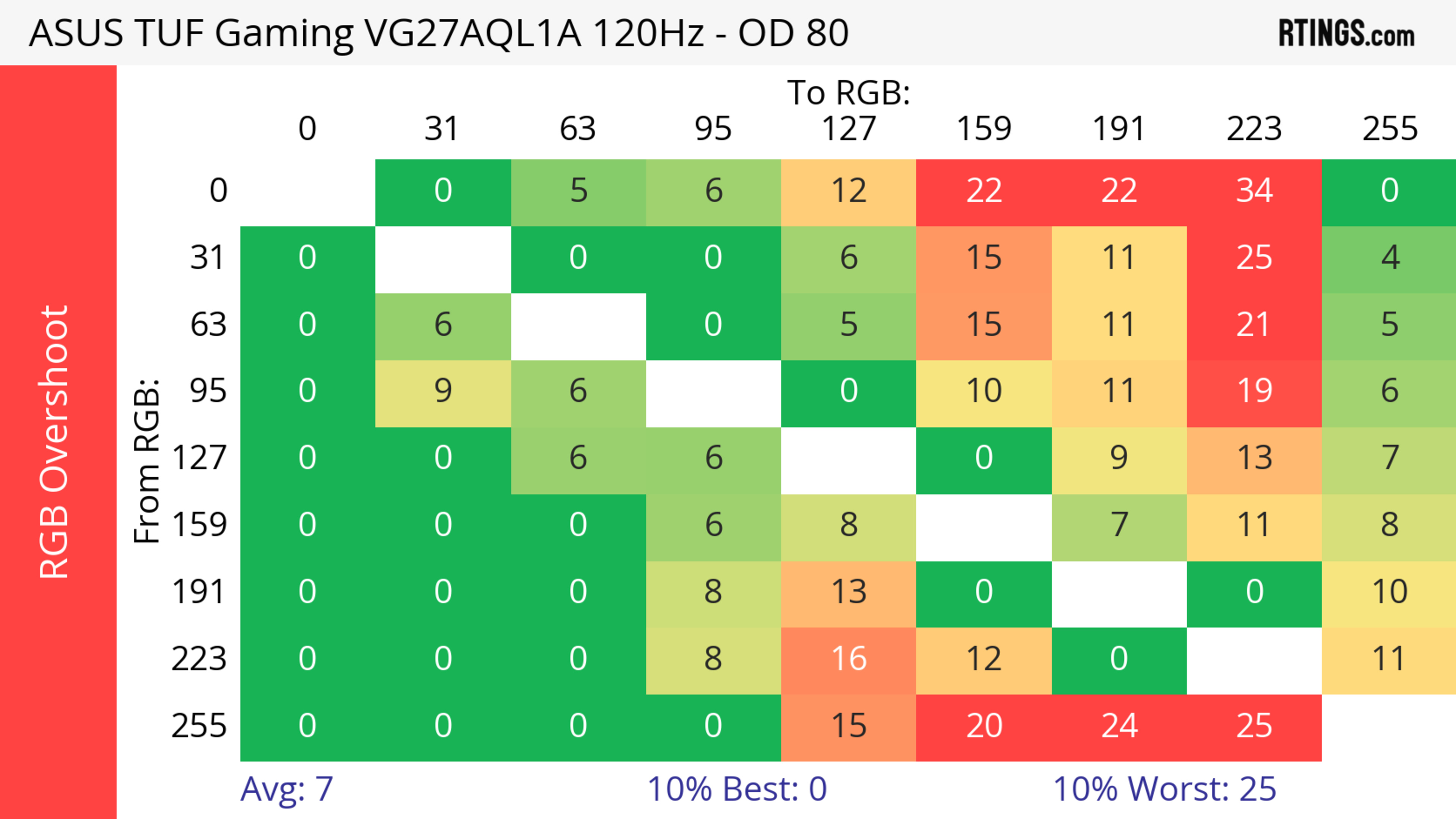 The ASUS VG27AQL1A has mediocre motion handling across its VRR range. All the overdrive settings performly inconsistently as the frame rate drops, as even the recommend overdrive of '60' has inverse ghosting. There's also noticeable blur and some smearing with fast-moving objects.