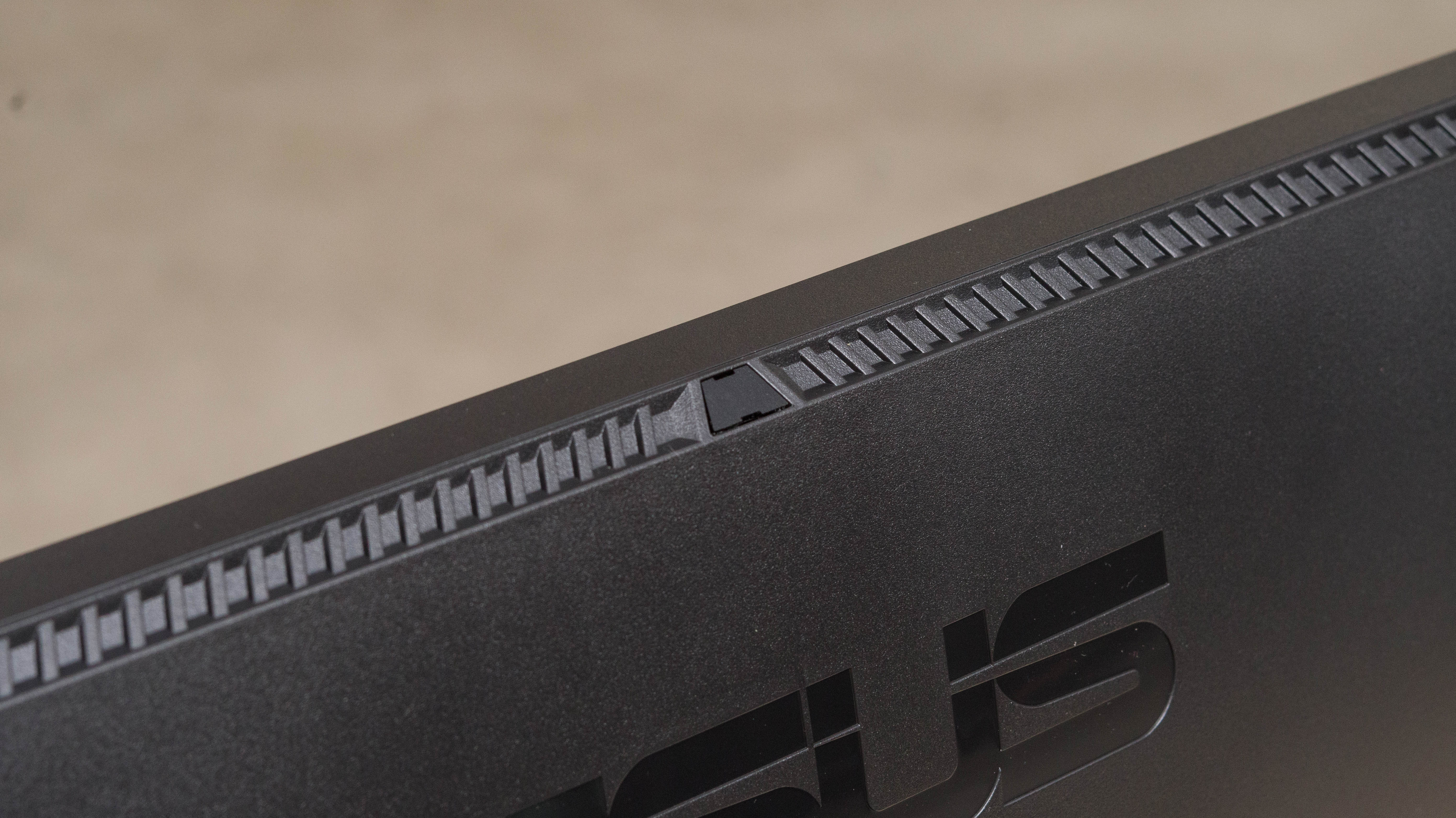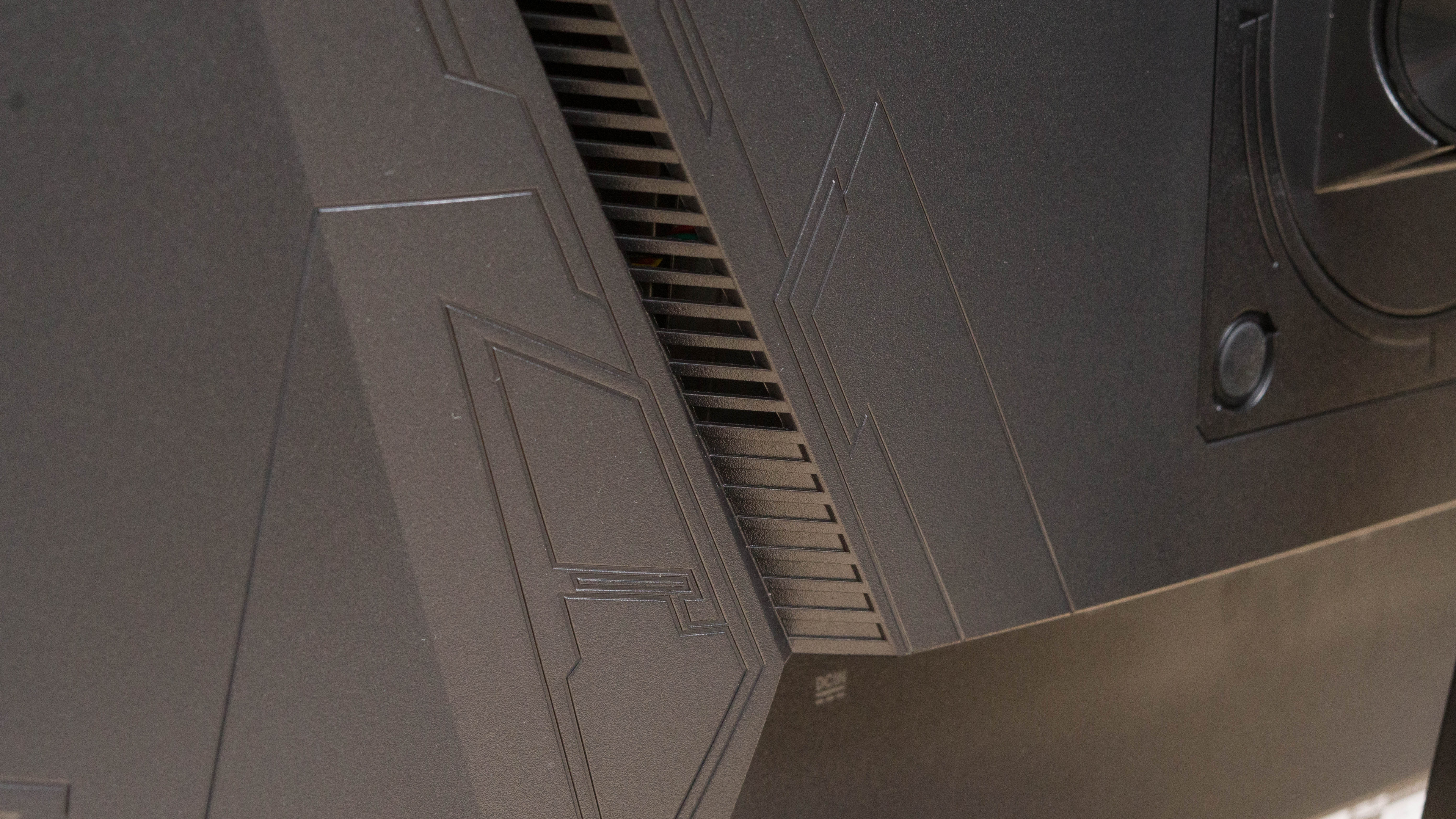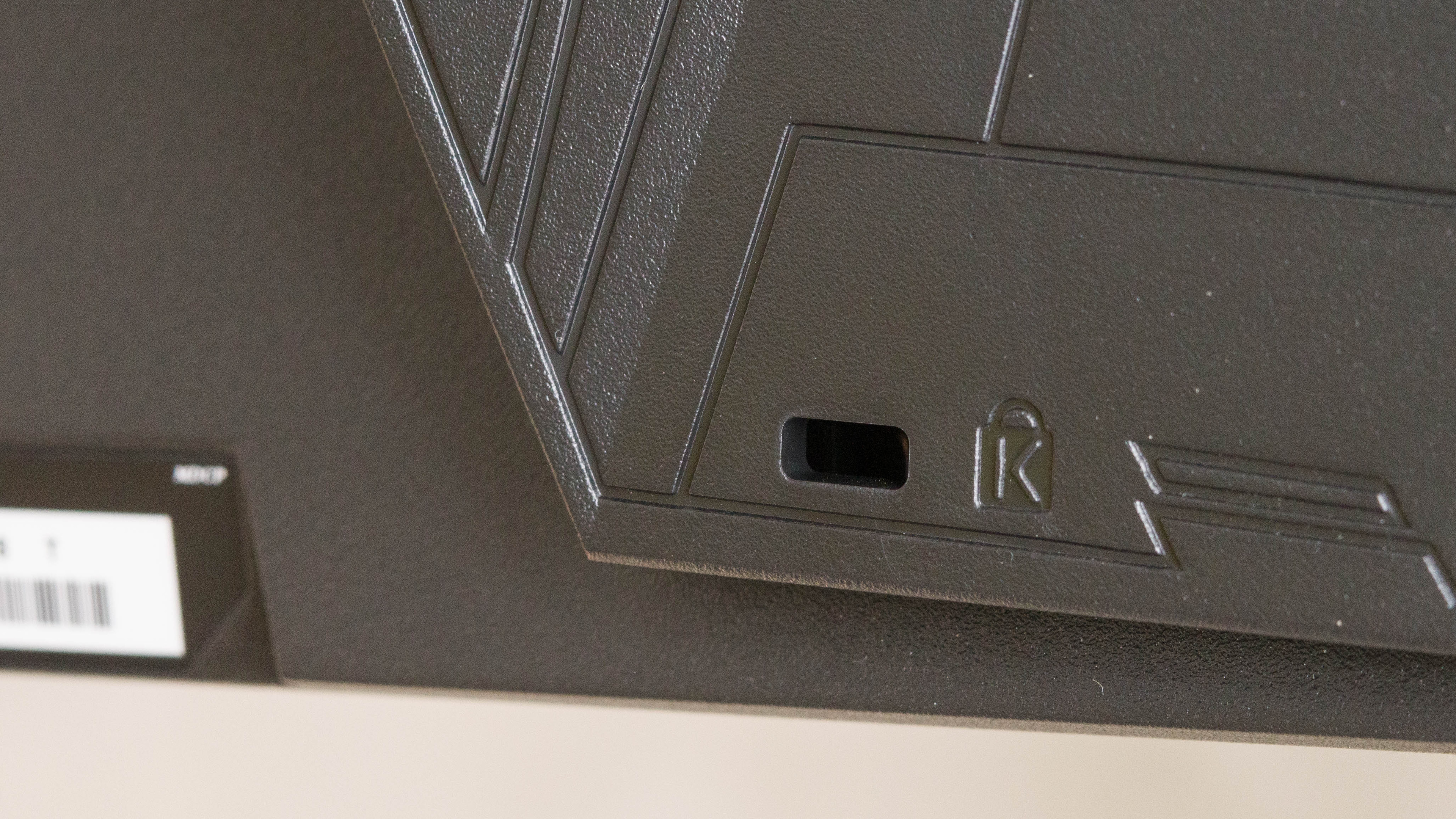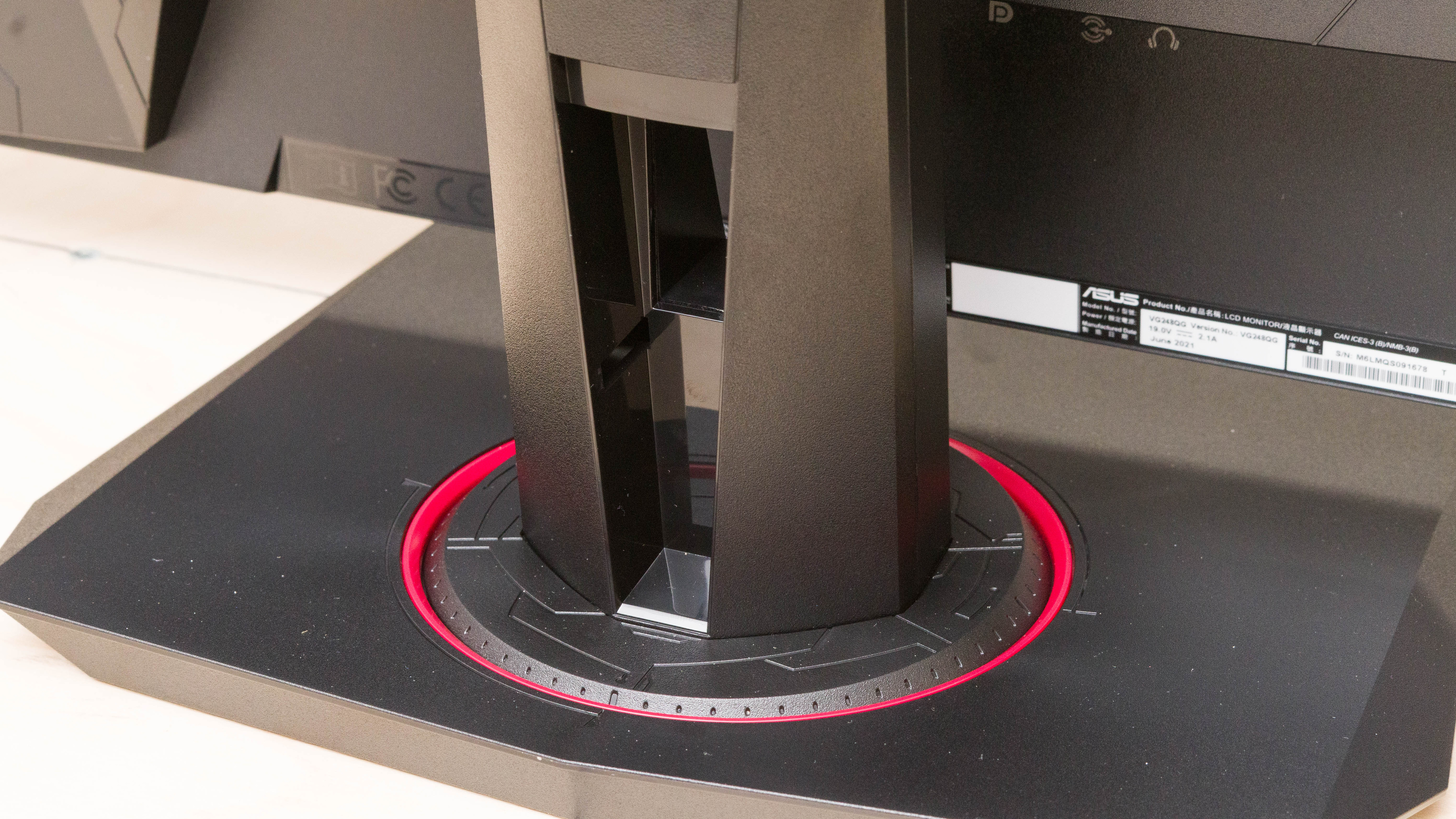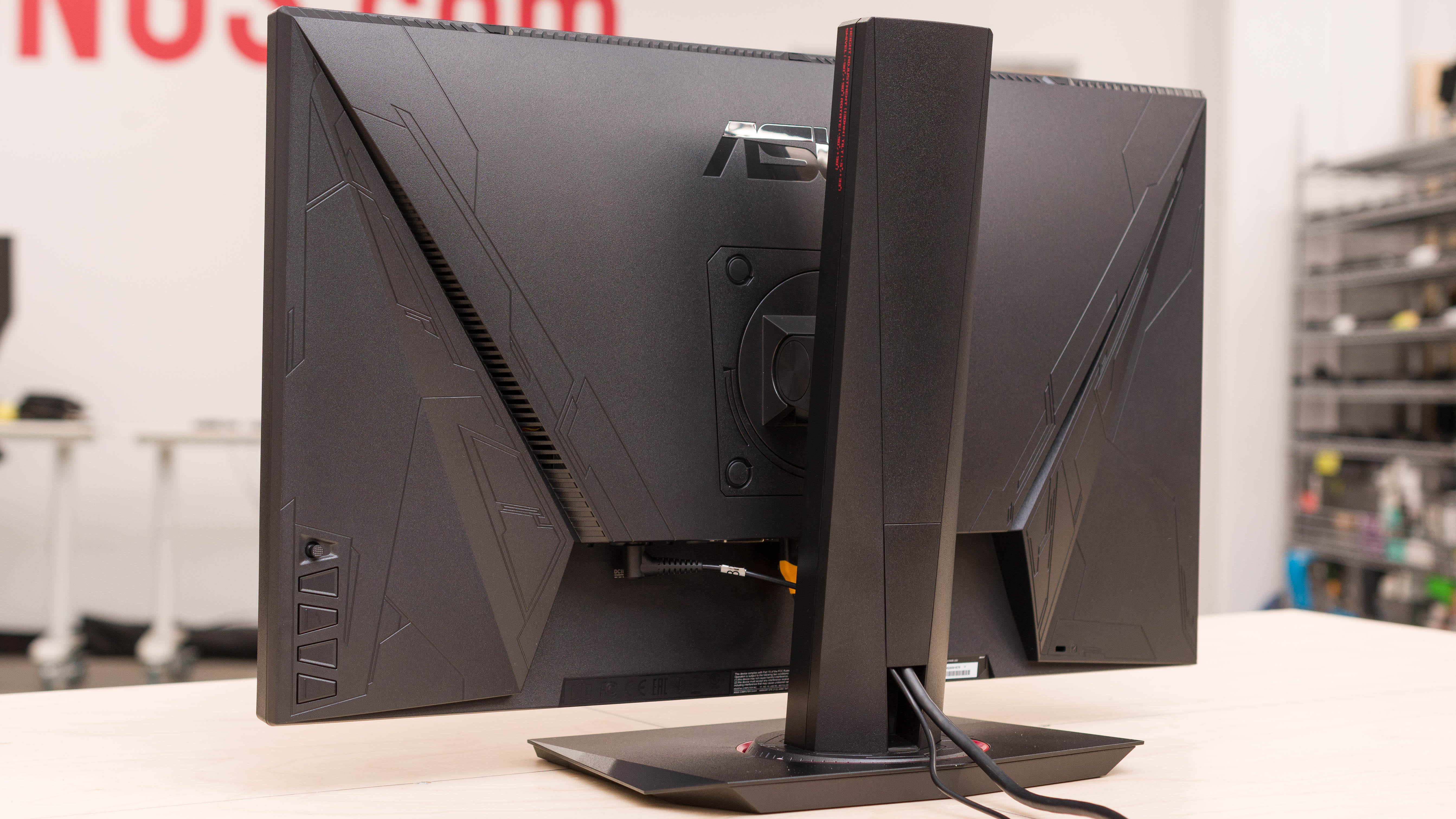 The back of the ASUS VG248QG is plastic with a few etched designs. There are vents on either side, and there's a Kensington lock on the right side of the back. There's also a cutout in the stand for cable management.