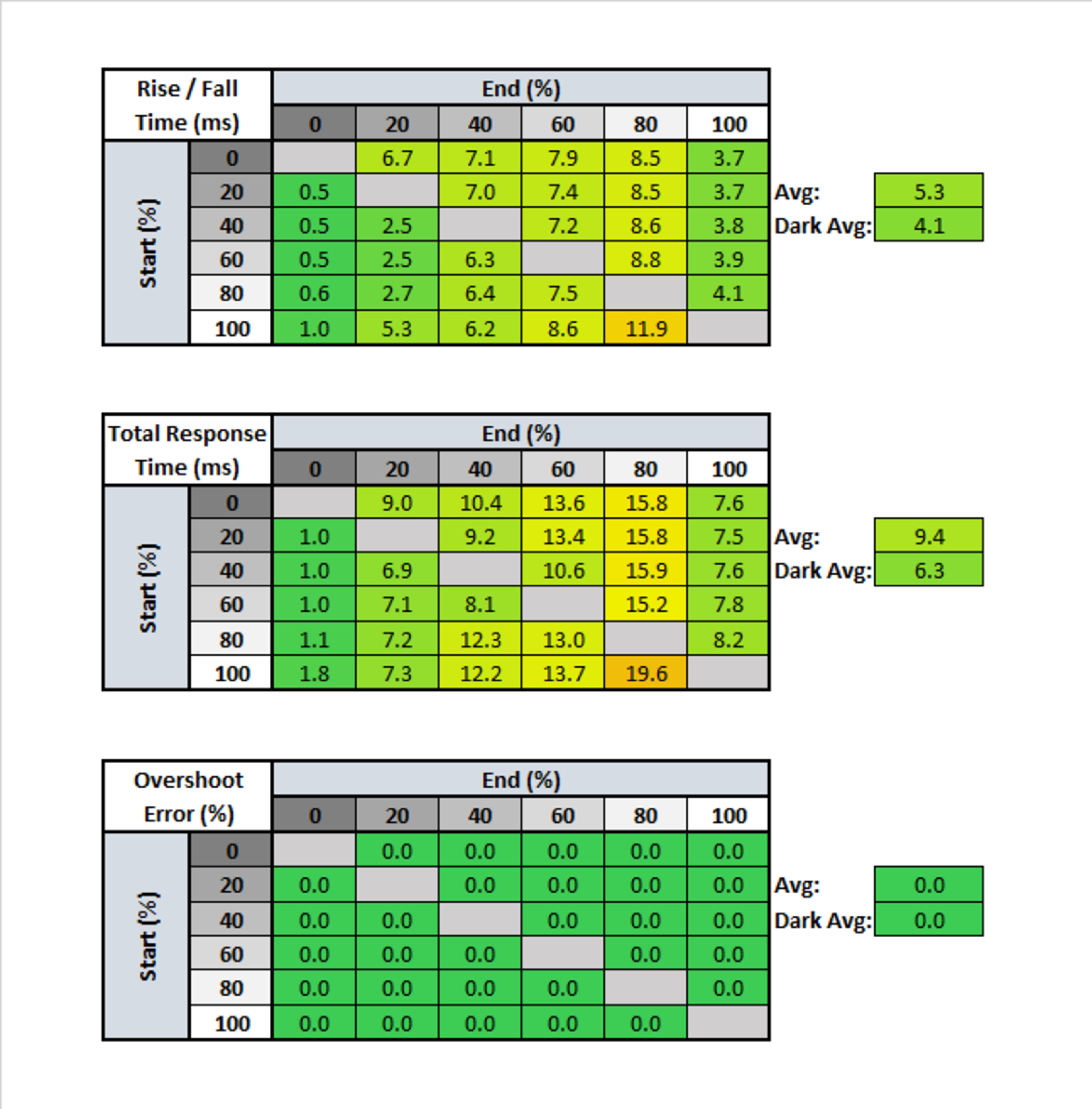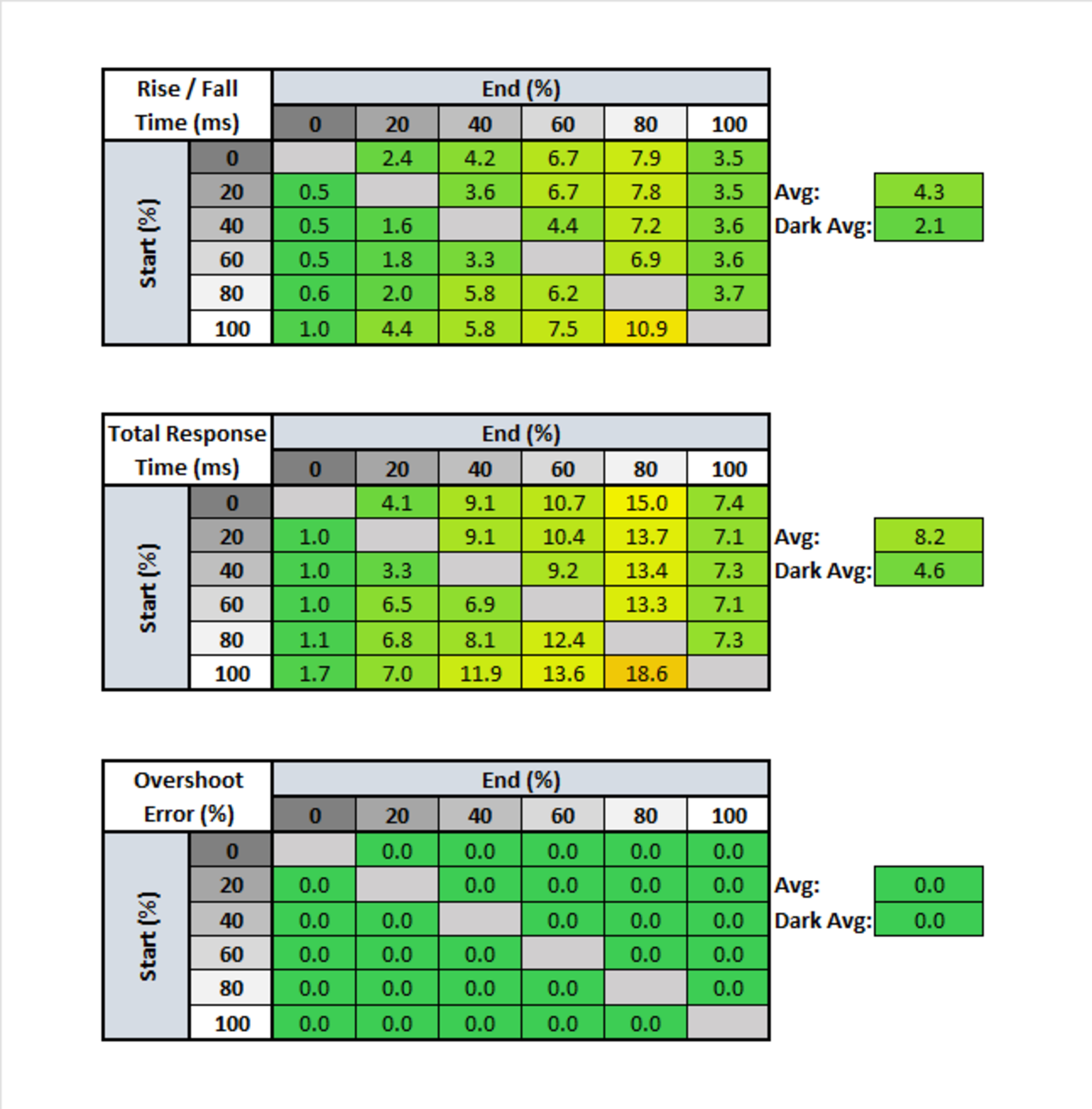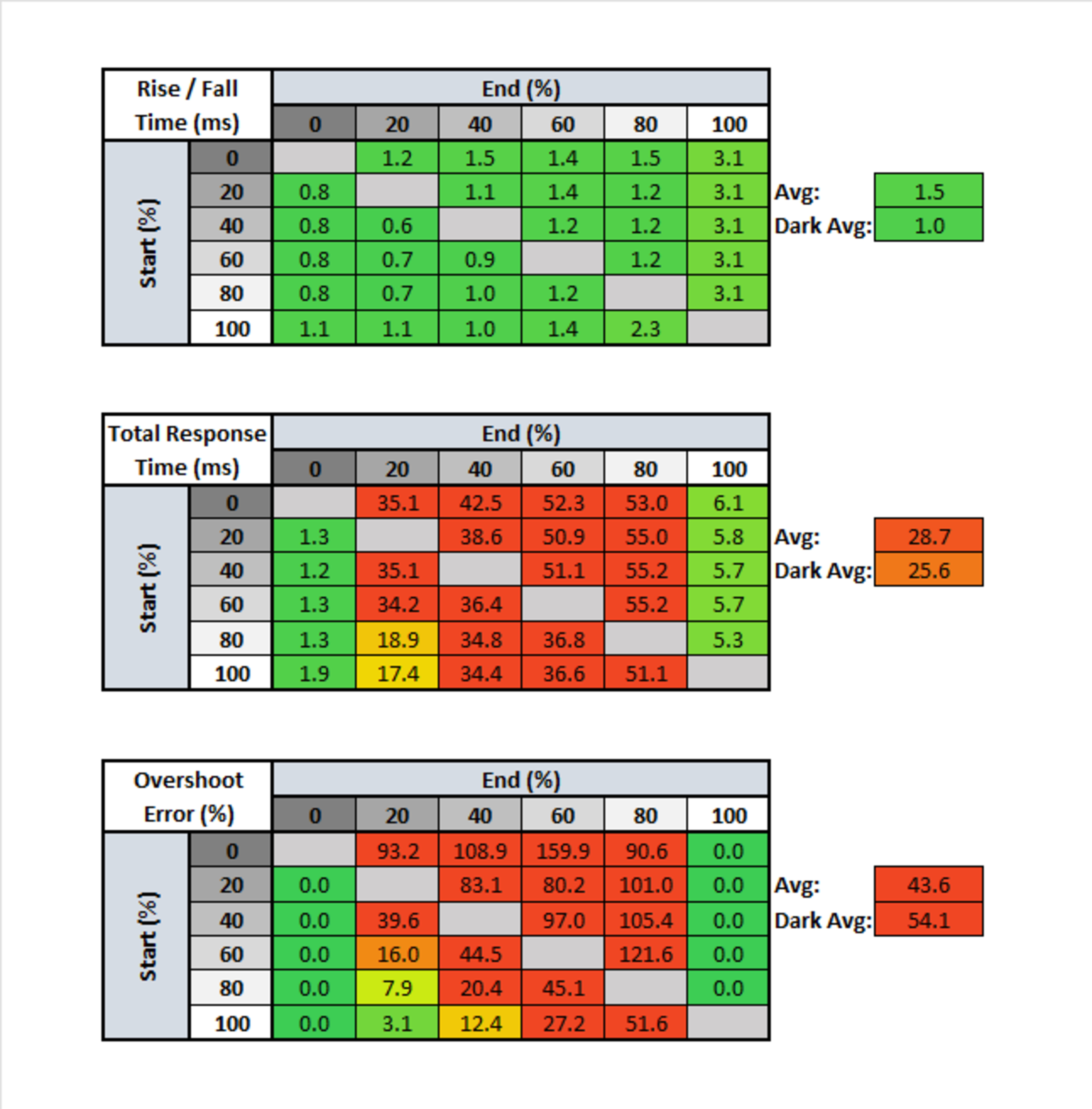 The response time at 60Hz is excellent, but there's more motion blur than at its max refresh rate. The overdrive settings perform strangely here; the '40' setting has the quickest total response time out of them all, as '60', '80', and '100' have an even slower total response time, but with a quicker rise/fall time and more overshoot, leading to inverse ghosting. The '40' setting has overshoot too, so if that bothers you, you can use '20', but that means you'll have to change the overdrive setting if the frame rate of your game drops.