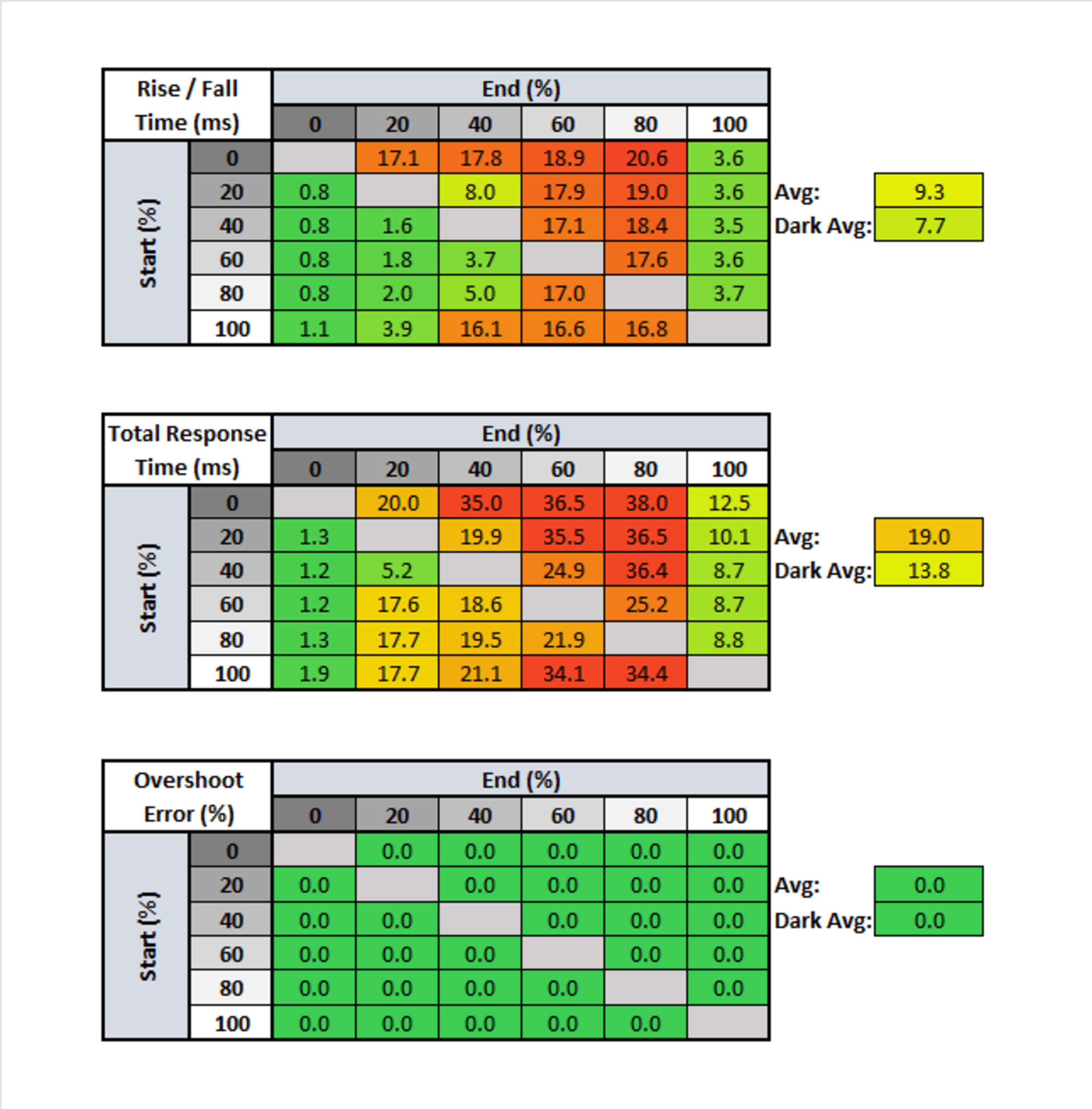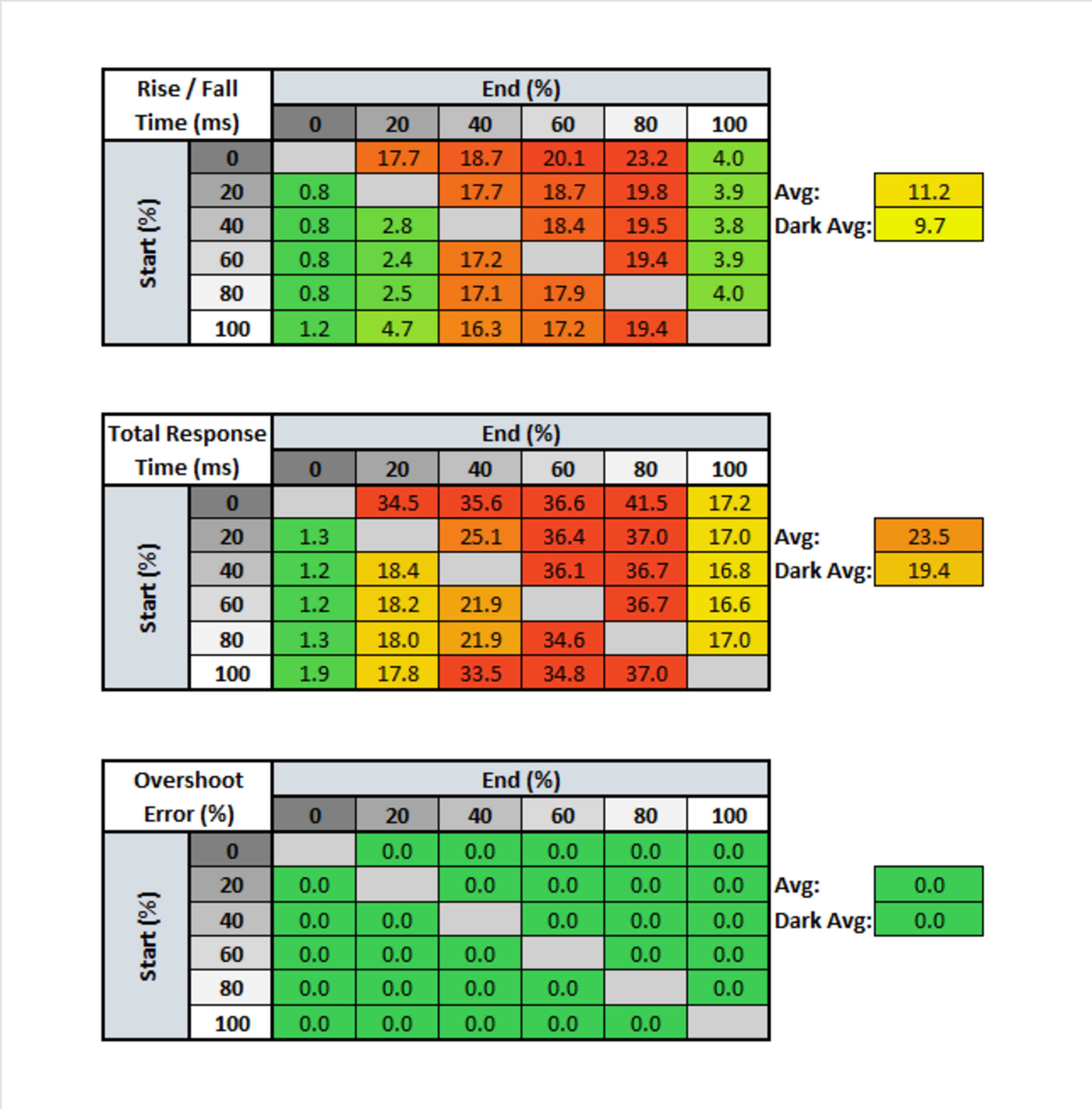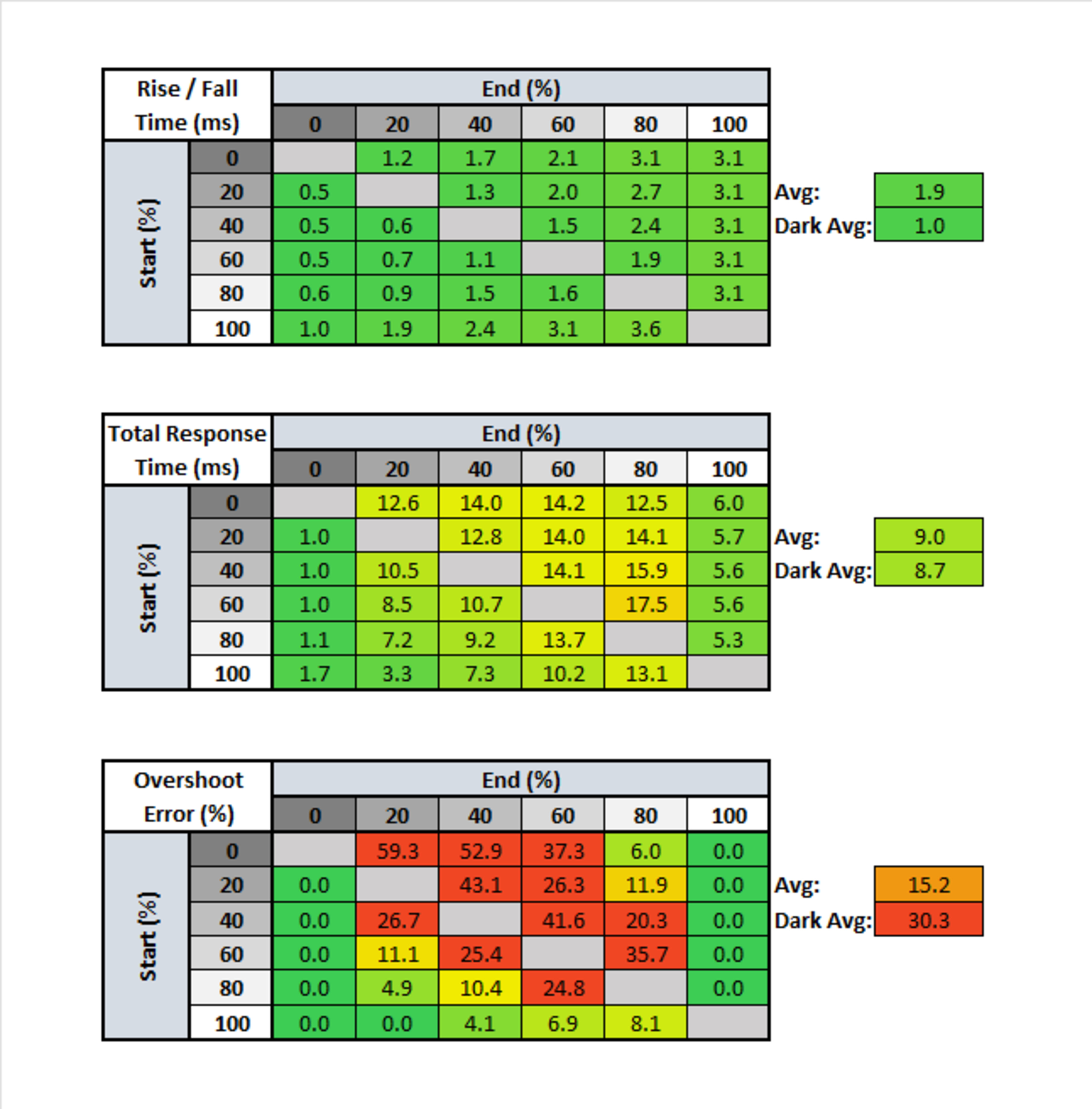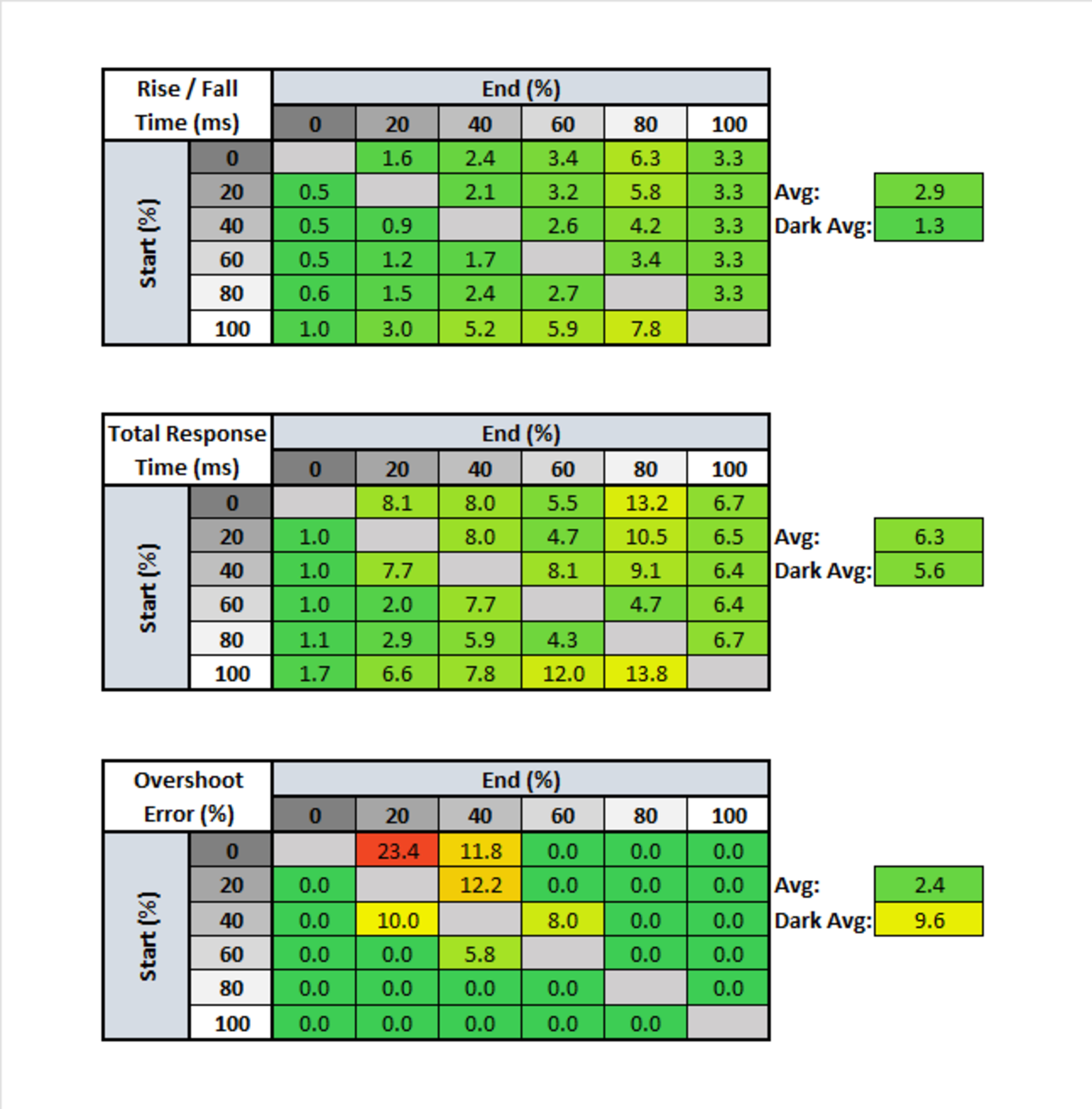 The response time at 60Hz is excellent, but there's more motion blur than at its max refresh rate. The overdrive settings perform strangely here; the '40' setting has the quickest total response time out of them all, as '60', '80', and '100' have an even slower total response time, but with a quicker rise/fall time and more overshoot, leading to inverse ghosting. The '40' setting has overshoot too, so if that bothers you, you can use '20', but that means you'll have to change the overdrive setting if the frame rate of your game drops.